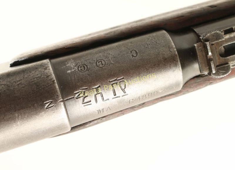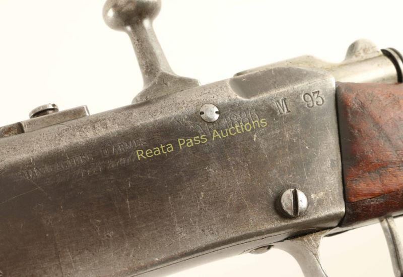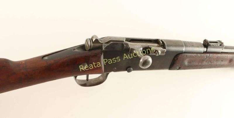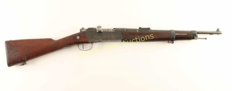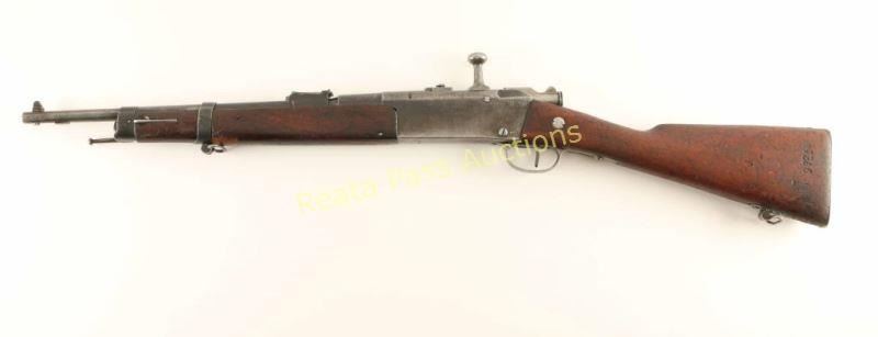 French military bolt action service rifle chambered in 8x50Rmm, produced at the Chatellerault arsenal and dated 1890. Imported by C.A.I. of St. Albans V.T. with import marks on the barrel. Features a blued finish, 17.7" barrel with bayonet lugs, wide patridge front sight, graduated rear sight to 2,000 meters, 3 round tube magazine, straight bolt handle, sling swivels, two barrel bands, magazine cut off switch, smooth hard wood forend and straight grip shoulder stock with metal buttplate. Serial numbers match on the stock, receiver, barrel, bolt and floorplate. The rifle has unidentified middle eastern characters stamped and carved into the barrel. Rifle retains approximately 50% finish overall showing moderate/heavy wear from use. Action is smooth, bore is excellent and wood stocks are good showing old repairs & several small blemishes. Condition is very good. ***Antique Firearm***
