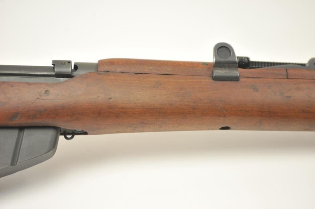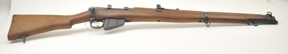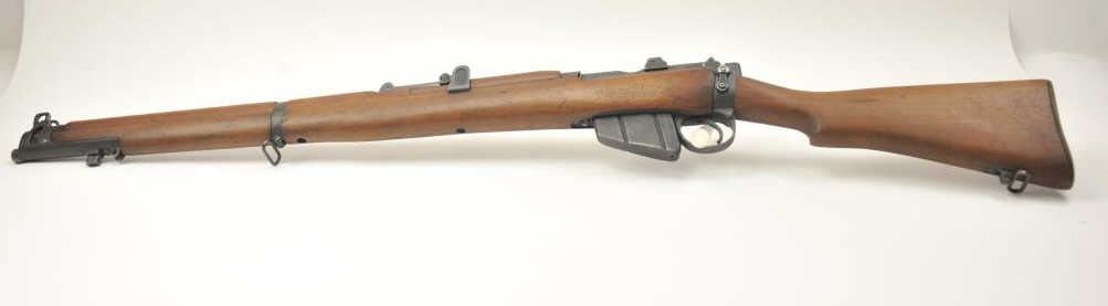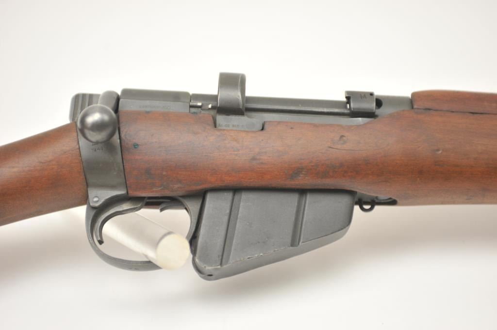 Lee-Enfield SMLE MK III bolt action rifle, .303 British caliber, Serial #27618. The rifle is in fine overall condition with a 25” barrel with a protected blade front and military tangent style rear sights. TheLithgow Arsenal rifle retains nearly all of the military finish with British and Australian proofs and acceptance marks. The wrist strap is dated 1945 and marked Lithgow. The right rear of the receiver is marked,“AUSTRALIA .303”. The smooth wood stock is in good condition with cartouches in front of and behind the trigger guard. Additionally, the right side of the butt stock is dated 5/47. The rifle has sling swivels and abrass butt plate. The bore is bright, the action functions well and the markings are crisp on this WWII era SMLE. Est.: $250-$500. (C+R).