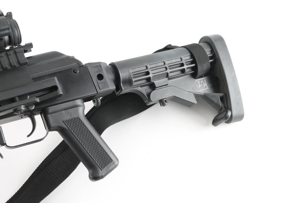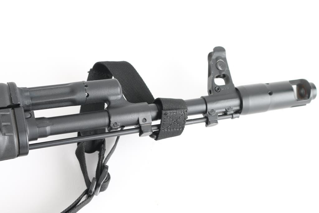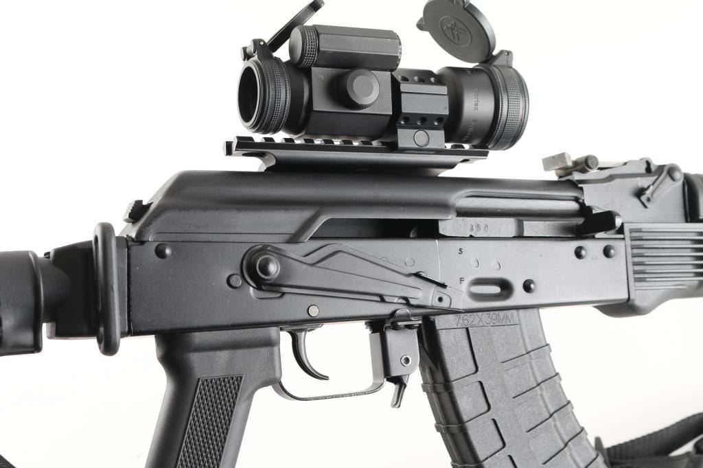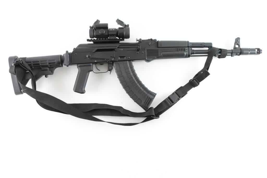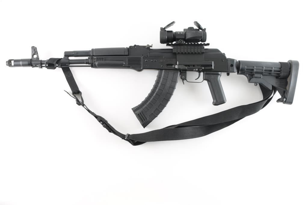 Izhevsk Russia made semiautomatic rifle imported by Arsenal of Las Vegas NV. AK47/AKM Kalashnikov operating system, with standard trigger & trigger guard, pistol grip. Features matte black finish, black polymer furniture, 16" hard chrome lined barrel, threaded muzzle brake held by detent, cleaning rod, bayonet lug, fully adjustable protected post front sight, tangent rear sight, manual safety, collapsing adjustable length stock with rubber butt pad. Left side of receiver has optic dovetail rail & mount, mounting a Vortex Strikefire red dot optic (battery dead, not tested). Bore is pristine. Overall condition is like new with few handling marks. Includes black nylon sling, green nylon magazine pouch (holds up to six mags), four 30-rd magazines, mag loader tool. Condition is NRA Excellent - like new *** Modern Firearm ***