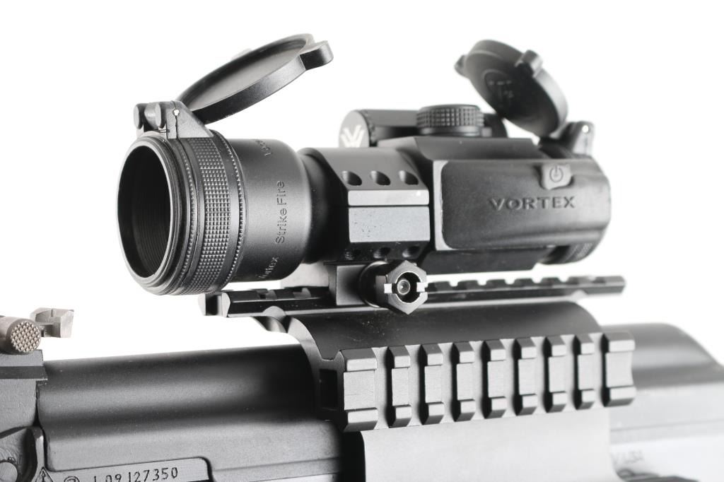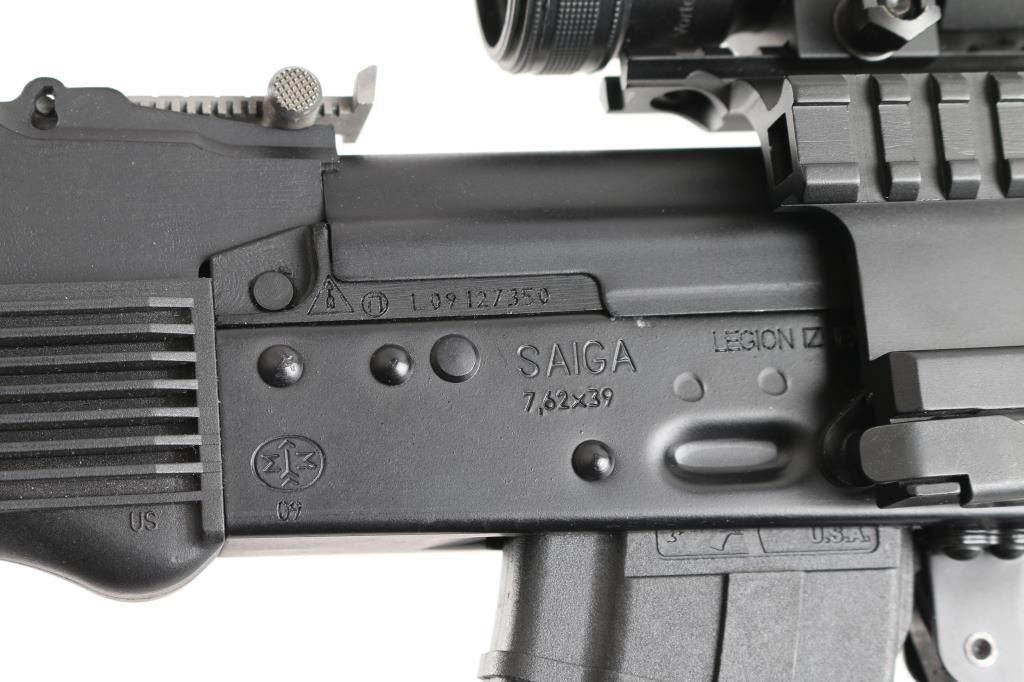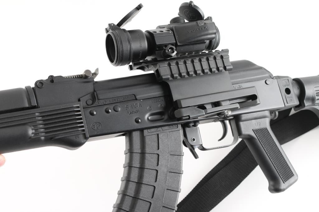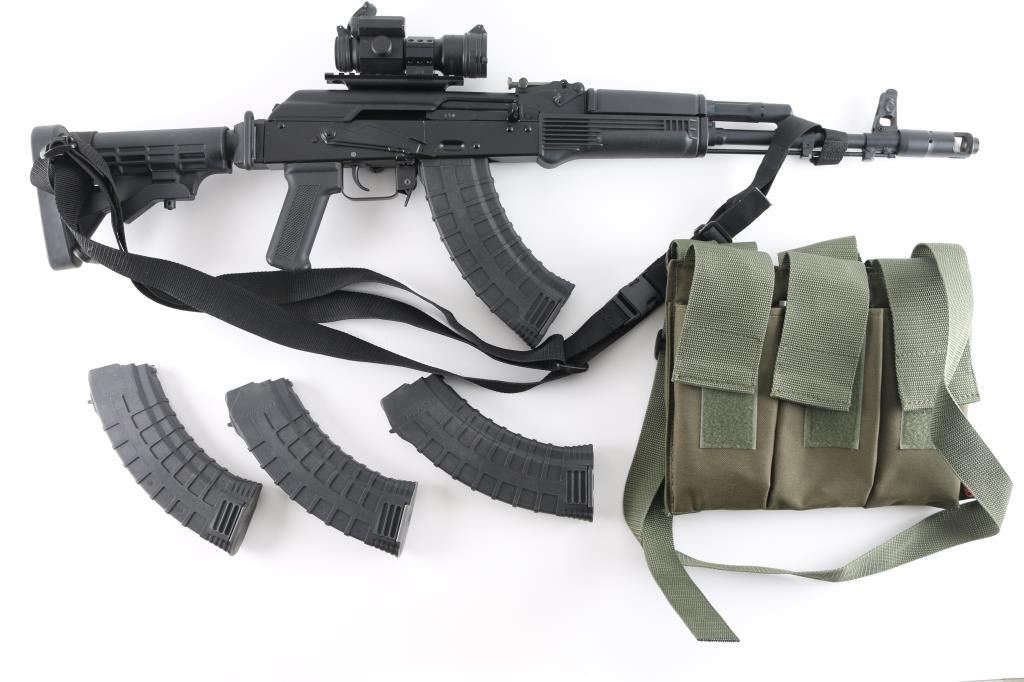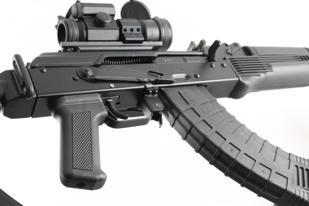 Izhevsk Russia made semiautomatic rifle imported by Arsenal of Las Vegas NV. AK47/AKM Kalashnikov operating system, with standard trigger & trigger guard, pistol grip. Features matte black finish, black polymer furniture, 16" hard chrome lined barrel, threaded muzzle brake held by detent, cleaning rod, bayonet lug, fully adjustable protected post front sight, tangent rear sight, manual safety, collapsing adjustable length stock with rubber butt pad. Left side of receiver has optic dovetail rail & mount, mounting a Vortex Strikefire red dot optic (battery dead, not tested). Bore is pristine. Overall condition is like new with few handling marks. Includes black nylon sling, green nylon magazine pouch (holds up to six mags), four 30-rd magazines, mag loader tool. Condition is NRA Excellent - like new *** Modern Firearm ***
