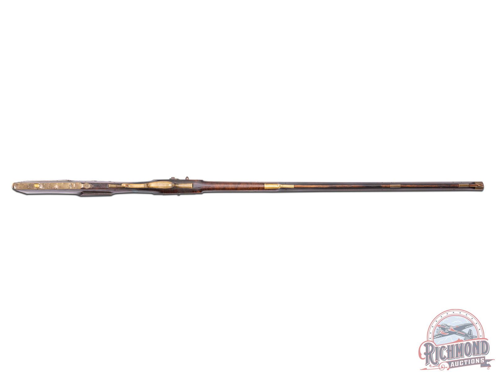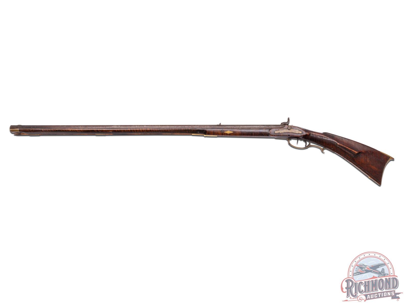 Unique percussion Kentucky rifle attributed to the Lehigh County area of PA., circa 1840. Rifle measures 51" overall with 35-1/2" octagon 38 caliber rifled barrel with rifle sights and typical Lehigh "Double Lines" in front and back of rear sight. Floral engraved percussion lock with double set trigger control. Full curly maple stock with brass hardware including a four piece patchbox with floral engraved lid, bone toe plate release button and unique "Liberty Cap" or "Indian" finial. Stock also has silver diamond inlay and two brass diamond forestock inlays. Comes with original hardwood ramrod, in poor condition. CALIBER: 38. FFL STATUS: Antique.