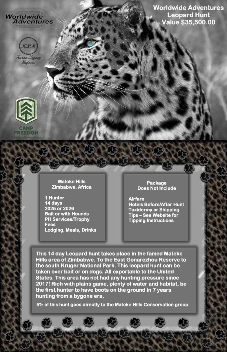 This 14 day Leopard hunt takes place in the famed Mateke Hills area of Zimbabwe. To the East Gonarezhou reserve to the south Kruger National Park. This leopard hunt can be taken over bait or on dogs. Rich with plains game, plenty of water and Habitat, be one of the first hunters to have