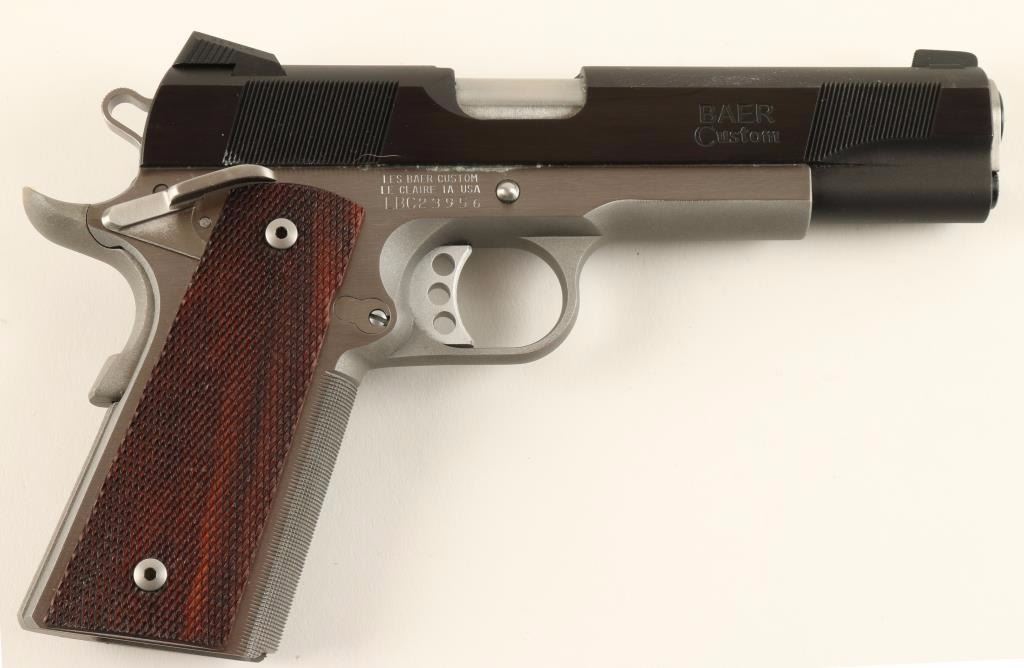 'Concept IV' High quality custom 1911-A1 style semi-automatic pistol chambered in .45 Automatic Colt Pistol. Features a 5" match grade barrel, blued slide with front & rear serrations, partridge front sight, low profile rear window sight, skeletonized hammer, serrated trigger, ambidextrous safety, beavertail grip safety, checkered grip frame, push bottom magazine release, 8 round magazine, and two- piece checkered premium wood grips. Includes original factory box with lock. Finish shows no signs of use or wear. Action is tight, bore is perfect, and grips are extra fine. Likely unfired since the factory. Condition is like new in box. ***Modern Firearm***