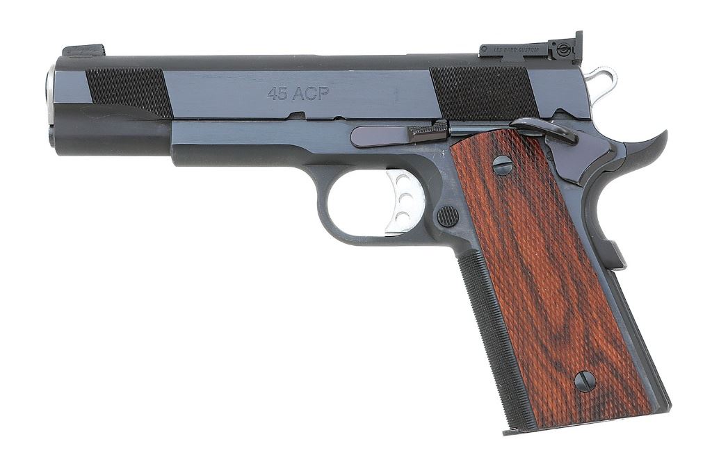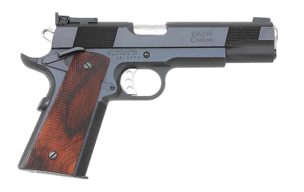 serial #LB20670, 45 ACP, 5'' barrel with a bright excellent bore. This is a remarkable Les Baer pistol, the metal surfaces retaining 99% plus original blue, the slide release and ambidextrous safety a rich plum. Special features of this pistol include national match frame, slide and barrel, tuned and polished extractor, polished feed ramp throated barrel, Baer deluxe Commander hammer and sear, Baer speed trigger, beavertail grip safety with pad and beveled magazine well. Baer dovetail front sight and low-mount adjustable rear sight. The premium checkered rosewood grips remain excellent and included is a cardboard box and single Colt Metalform magazine. An as-new Premier II pistol perfect for competition shooting. (5B11739-13) {MODERN} (2000/3000)