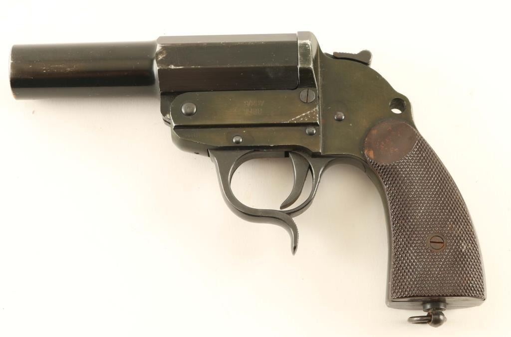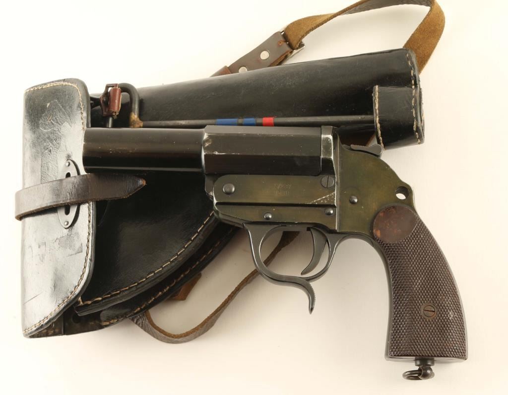 #5488 German flare launcher pistol features approx 6" barrel, single shot break open, single action trigger, lanyard ring in butt. Bore is good or better with some darkness from use. Retains 85% glossy black finish, with bare metal showing at edges and high spots. Brown bakelite grips are checkered, good to very good condition. Markings include "S/237", "1938", Waffenamts (including eagle over "26"). Includes good or better condition black leather holster with shoulder strap and cleaning rod. Condition is Very Good.