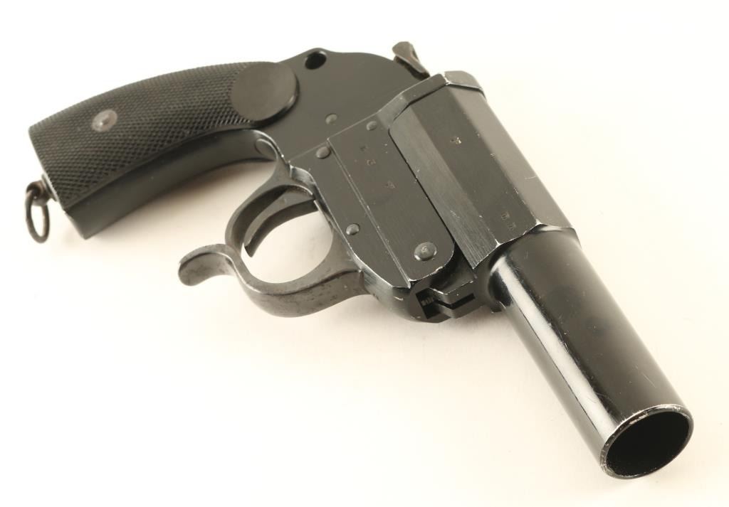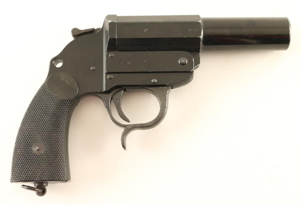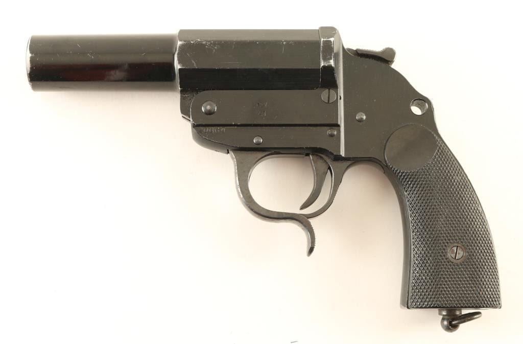 #20069 German flare launcher pistol features approx 6" barrel, single shot break open, single action trigger, lanyard ring in butt. Bore is good or better with some darkness from use. Retains 85% glossy black finish, with bare metal showing at edges and high spots. Black bakelite grips are checkered, good to very good condition. Markings include "ayf 41", Waffenamts (including eagle over "280"). Condition is Very Good.