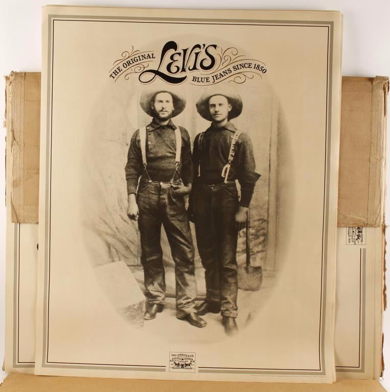 25 of one design which reads "The Original Levi's Blue Jeans Since 1850." Depicting 2 prospectors with hats, suspenders and boots. Levi's logo on the bottom. Measures 24 1/8"x30 1/4" 10 of another ad depicting a Levi riverboat chugging down the river with 'Levi landscape' and Mark Twain standing by a tree in the foreground. Measures 22"x28 1/2".