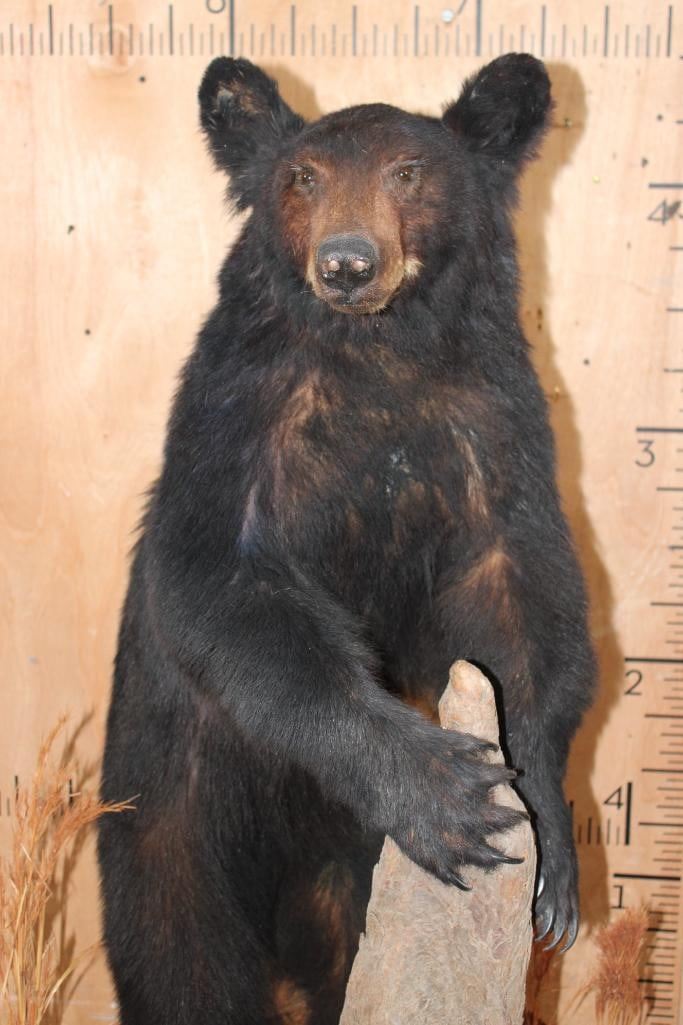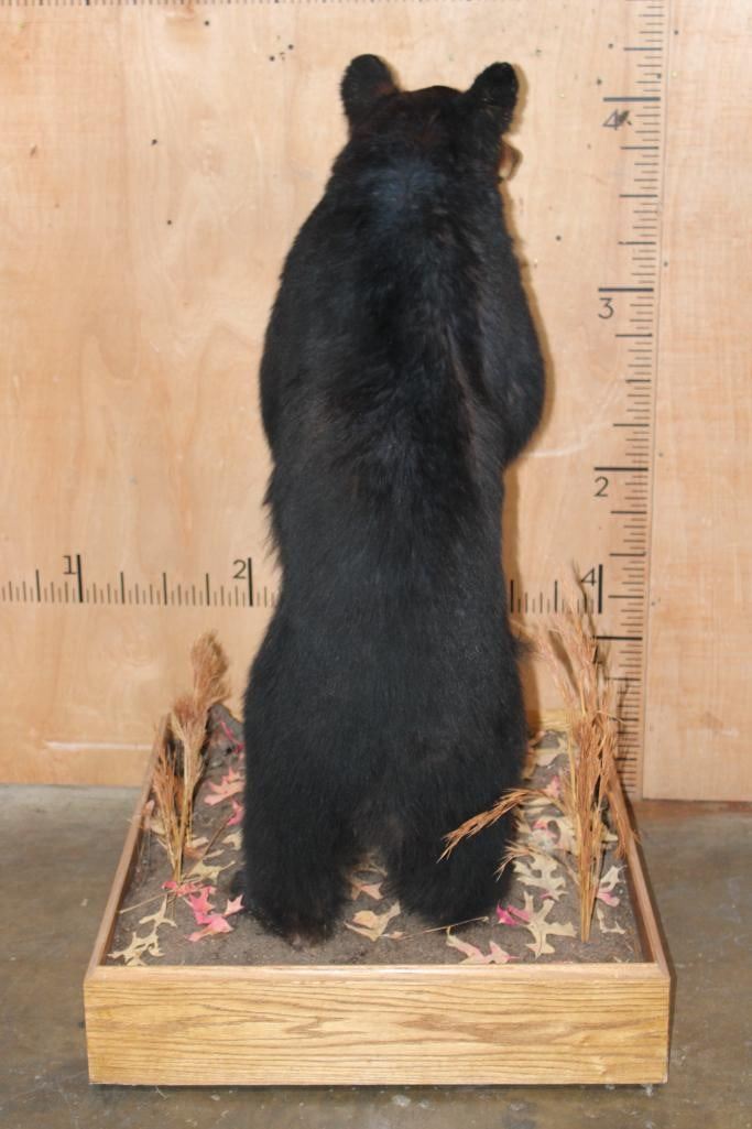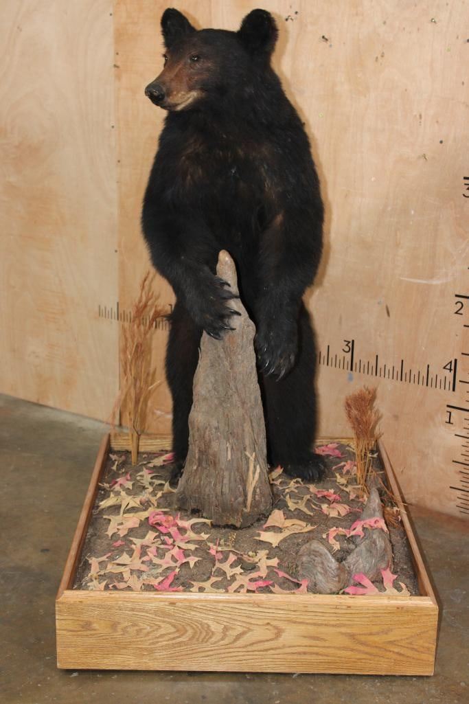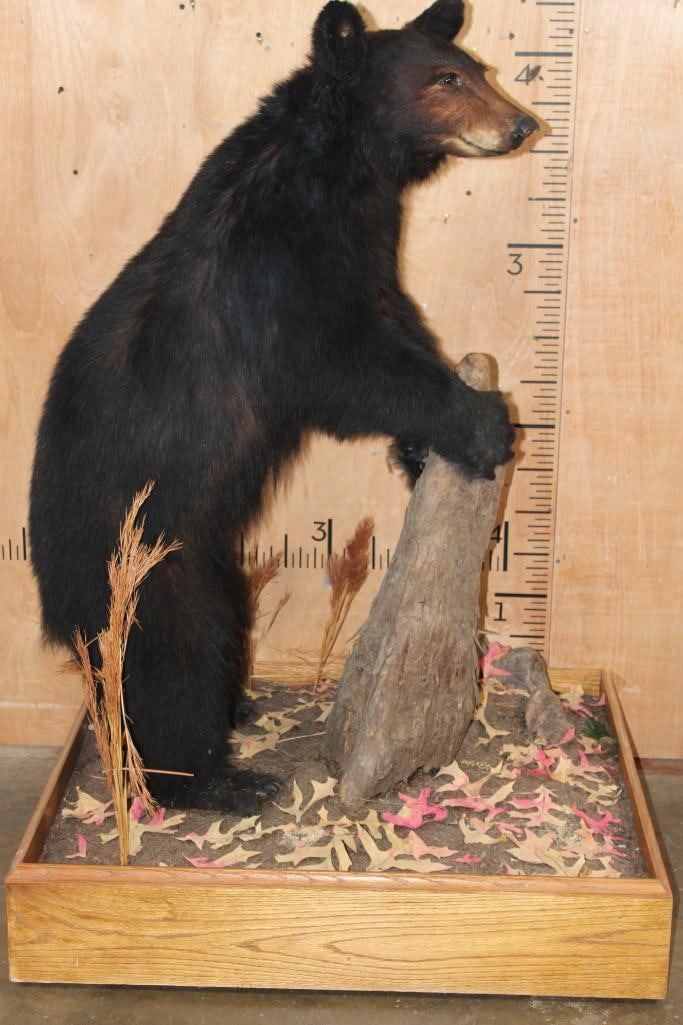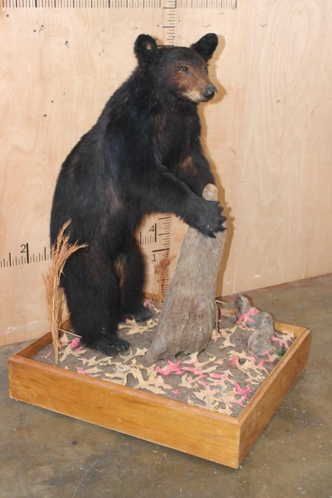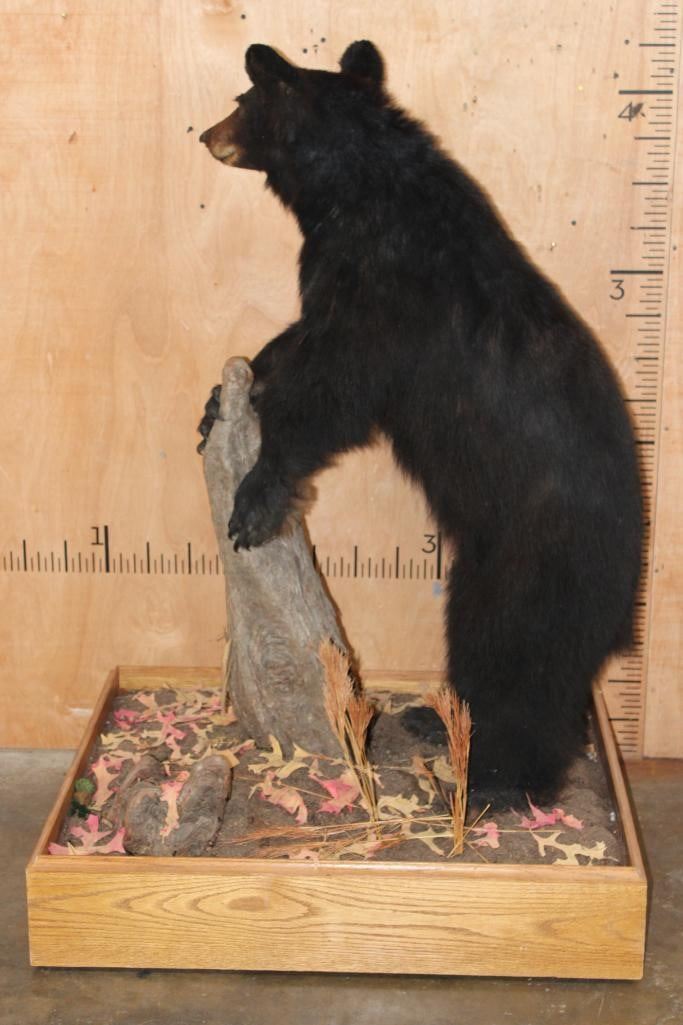 Life-sized BLACK BEAR on a Wood Base with Wheels. It was Taken in 1996 in the Cascade Mountains. It measures 52" Tall x 36" Long x 30" Wide. This is a Nice mount in Good Condition. TAXIDERMY