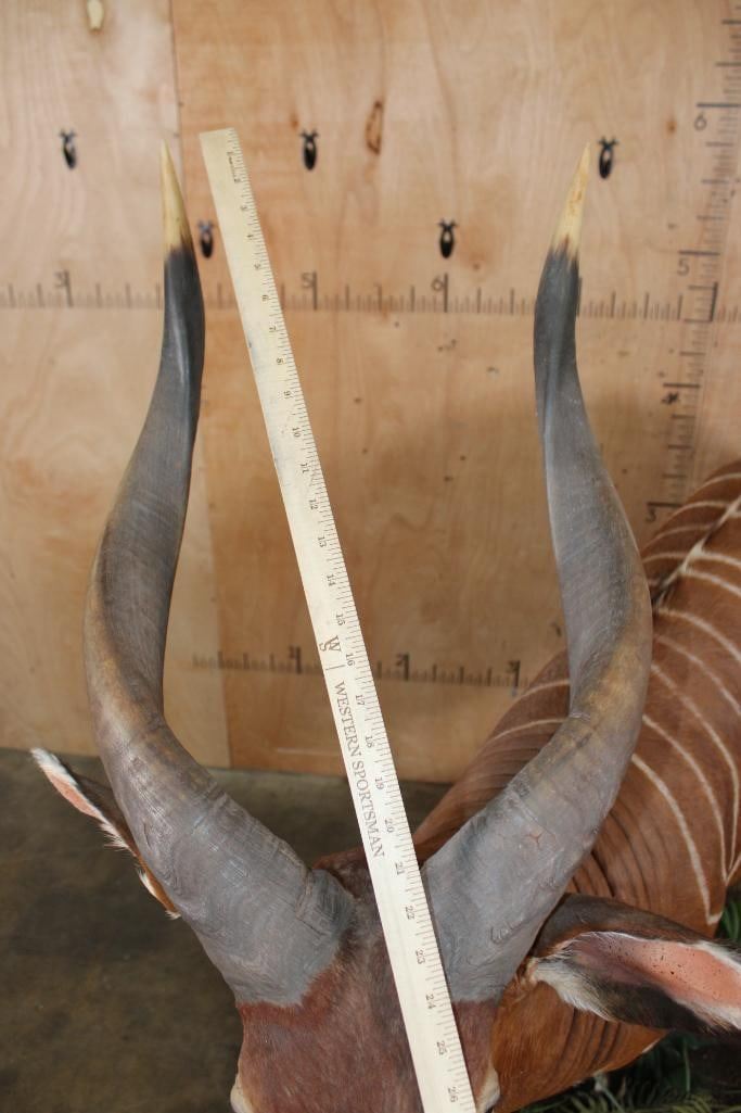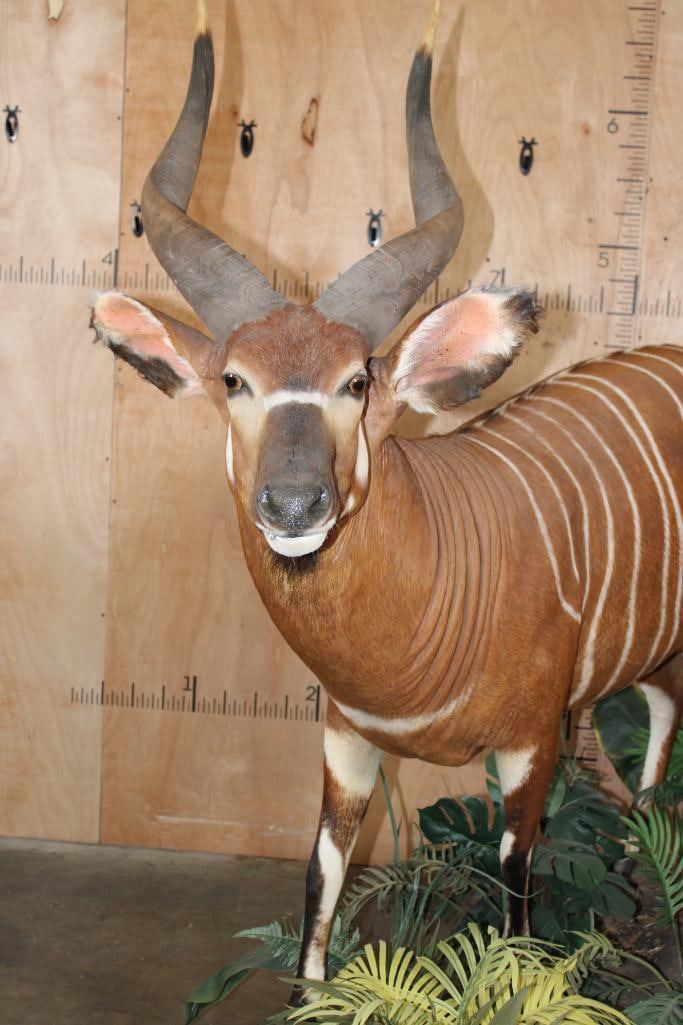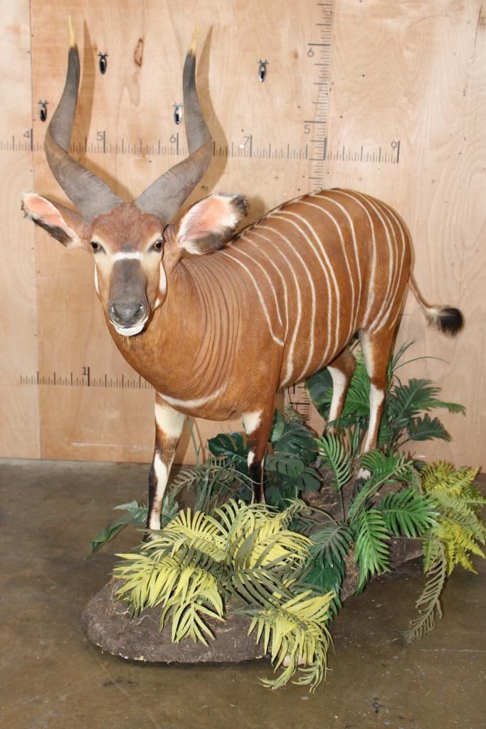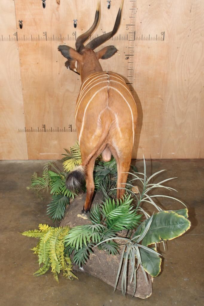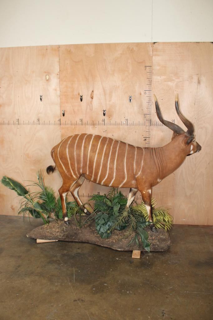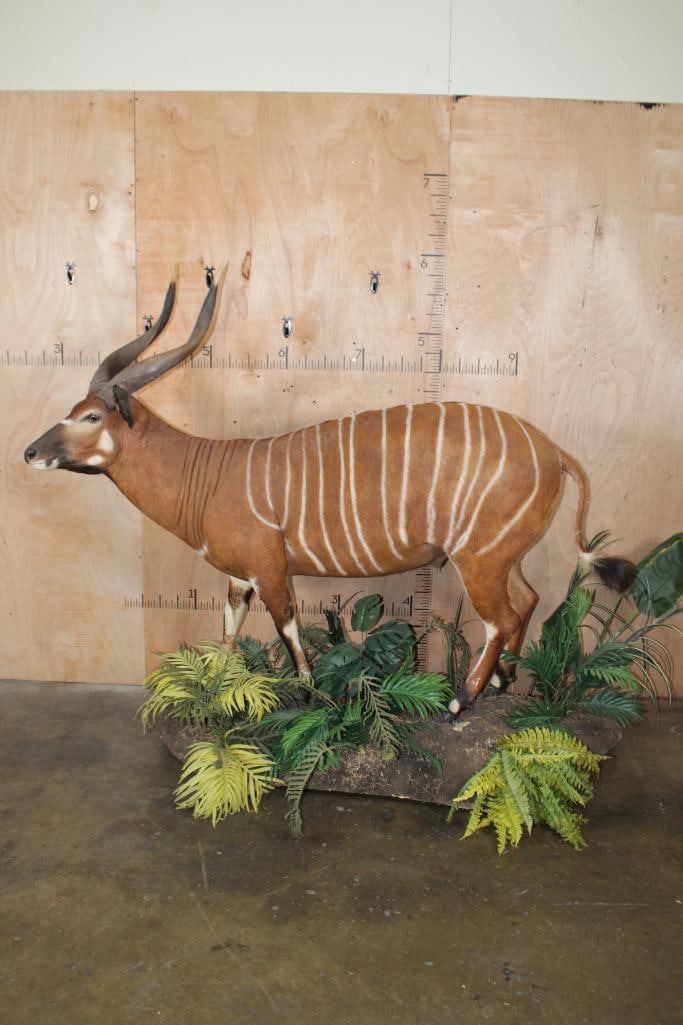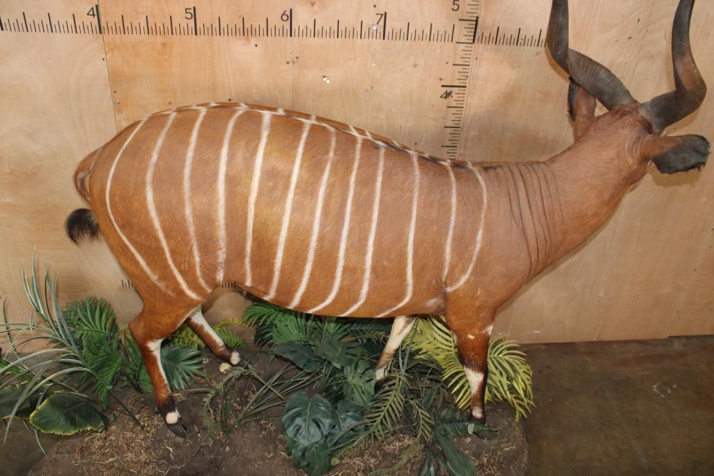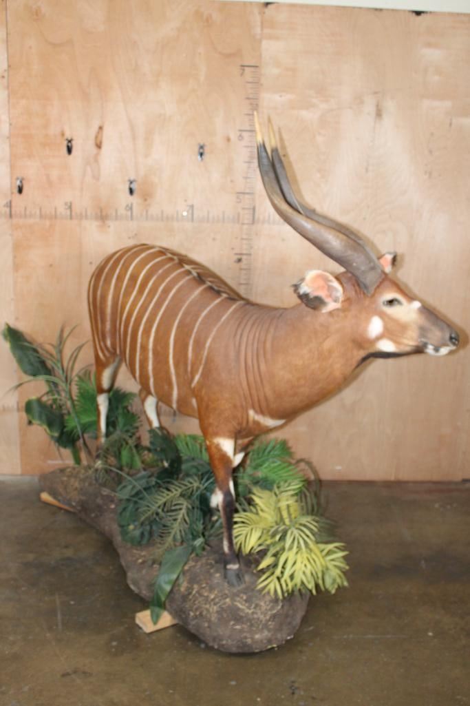Very Nice, Clean, and Newer Life-sized BONGO. The Left Horn measures 29.5" Long and the Right Horn measures 29" Long. It is displayed on a Lush Forest simulated Base with Wheels. The Total Mount measures 84" Long x 29" Wide x 70.5" Tall and is in Very Good Condition. TAXIDERMY