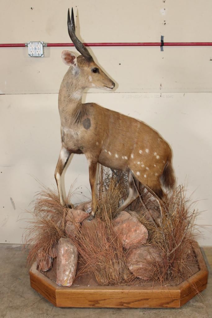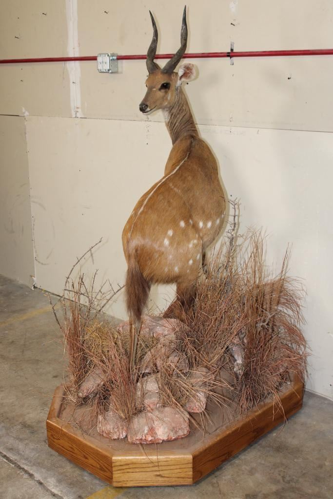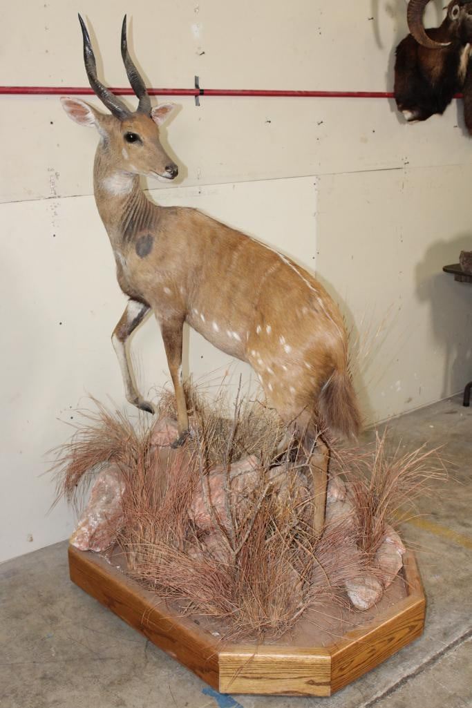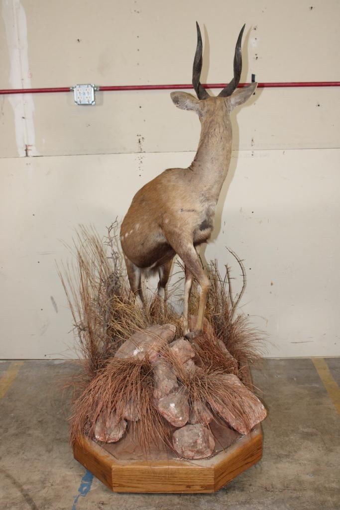 Life-sized BUSHBUCK on a decorative brush and grass Base with Wheels. The Left and Right Horn each measure 14" around the Spiral Ridge. The Total Mount measures 47" Long x 32" Wide x 70" Tall. The Left ear has damage and there are some hide rubs. TAXIDERMY