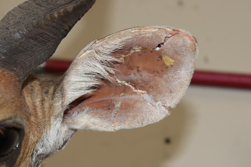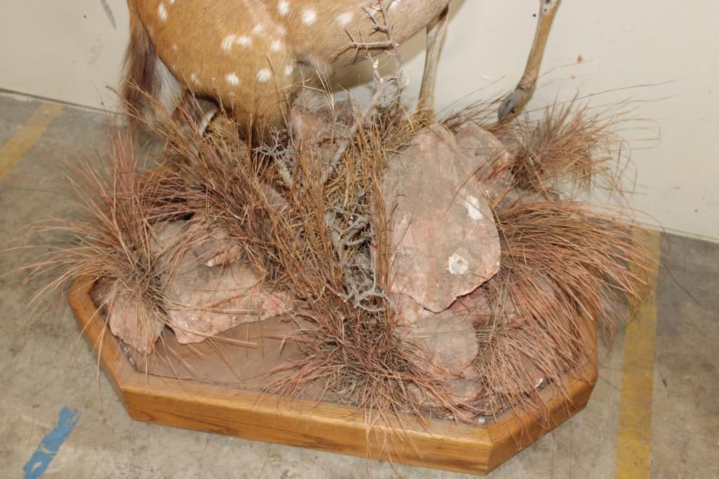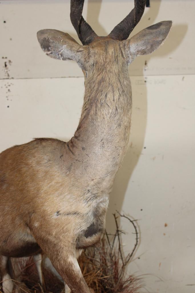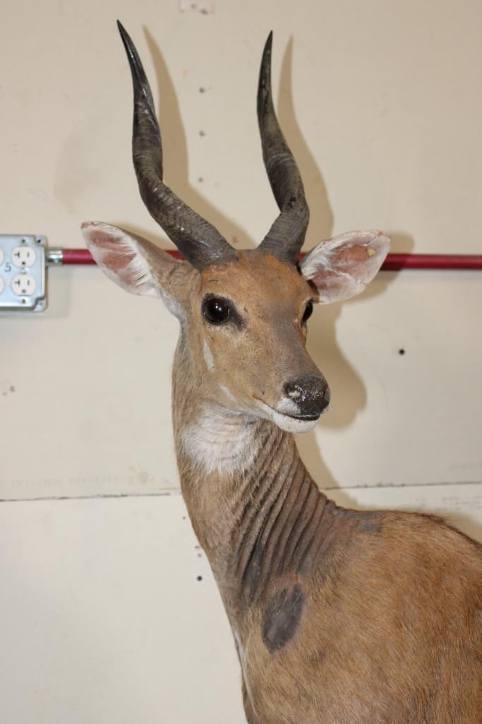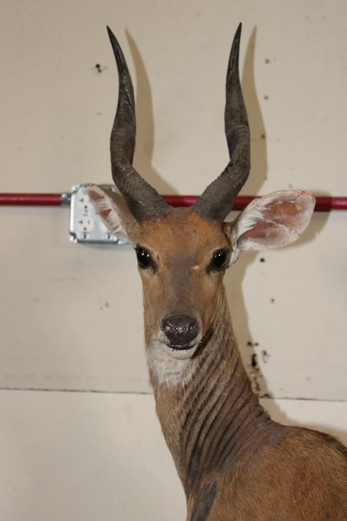 Life-sized BUSHBUCK on a decorative brush and grass Base with Wheels. The Left and Right Horn each measure 14" around the Spiral Ridge. The Total Mount measures 47" Long x 32" Wide x 70" Tall. The Left ear has damage and there are some hide rubs. TAXIDERMY