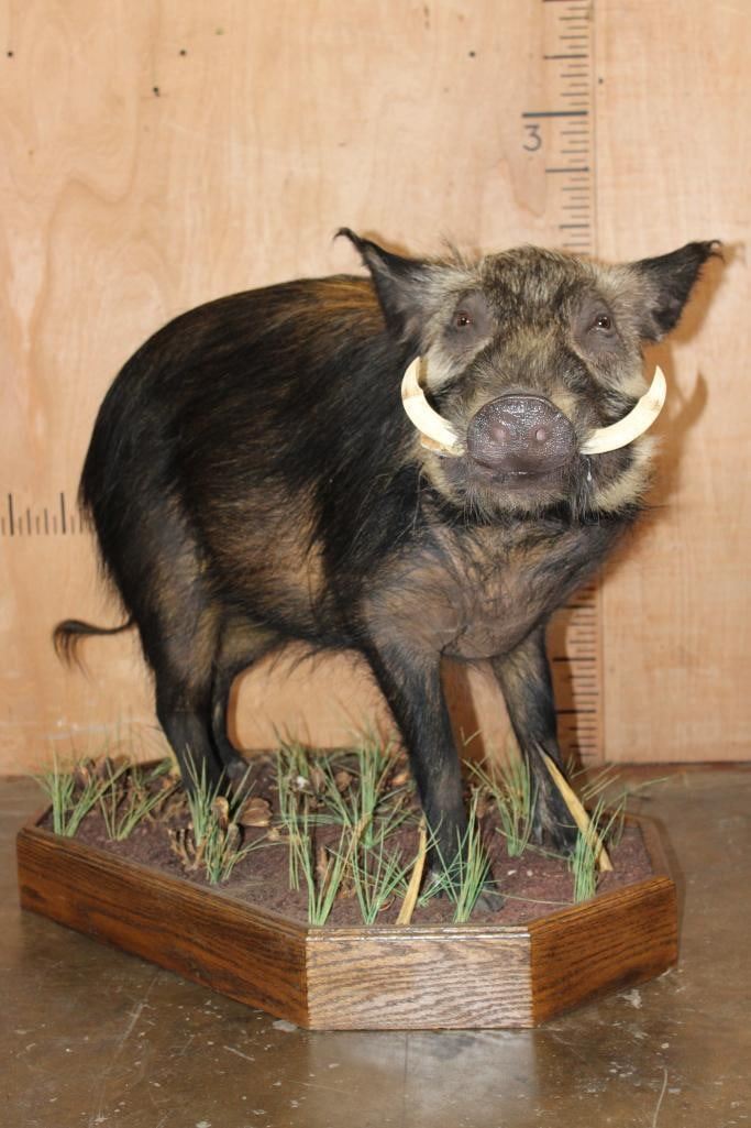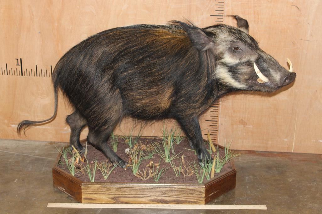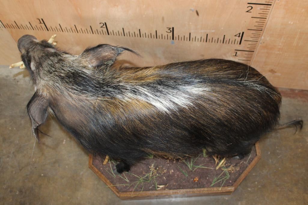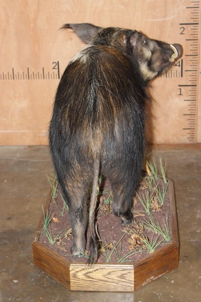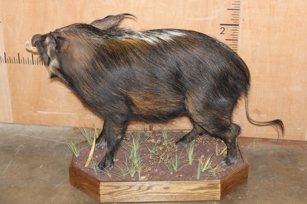 Very Nice and Clean Life-sized BUSHPIG on a decorative stationary Wood Base. The mount measures 45" Long x 21" Wide x 29" Tall and is in Very Good Condition. TAXIDERMY