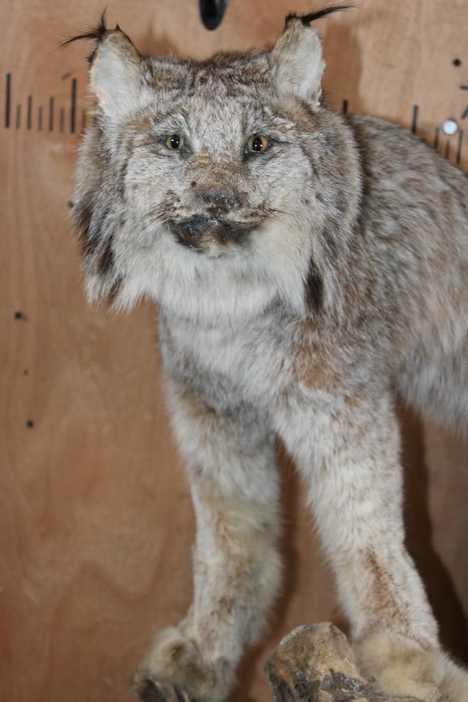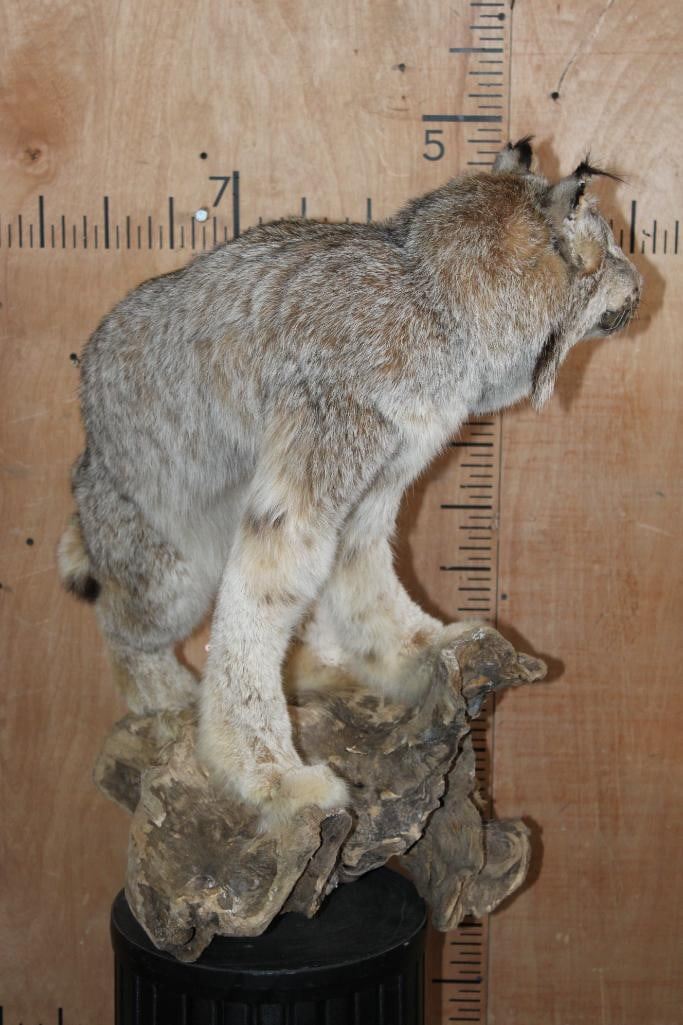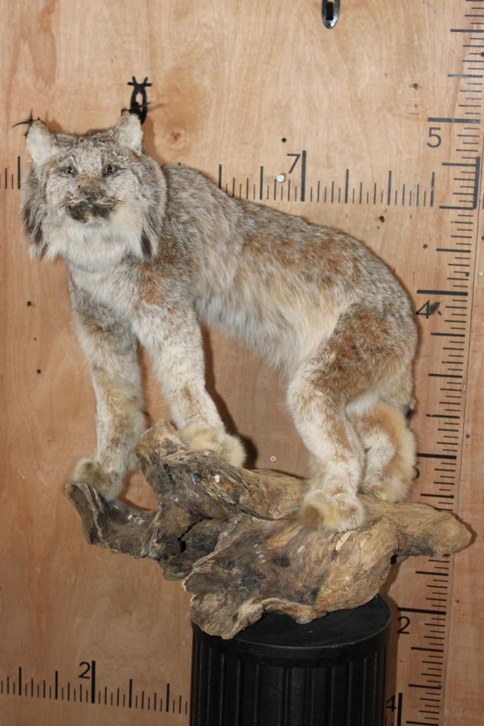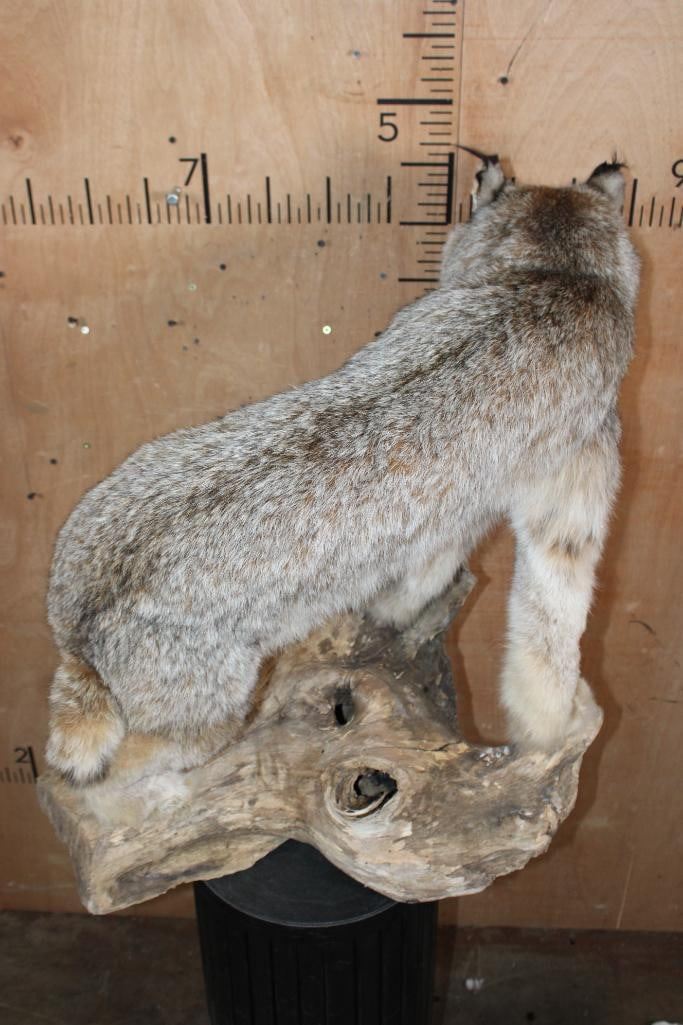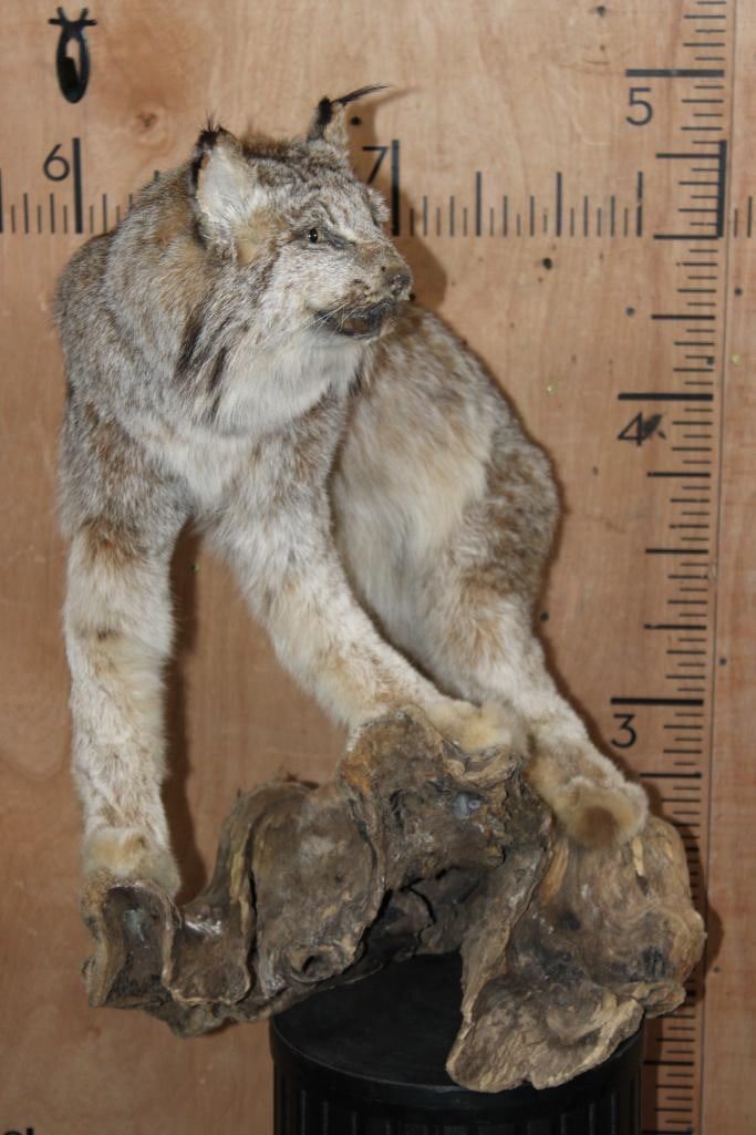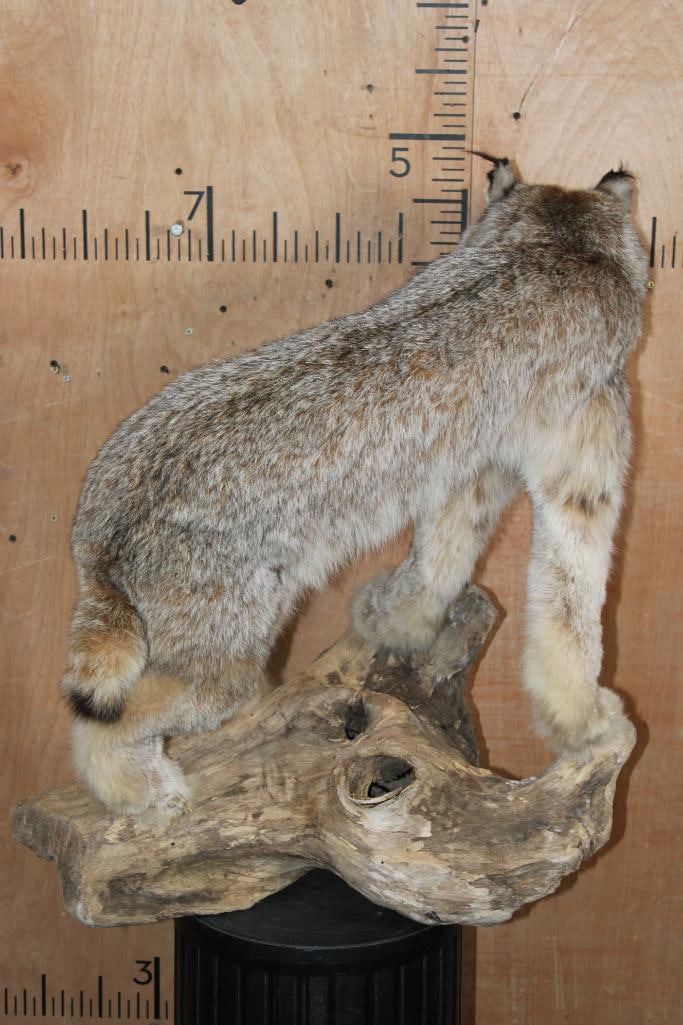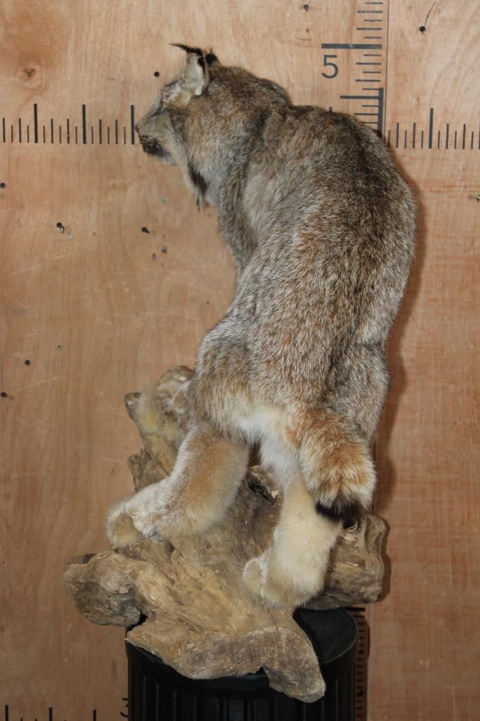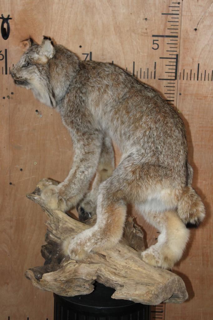 Nice Life-sized CANADIAN LYNX on a Decorative Driftwood Base. It measures 25.5" Long x 18.5" Wide x 31" Tall and is in Good Condition. TAXIDERMY