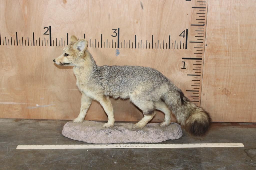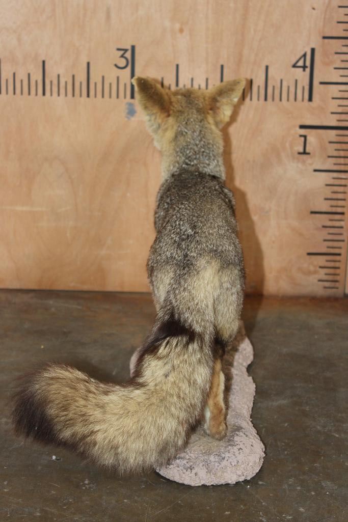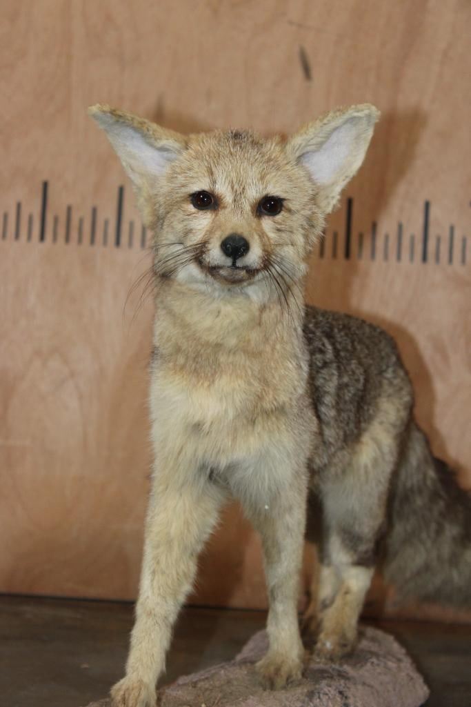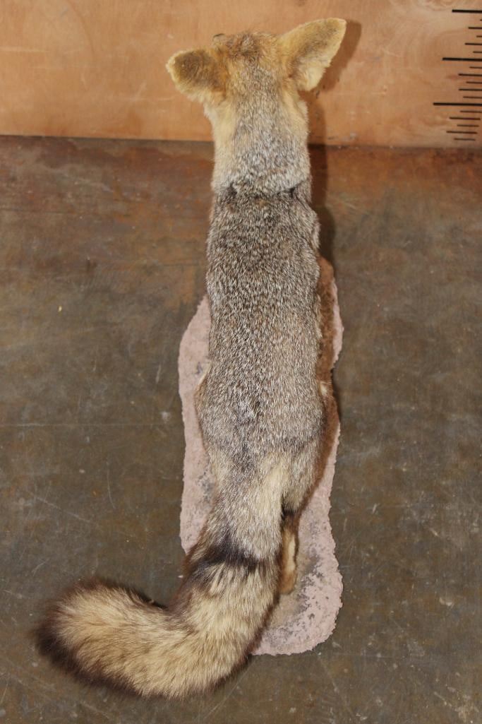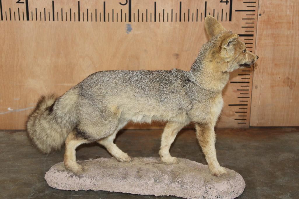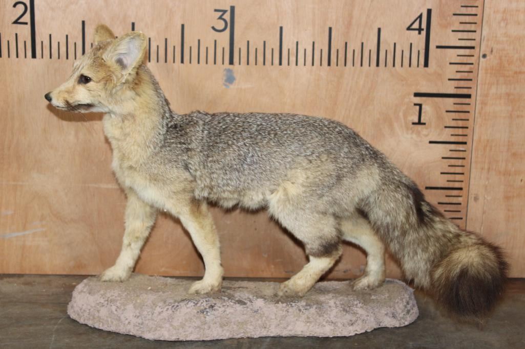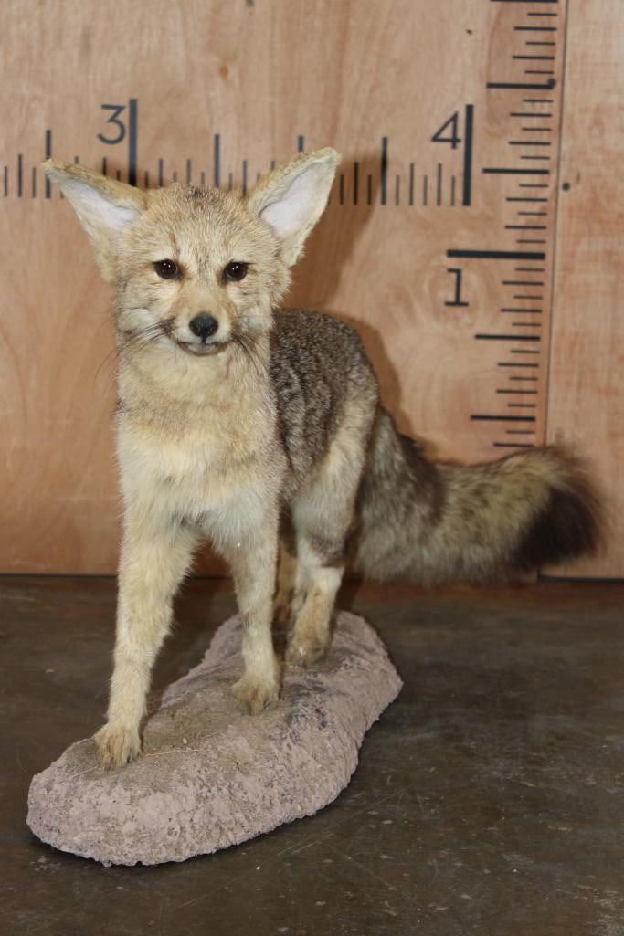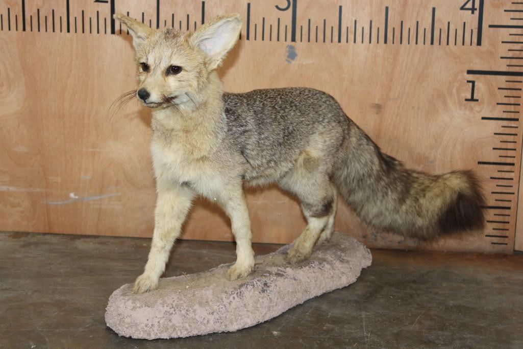 Very Nice Life-sized CAPE FOX (Vulpes chama) or Silver-Backed FOX. It is mounted on a reproduction habitat Base and measures 34" Long x 10" Wide x 17" Tall. The Cape Fox is also called the asse, cama fox or silver-backed fox. It is a small species of fox native to southern Africa. The only "true fox" occurring in sub-Saharan Africa. TAXIDERMY