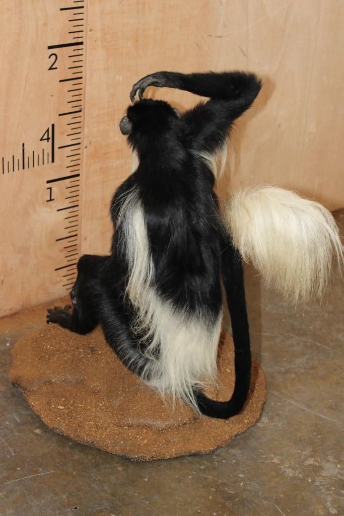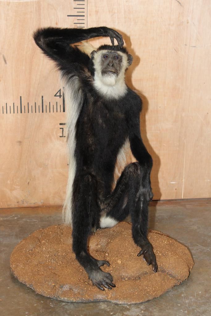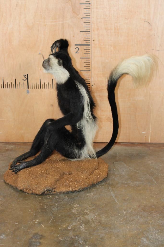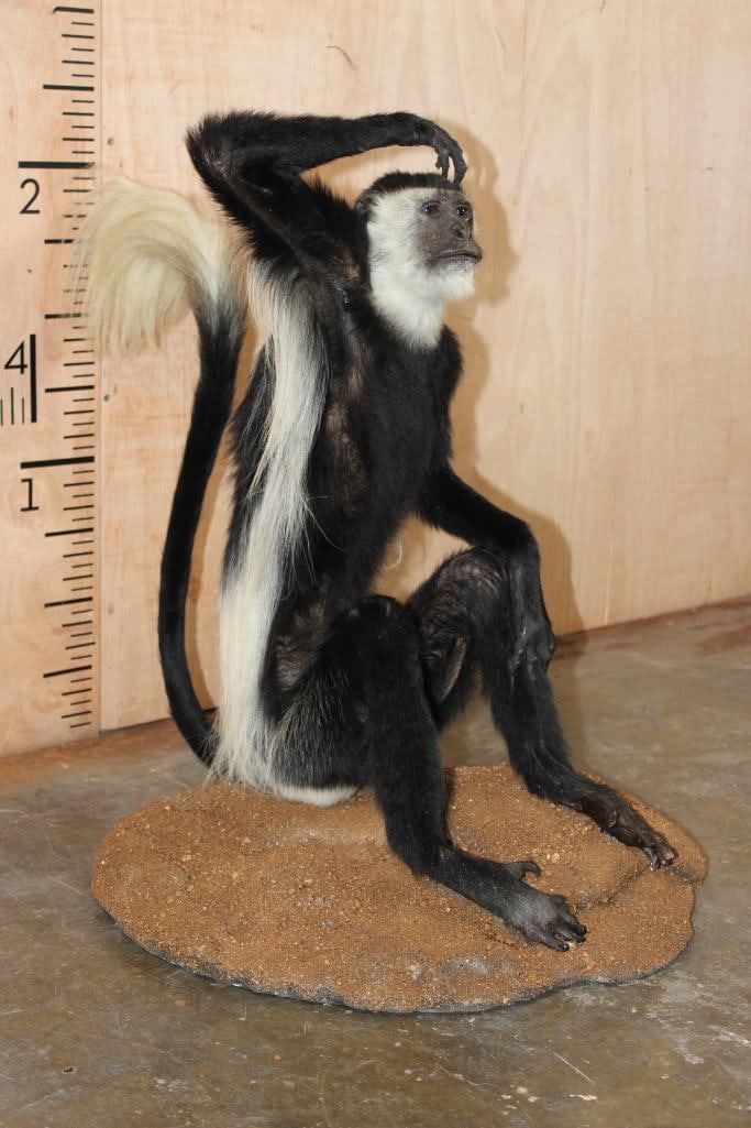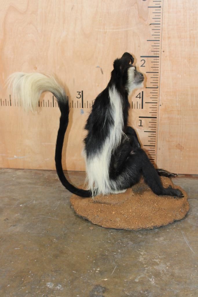 Very Nice, Clean, and Newer Life-sized COLOBUS MONKEY in immaculate Condition. It is displayed on a Circular Base and measures 28" Long x 20" Wide x 27" Tall. TAXIDERMY