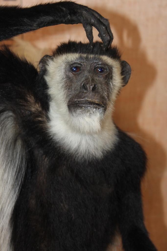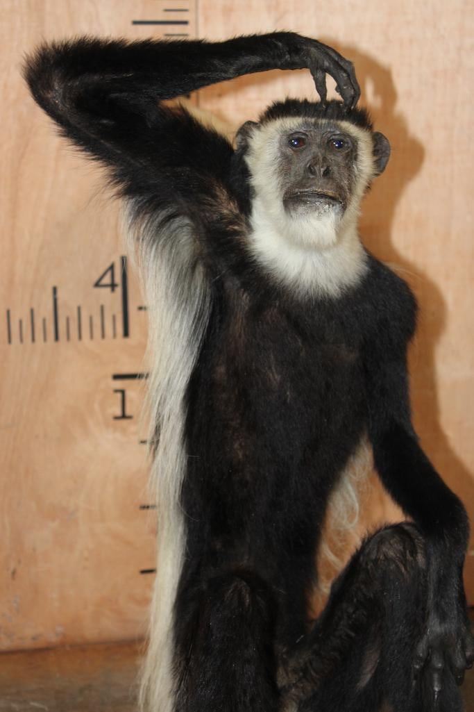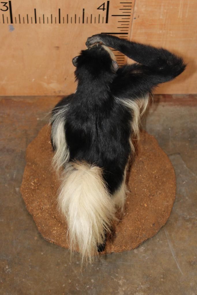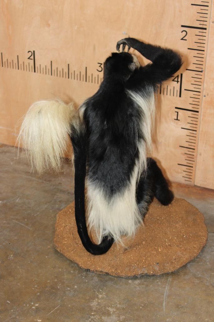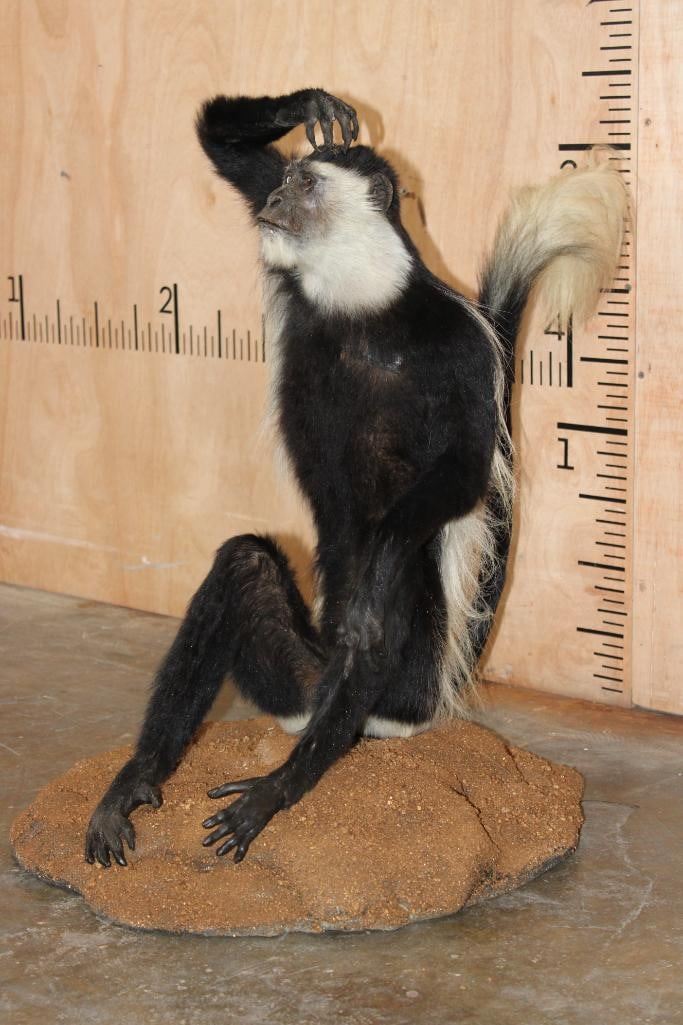 Very Nice, Clean, and Newer Life-sized COLOBUS MONKEY in immaculate Condition. It is displayed on a Circular Base and measures 28" Long x 20" Wide x 27" Tall. TAXIDERMY
