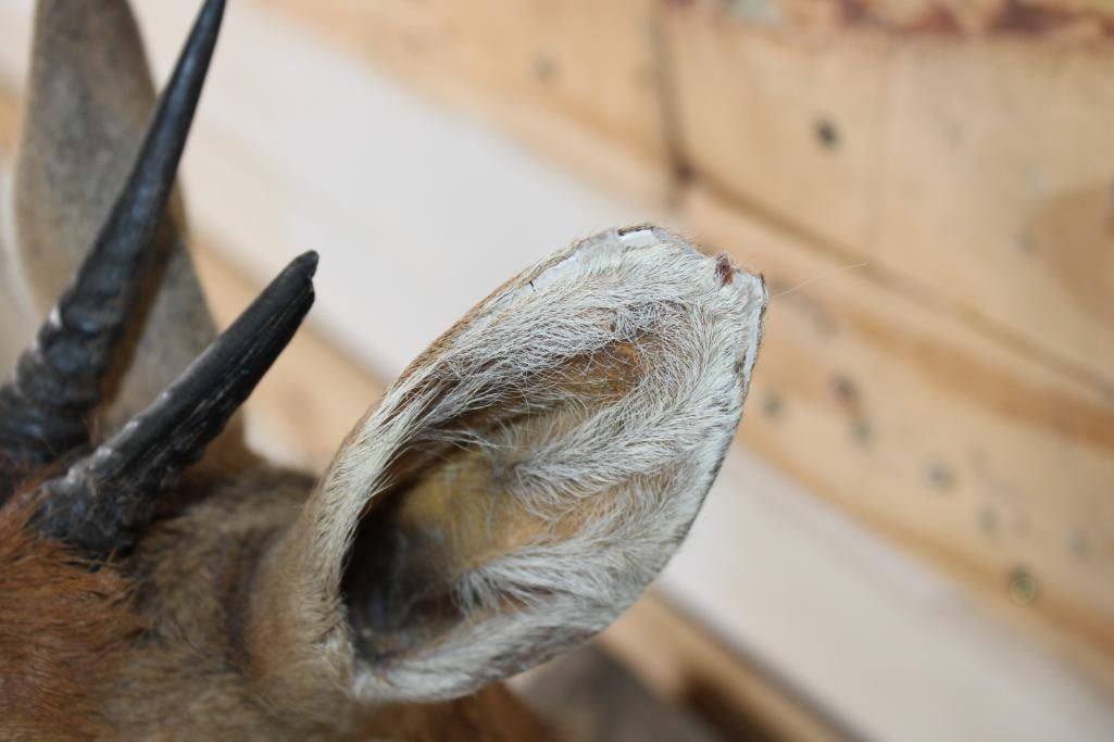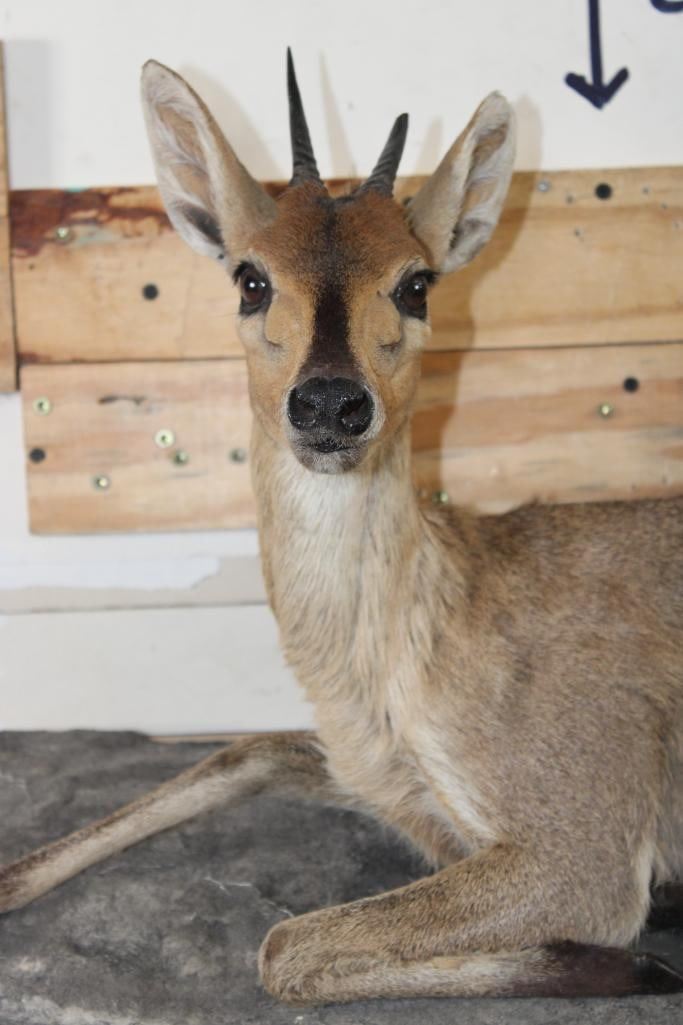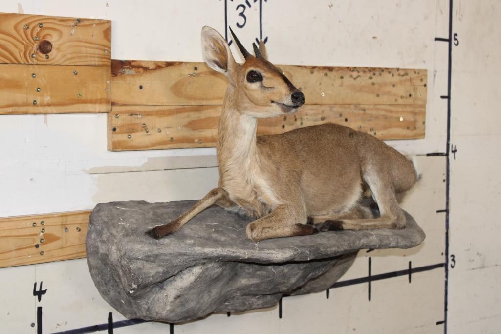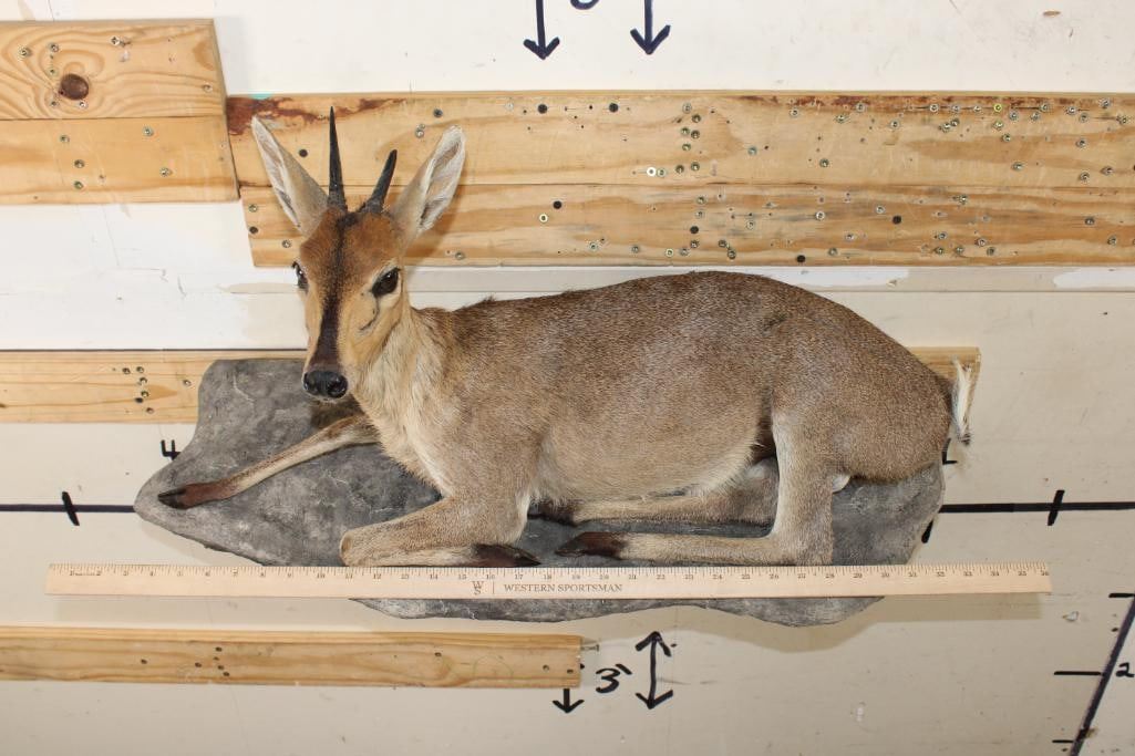 Life-sized COMMON DUIKER laying on a simulated Rock Hanger Base. It measures 33" Long x 24" Tall x 12" Depth. The tip of the left ear and left horn is broken/missing. Otherwise, it is a Nice mount in Good Condition. TAXIDERMY