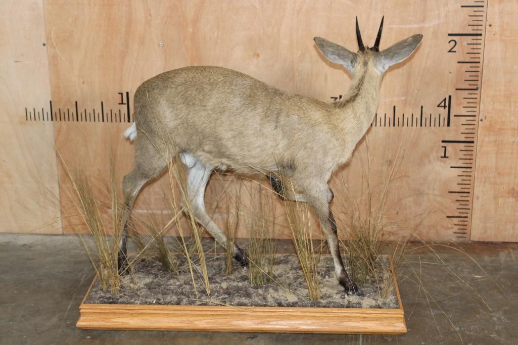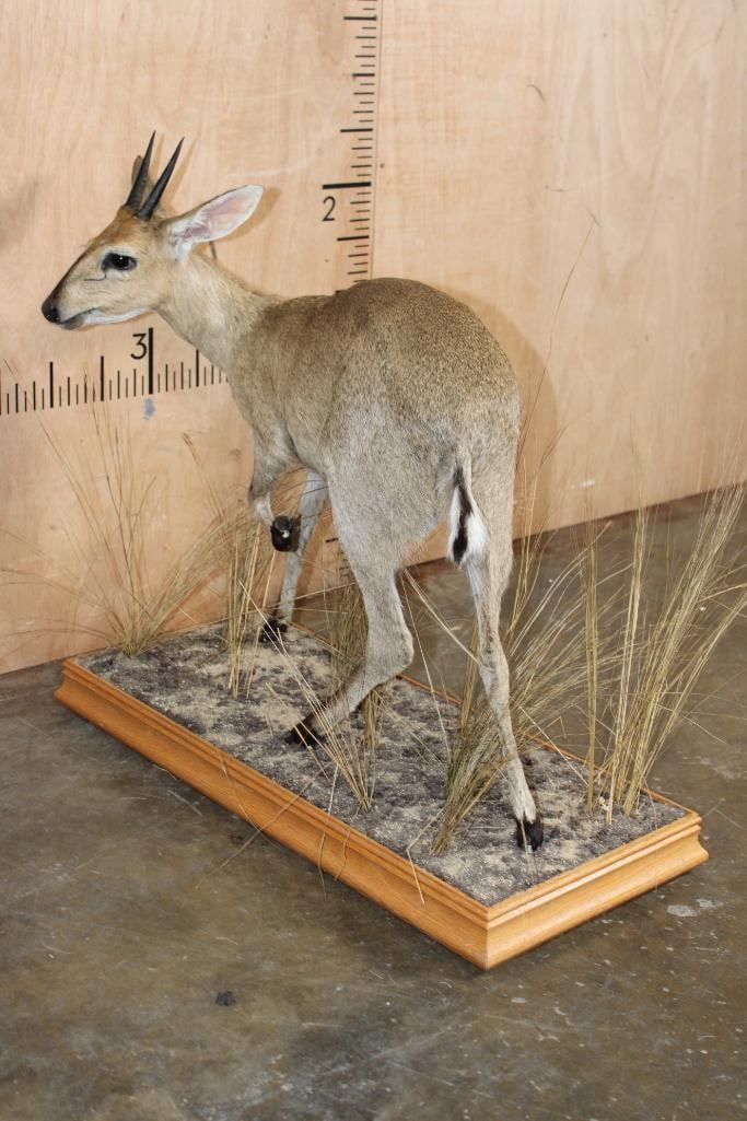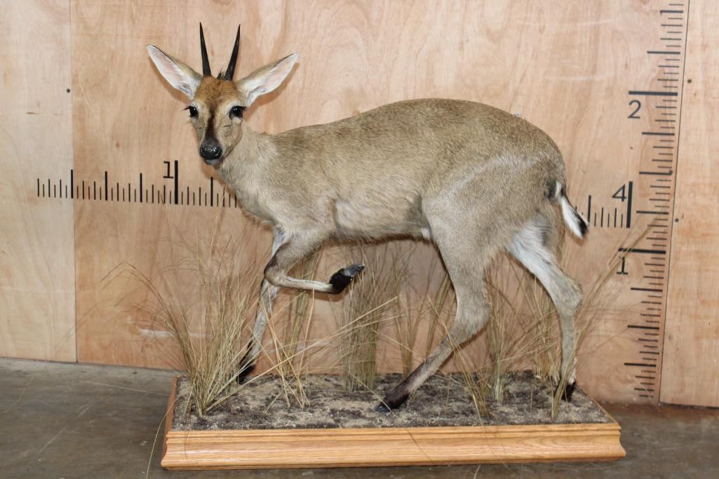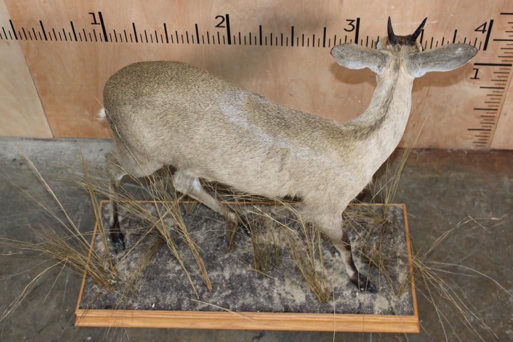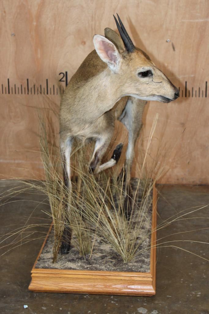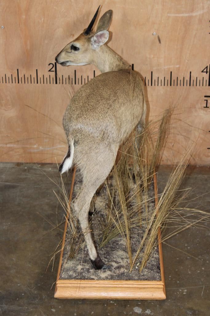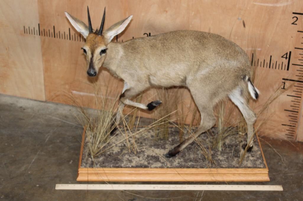 Very Nice and Clean Life-sized COMMON DUIKER. The Horns measure 4.25" Long each. The Total Mount measures 32" Long x 15" Wide x 29" Tall on a Decorative Wood Base. It was in Very Good Condition. TAXIDERMY