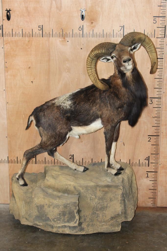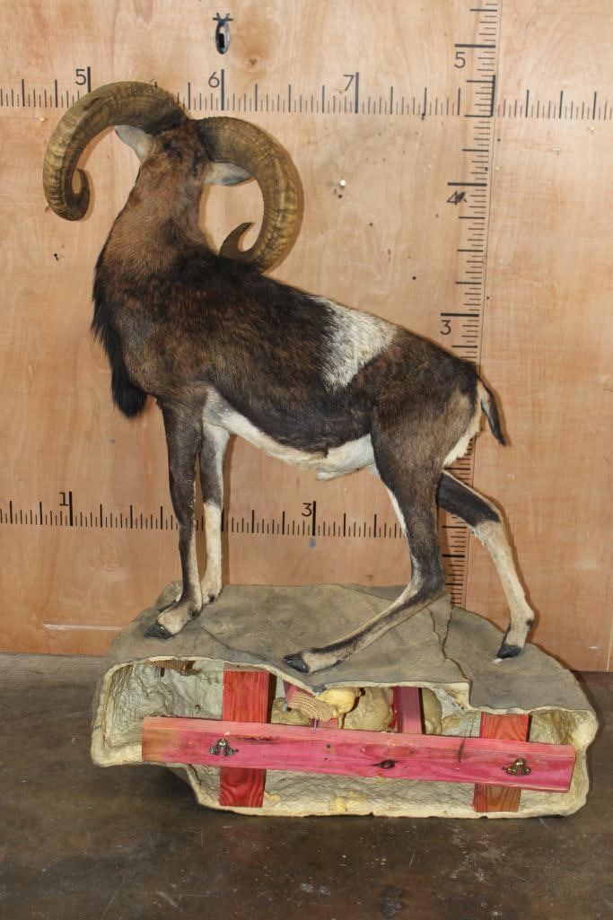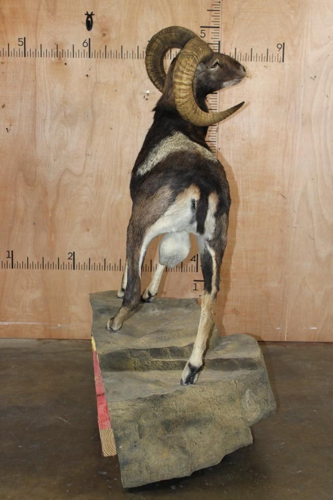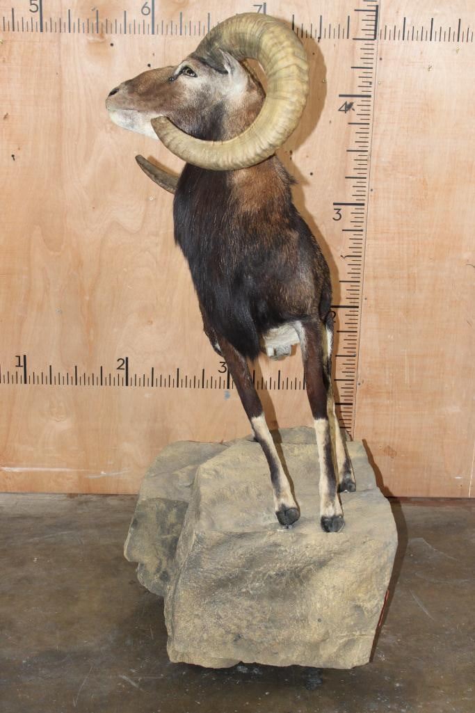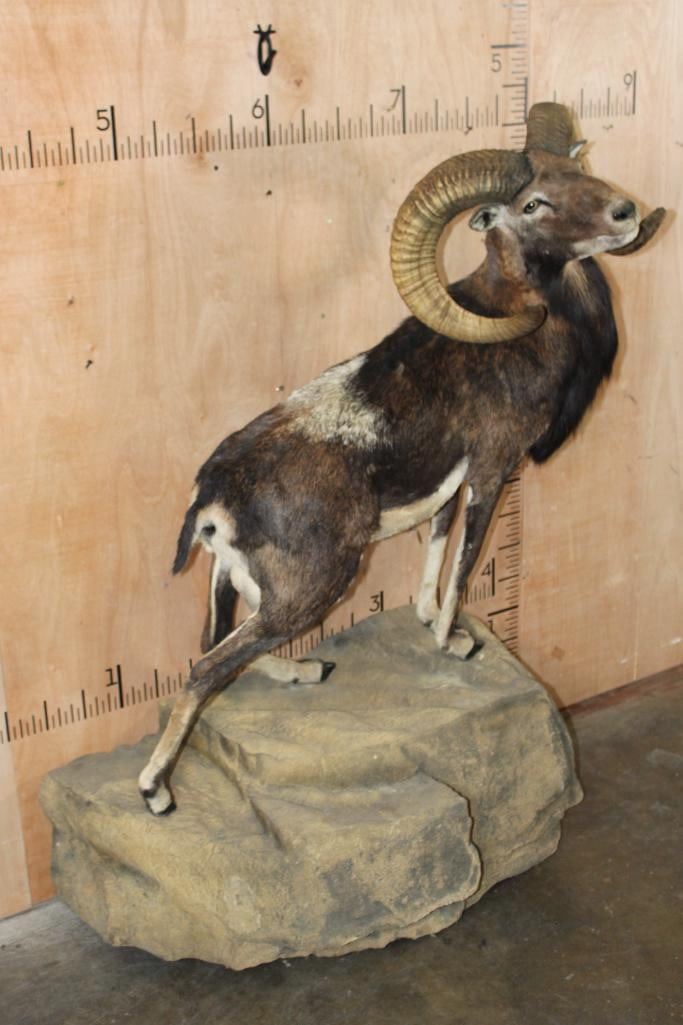 Very Nice Clean, and Newer Life-sized CORSICAN SHEEP Ram. It is mounted on a Fiberglass Rock Wall Hanging Base and measures 3.5" Long x 4' 9" Tall x 25" Depth (from the wall). It is in Very Good Condition. TAXIDERMY