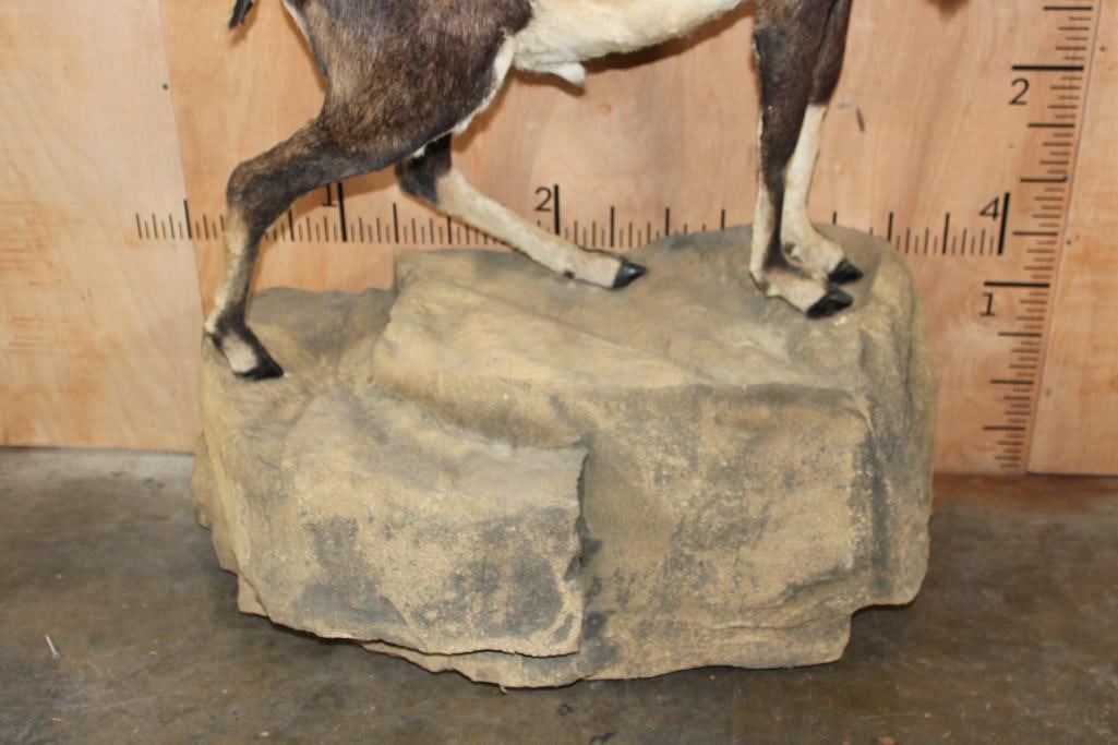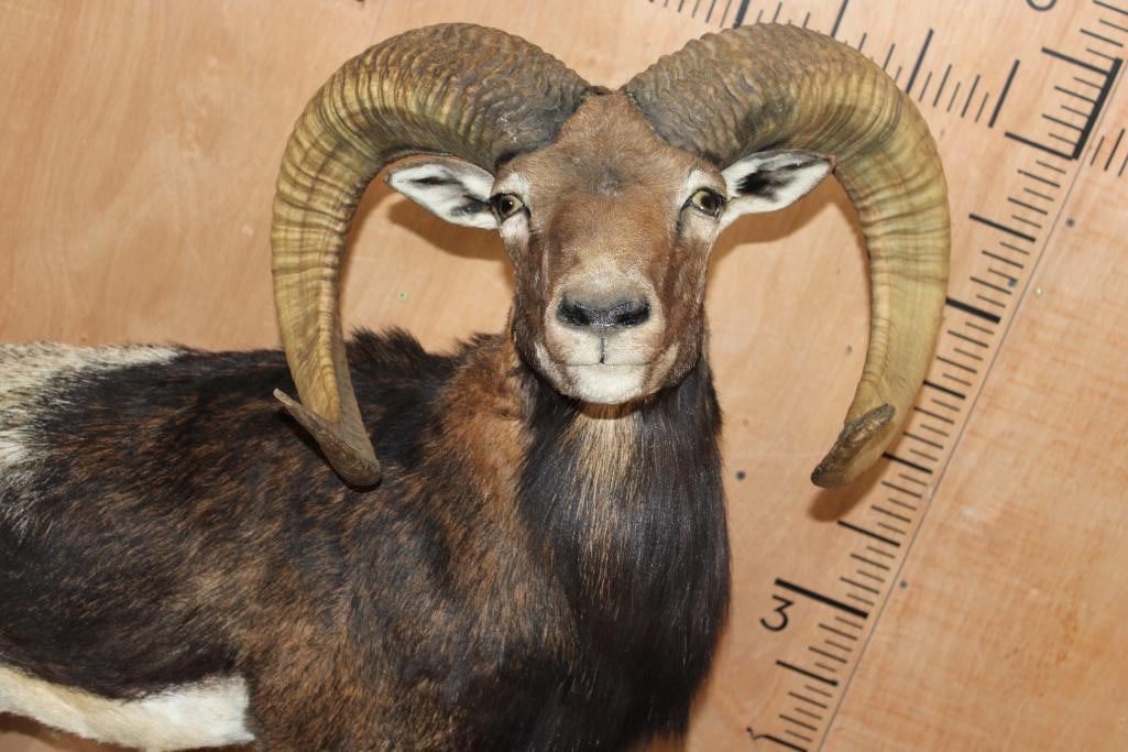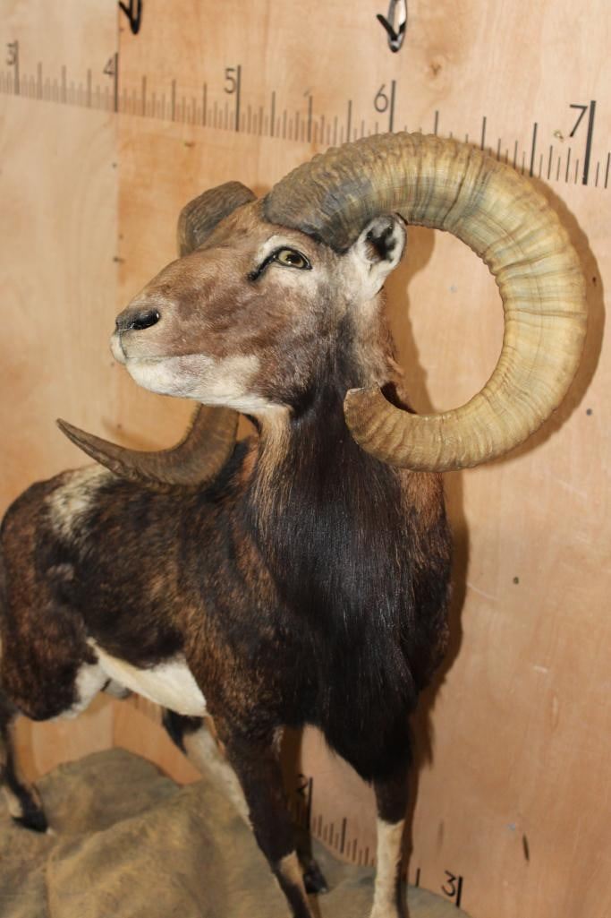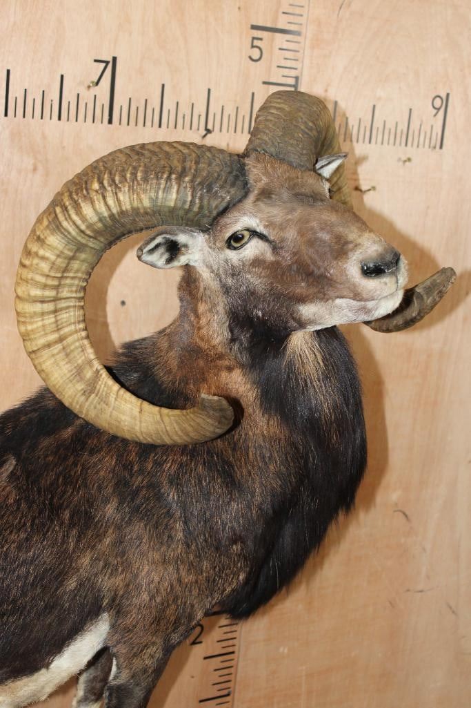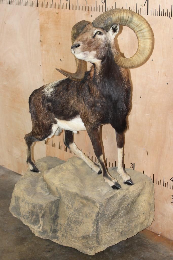 Very Nice Clean, and Newer Life-sized CORSICAN SHEEP Ram. It is mounted on a Fiberglass Rock Wall Hanging Base and measures 3.5" Long x 4' 9" Tall x 25" Depth (from the wall). It is in Very Good Condition. TAXIDERMY