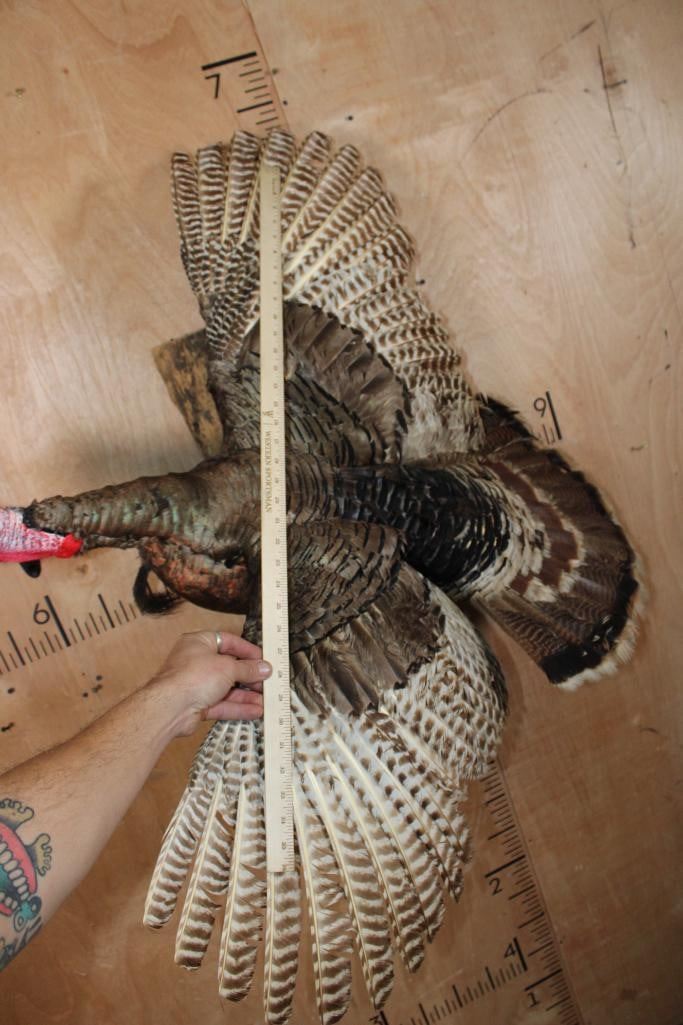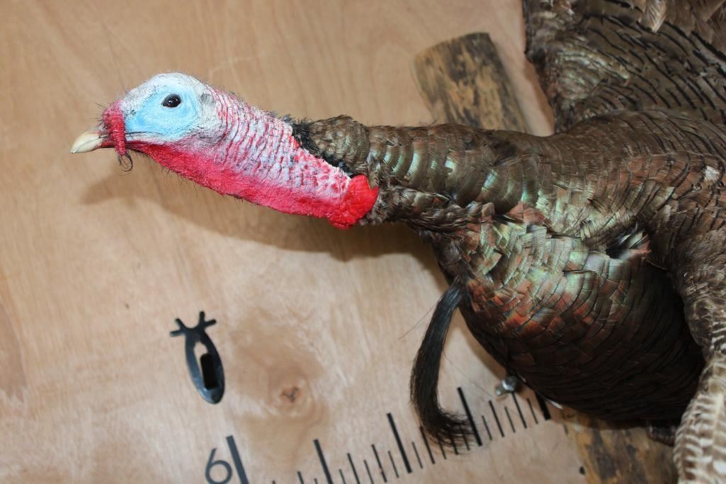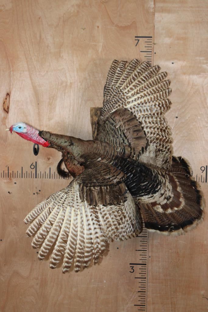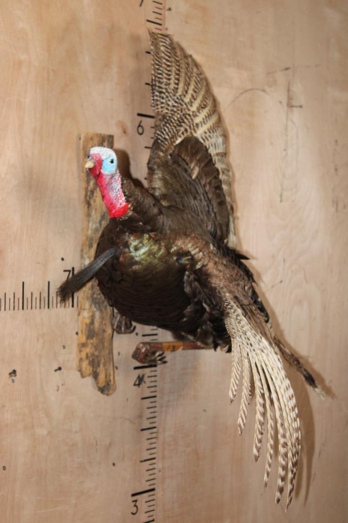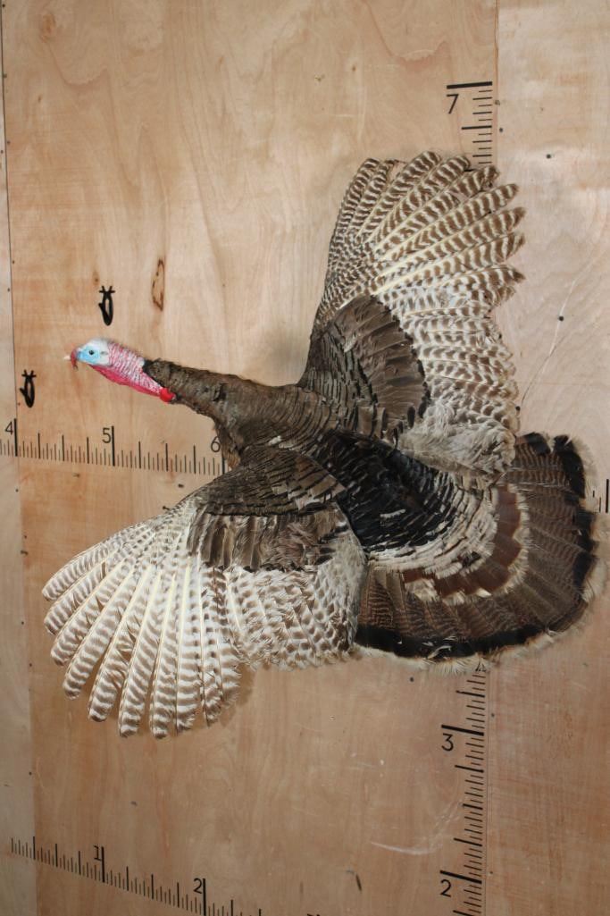 Nice Life-sized Flying TURKEY. It is mounted on a Driftwood Wall Hanging Base and measures 41" Tall x 39" Wide x 25" Depth. It is in Good Condition. TAXIDERMY BIRDS