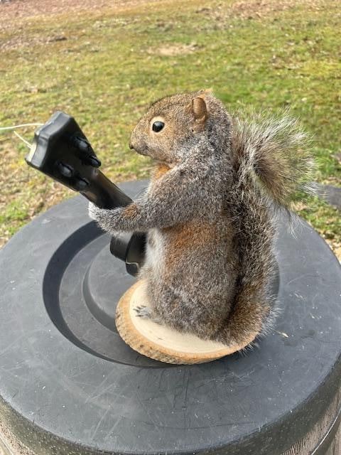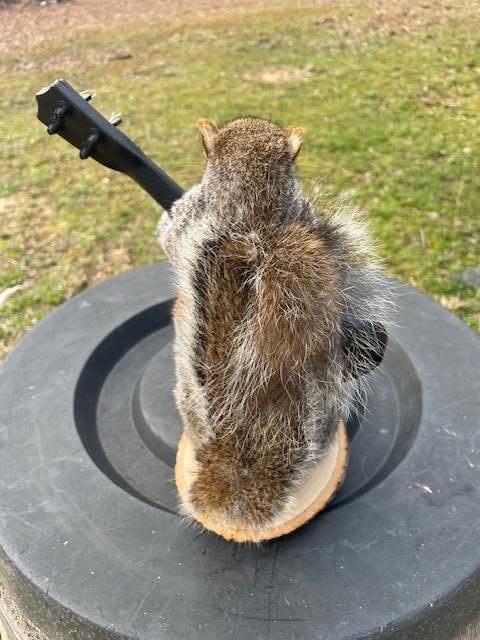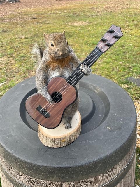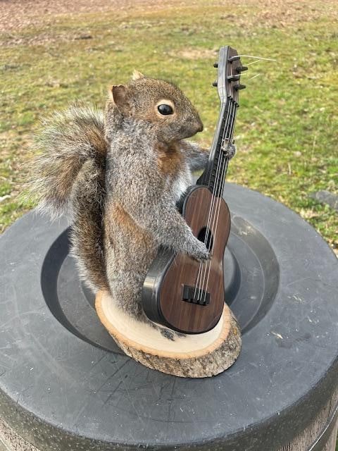 Life-sized Guitar Playing SQUIRREL on a Log Slice Base