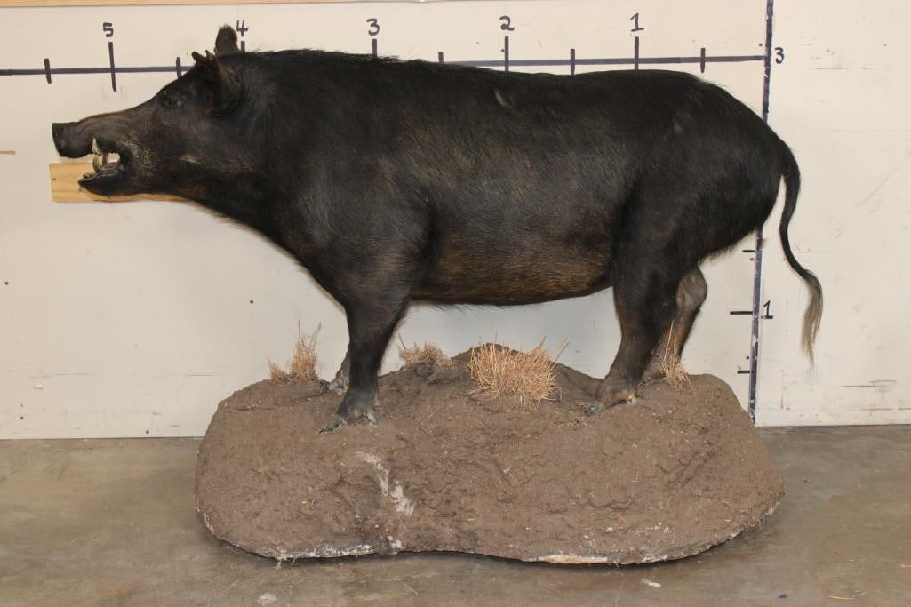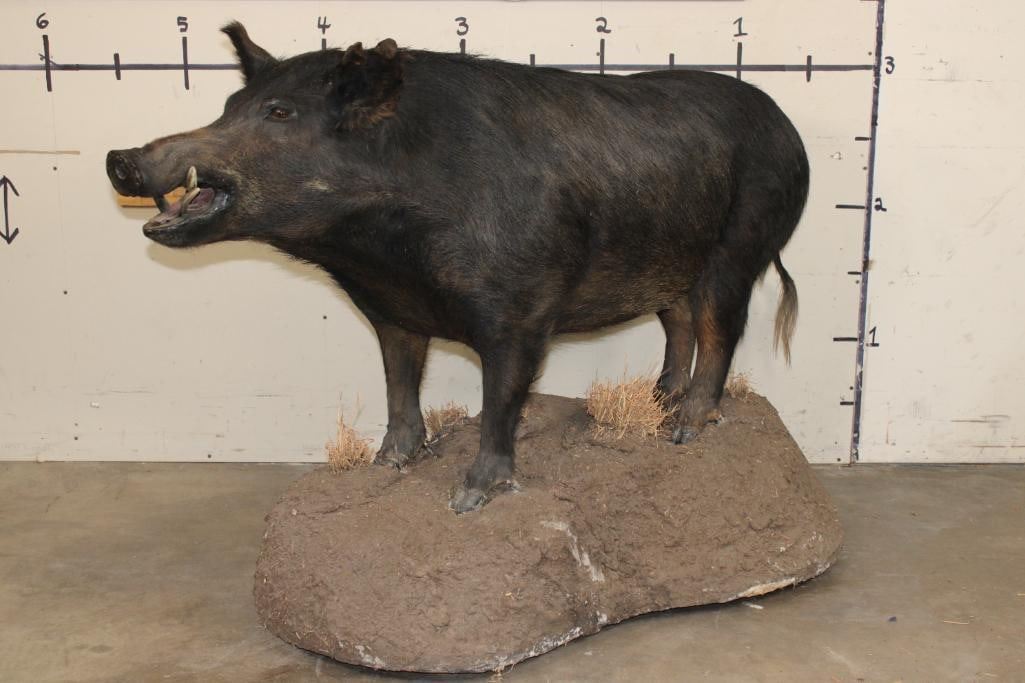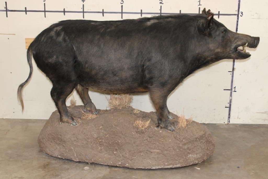 Big Ol' Life-sized HOG on a Reproduction Rock Base with Wheels. It measures 64" Long x 29" Wide x 40" Tall. TAXIDERMY