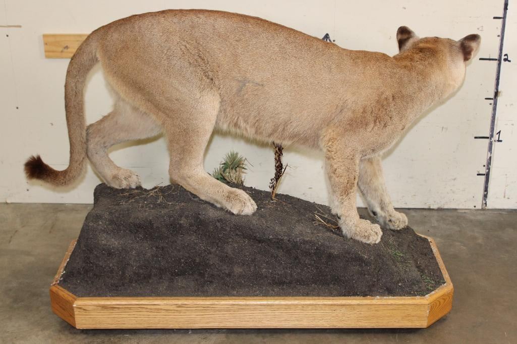 Very Nice Life-sized MOUNTAIN LION or COUGAR. It has been mounted on a Foam on Wood Base with Wheels. The Total Mount measures 55" Long x 20" Wide x 38" Tall. This was removed from a diorama. There is some residue on the Base that can easily be cleaned off. the Mountain Lion is in Very Good Condition. TAXIDERMY