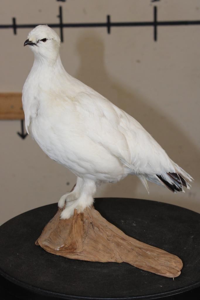 Life-sized ROCK PTARMIGAN Bird on a Driftwood Base. It measures 12" Long x 9" Wide x 11" Tall and it is in Good Condition. TAXIDERMY BIRDS
