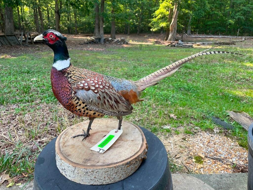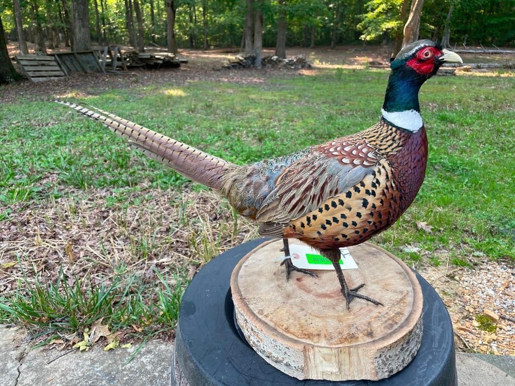 Beautiful and brightly colored Life-sized Ring-necked PHEASANT. It measures 18" Tall x 13" Wide x 13" Depth. It is mounted on a slice of wood. TAXIDERMY BIRDS