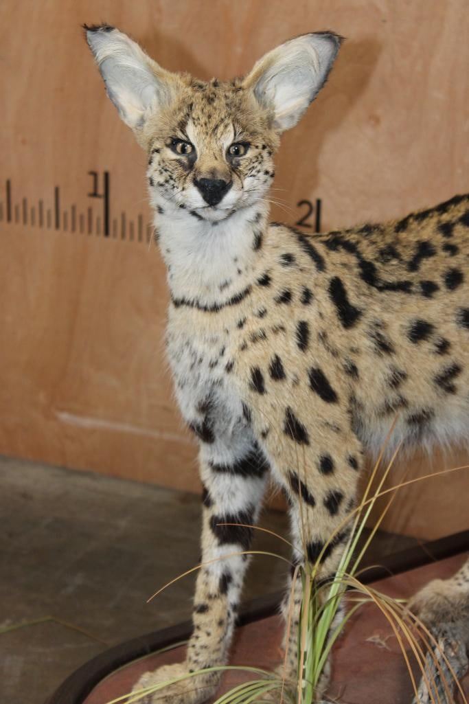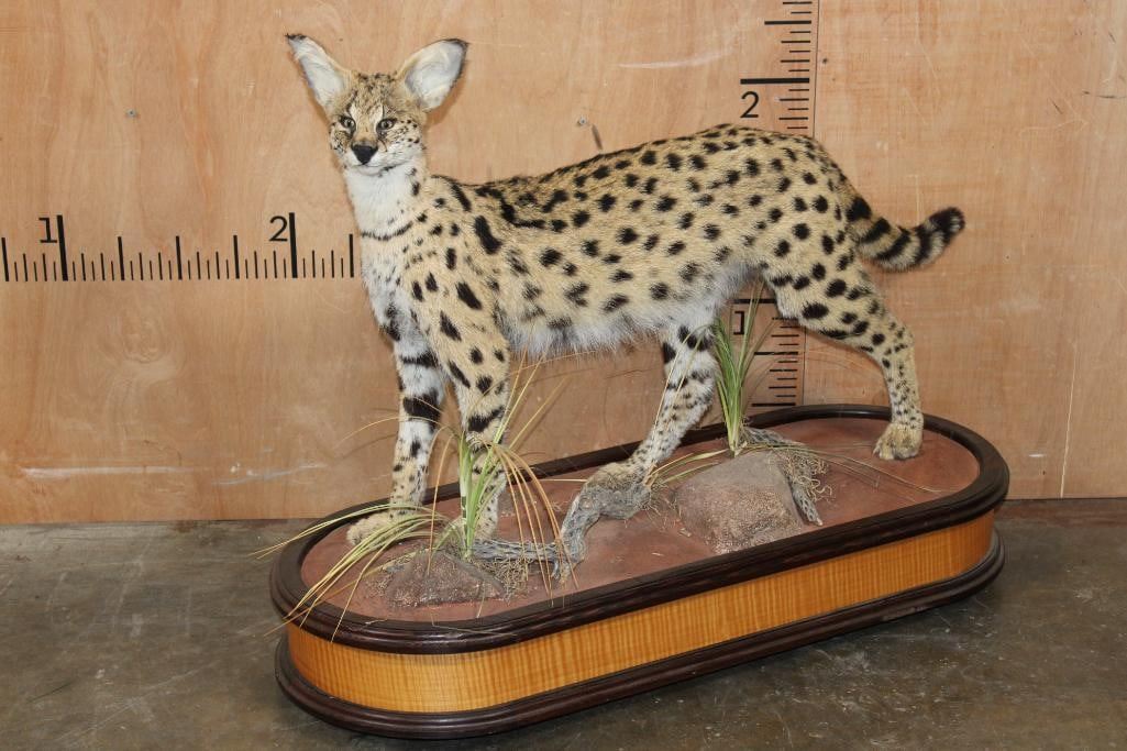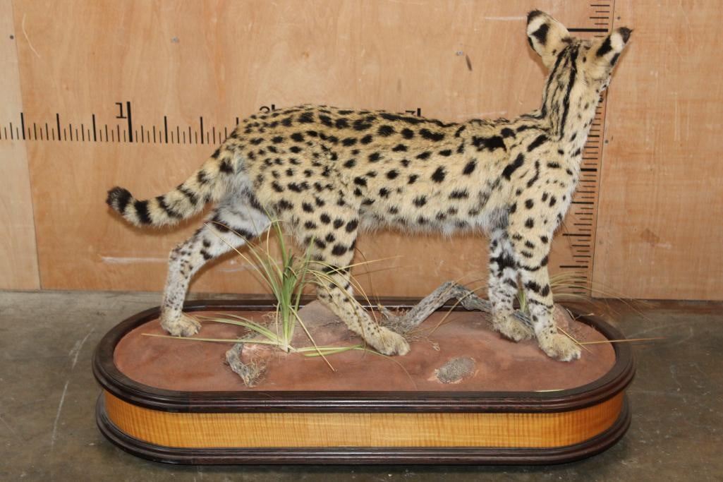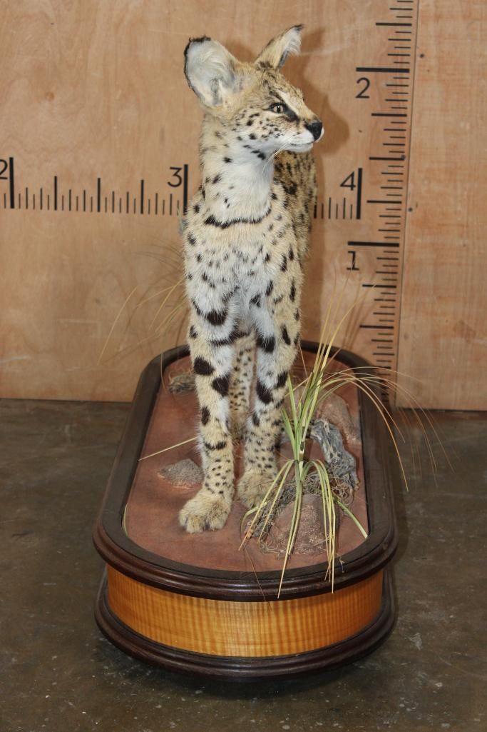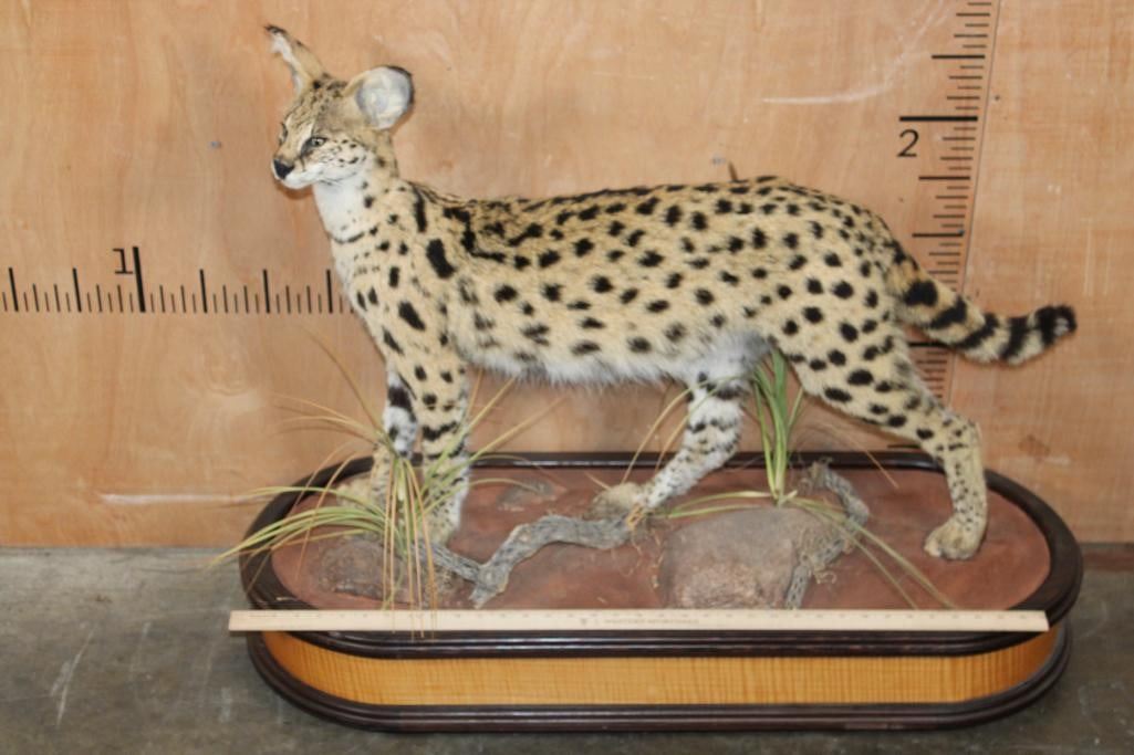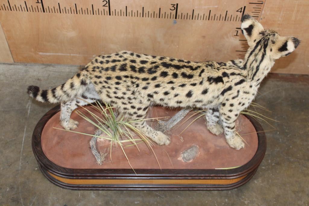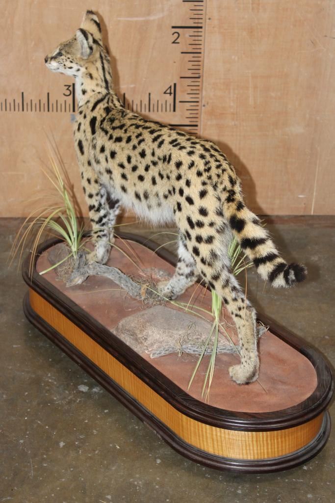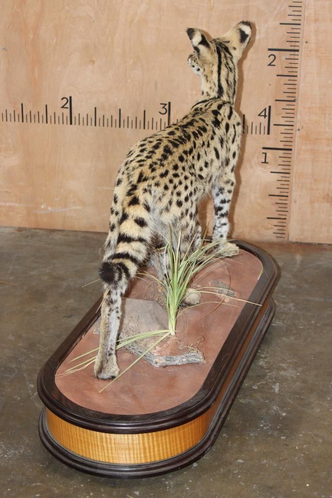 Incredibly Nice Life-sized SERVAL CAT. The is a Newer, Clean mount in Pristine Condition. It is displayed on a High Quality Wood Base with Wheels. The Total Mount measures 39" Long x 16" Wide x 31" Tall. TAXIDERMY