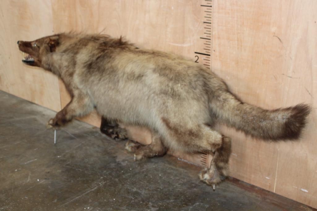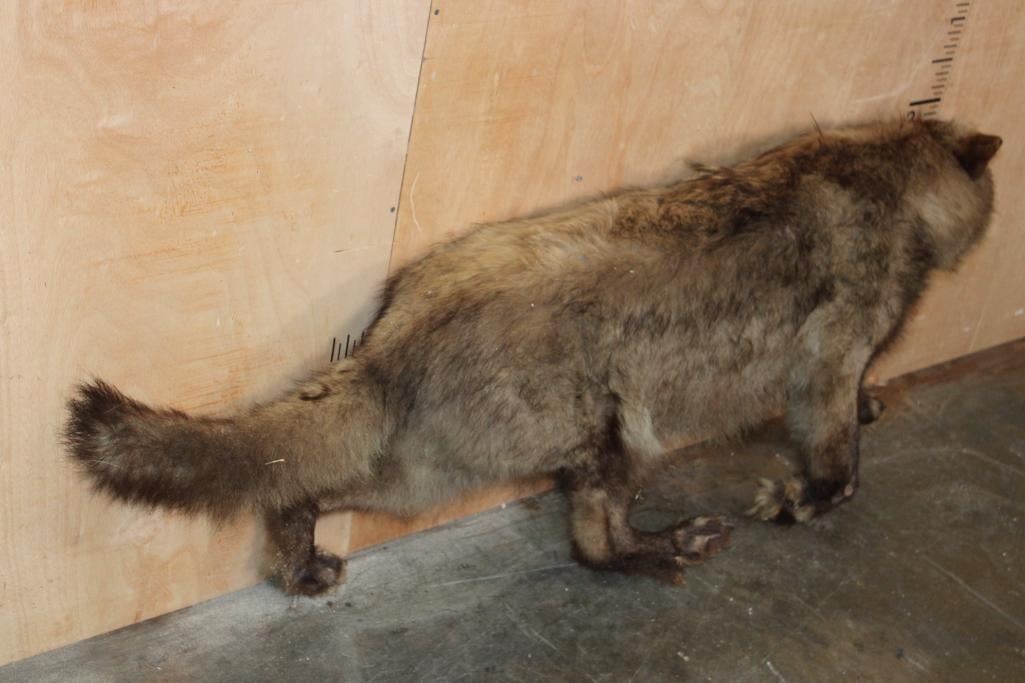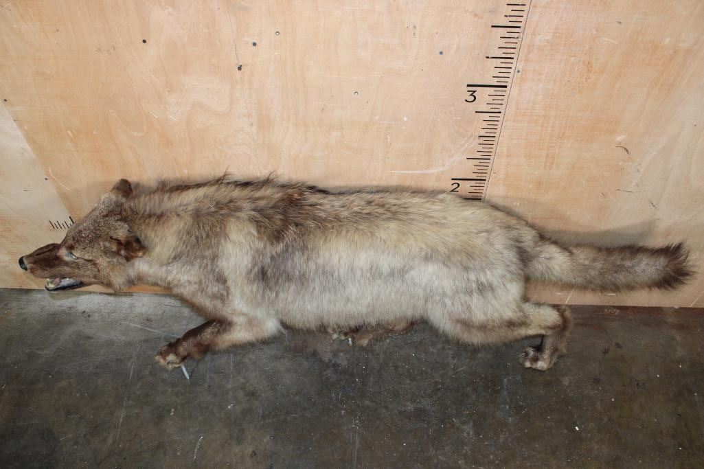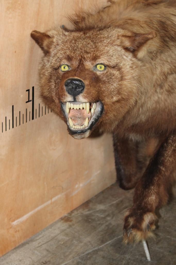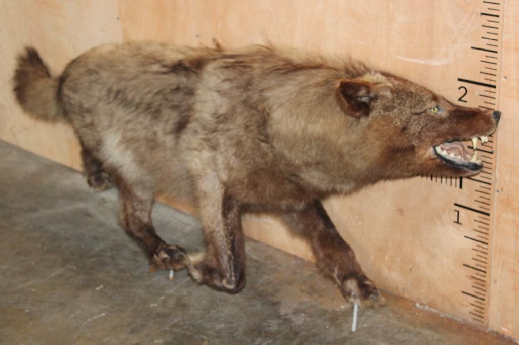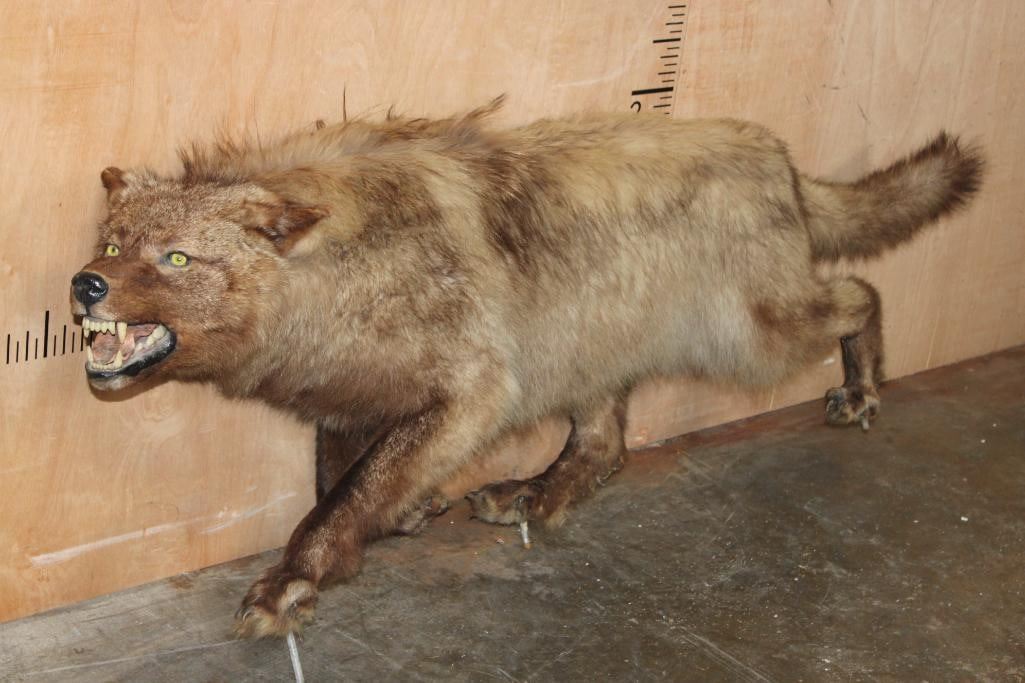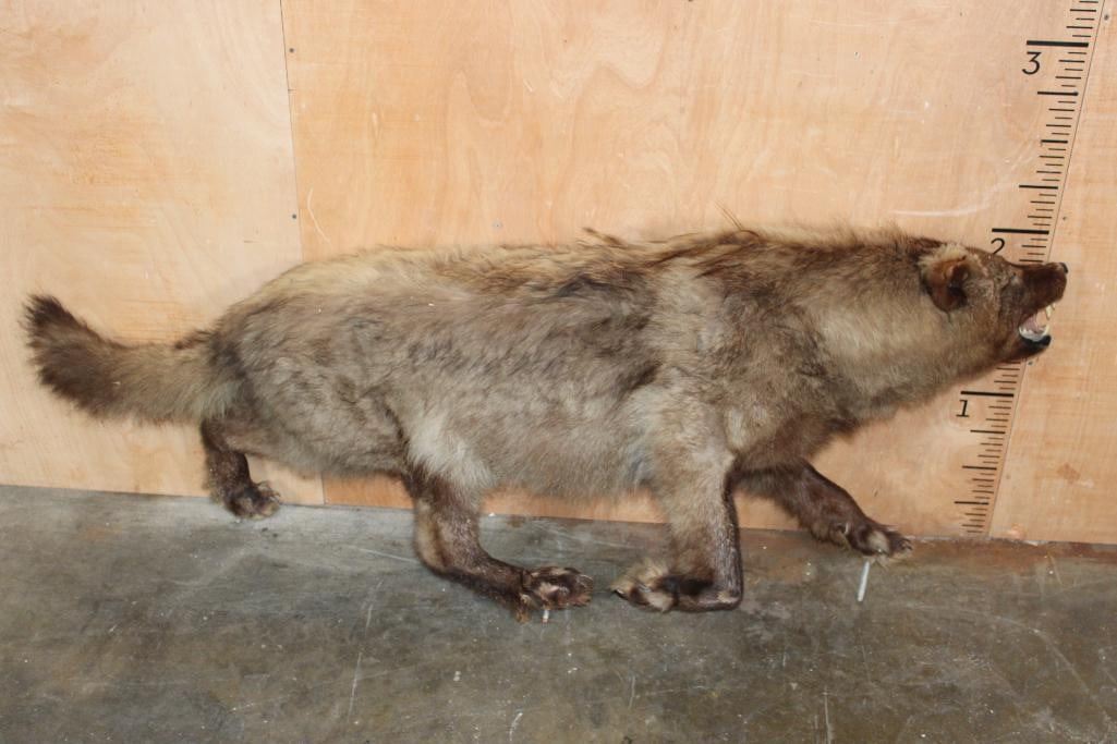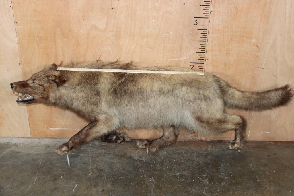 Nice Life-sized "Snarling" WOLF. He is in a cool pose and has a great face. It is mounted on Bolts with No Base. It measures 69" Long x 11" Wide x 25" Tall and is in Good Condition. TAXIDERMY