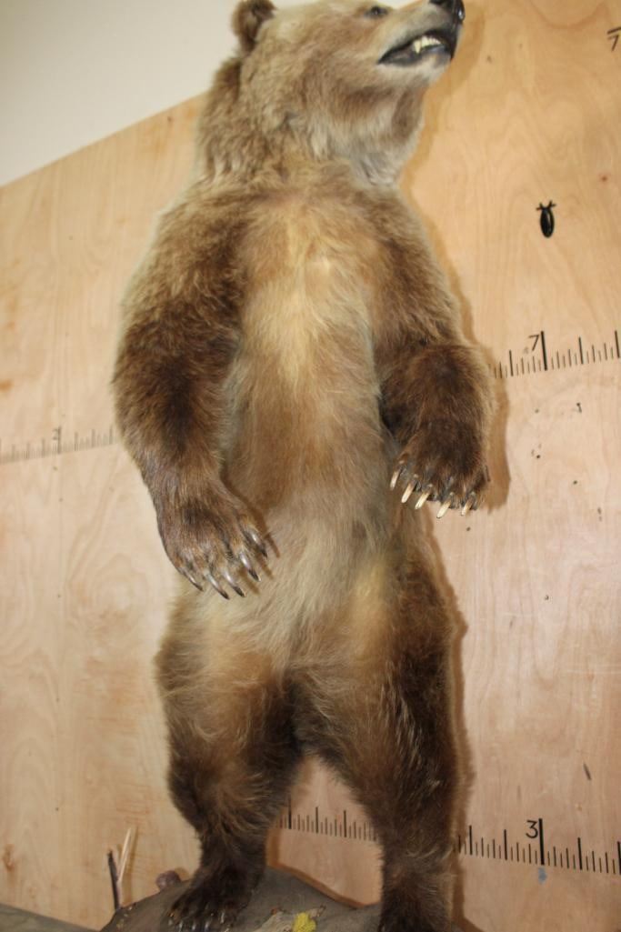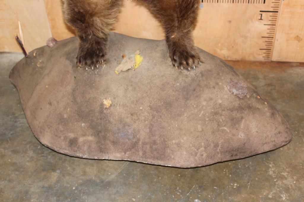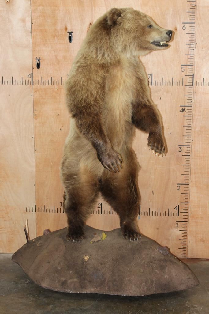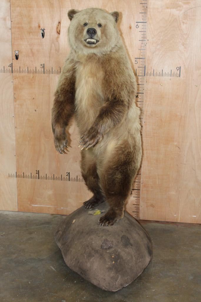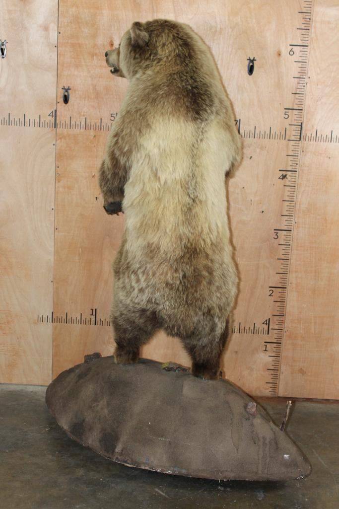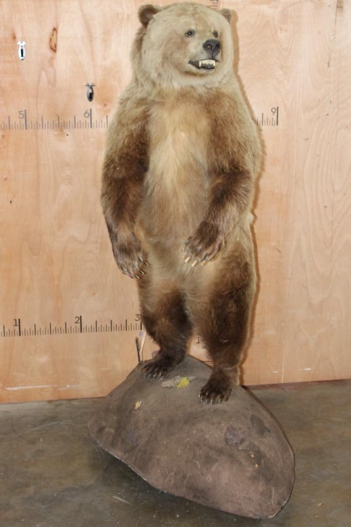 Very Nice Life-sized Standing GRIZZLY BEAR or BROWN BEAR. It has All but 1 (missing right foot claw) of its Big Claws! It is mounted on a Rock Base with Wheels and measures 55" Long x 30" Wide x 6' 3" Tall (including the base). We had fun moving this bear around, he appears to be surfing when in motion! It is in Very Good Conditon. TAXIDERMY