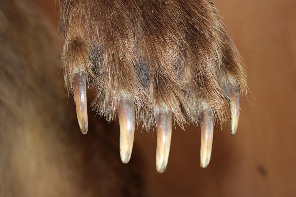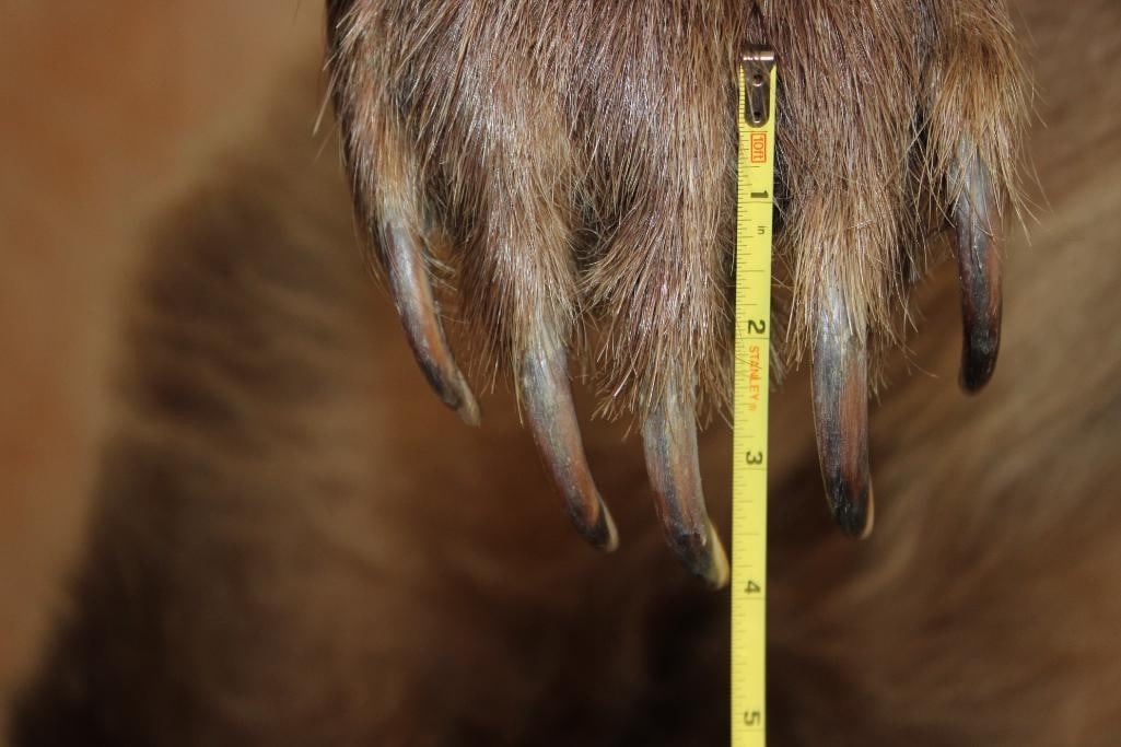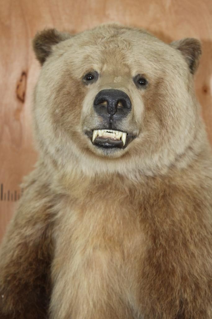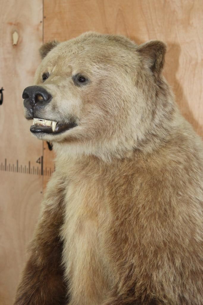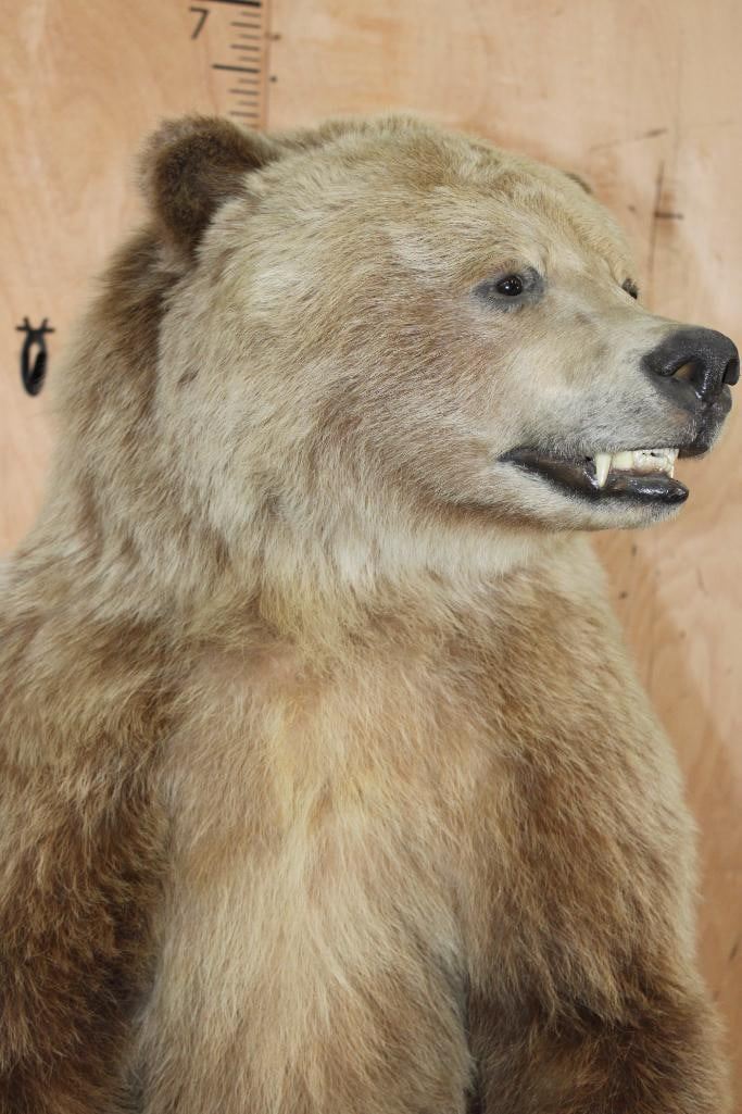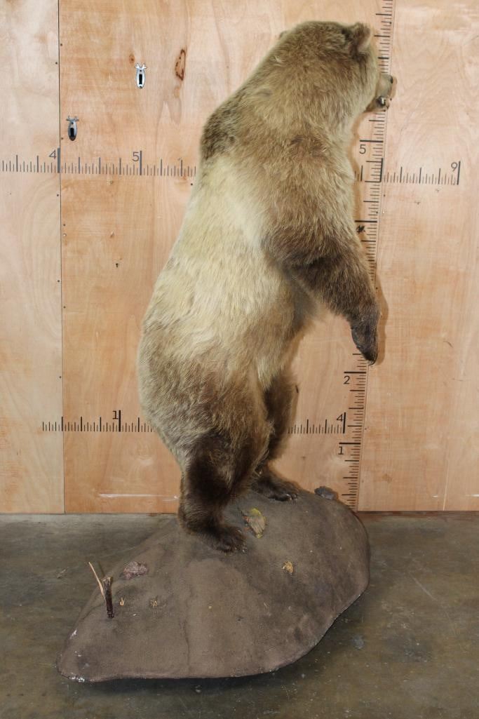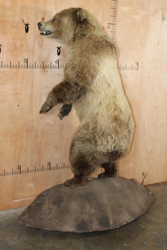 Very Nice Life-sized Standing GRIZZLY BEAR or BROWN BEAR. It has All but 1 (missing right foot claw) of its Big Claws! It is mounted on a Rock Base with Wheels and measures 55" Long x 30" Wide x 6' 3" Tall (including the base). We had fun moving this bear around, he appears to be surfing when in motion! It is in Very Good Conditon. TAXIDERMY