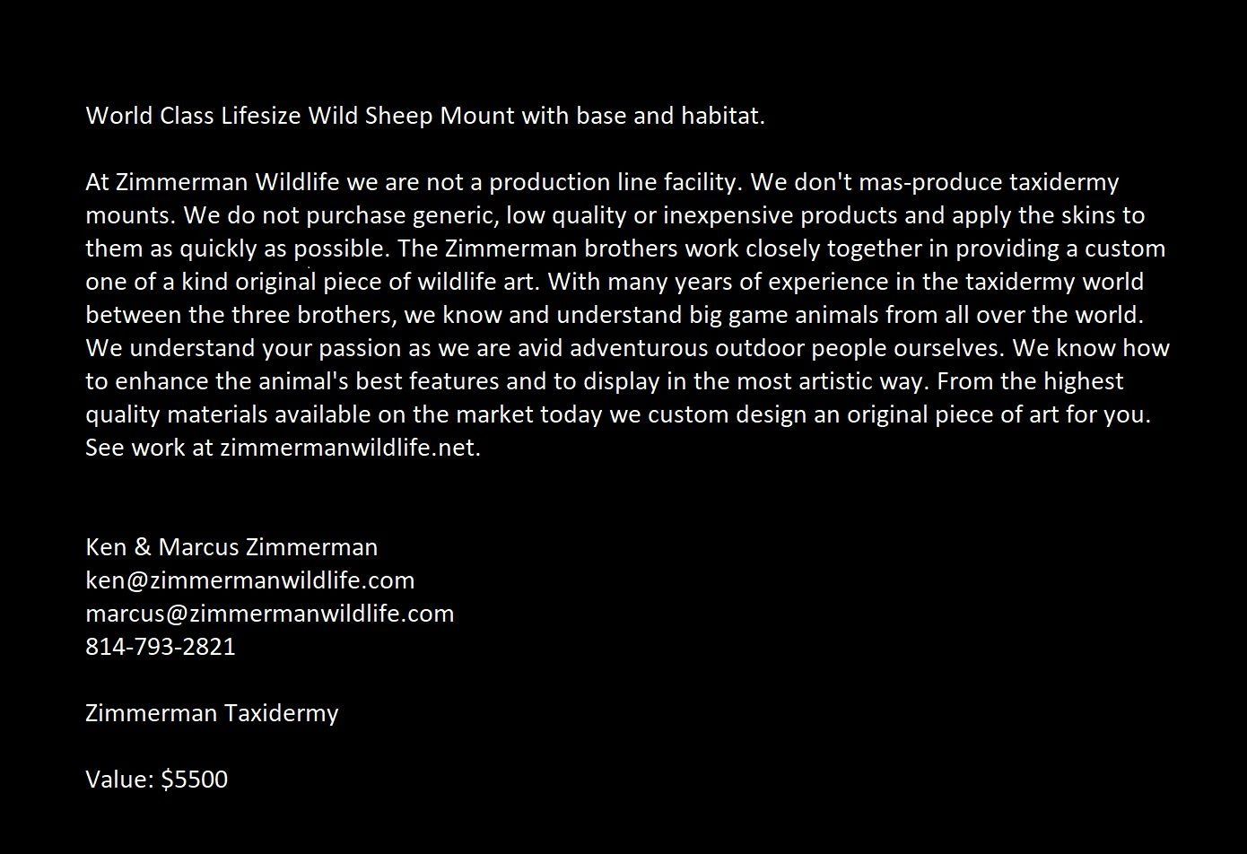 At Zimmerman Wildlife we are not a production line facility. We don't mas-produce taxidermy mounts. We do not purchase generic, low quality or inexpensive products and apply the skins to them as quickly as possible. The Zimmerman brothers work closely together in providing a custom one of a kind original piece of wildlife art. With many years of experience in the taxidermy world between the three brothers, we know and understand big game animals from all over the world. We understand your passion as we are avid adventurous outdoor people ourselves. We know how to enhance the animal's best features and to display in the most artistic way. From the highest quality materials available on the market today we custom design an original piece of art for you. See work at zimmermanwildlife.net.