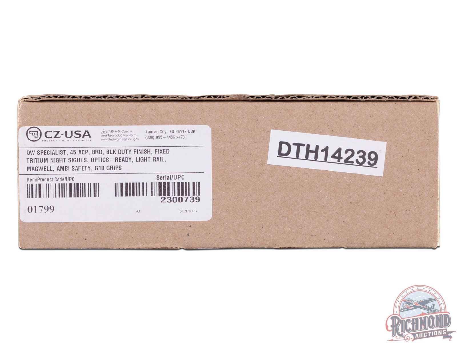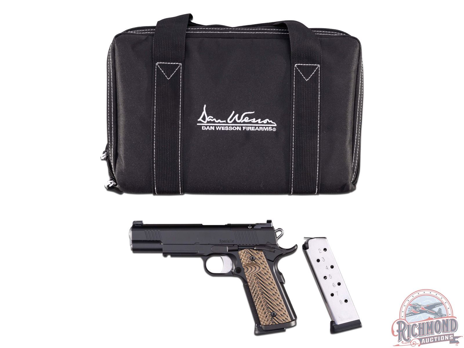 This isn't your typical full size 1911! This Dan Wesson Specialist features a 5" match grade barrel, Novak tactical rear adjustable sight with a tritium self-illuminated vial front dot sight. Black duty finish with front and rear serrations on the slide and topped with an inverted rib for less glare. Picatinny accessory rail for laser or light. Controls - grip safety, ambidextrous thumb safety, skeletonized hammer and serrated long trigger. Textured front and rear grip straps for a secure grip and fitted with G-10 camo grip panels. Magwell for ease of funneling magazines. Comes in the original factory box with soft range case, two 8-round magazines, cable lock and factory paperwork. CALIBER: 45 ACP. S/N: 2300739. FFL STATUS: Modern.