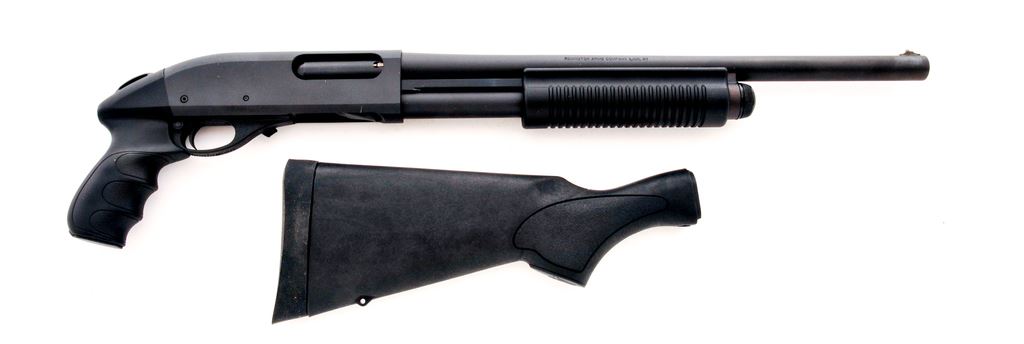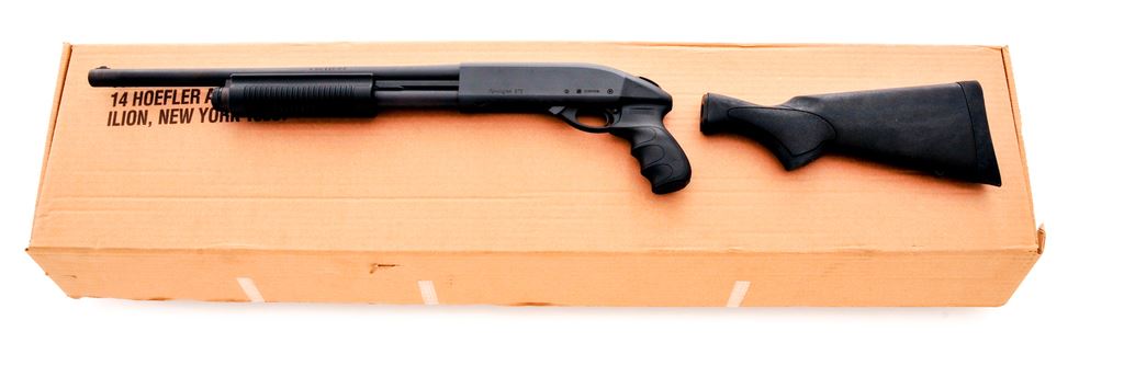 Like New Remington Model 870 Express Tactical Pump Action Shotgun, #CC39939B, 12 ga., 3'' chamber, 18.5'' barrel, cylinder bore, matte black finish, black synthetic full pistol grip and grooved forend, with a silver bead front sight. Pistol grip with an integral sling swivel. Shotgun also includes a regular black synthetic stock with black rubber recoil pad. In original box with matching end label, gun lock, and the owner's manual. Condition is excellent overall, appearing as new and unfired. Bore is mirror bright. Est.: $250-$400. (Modern)