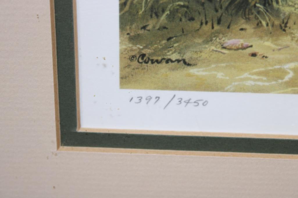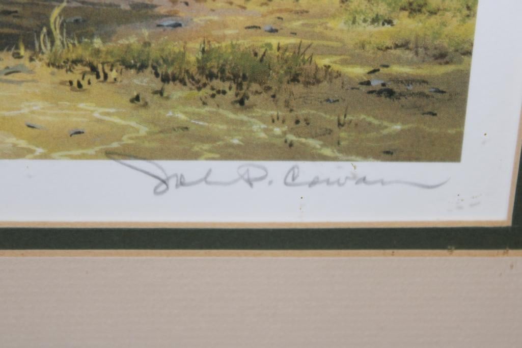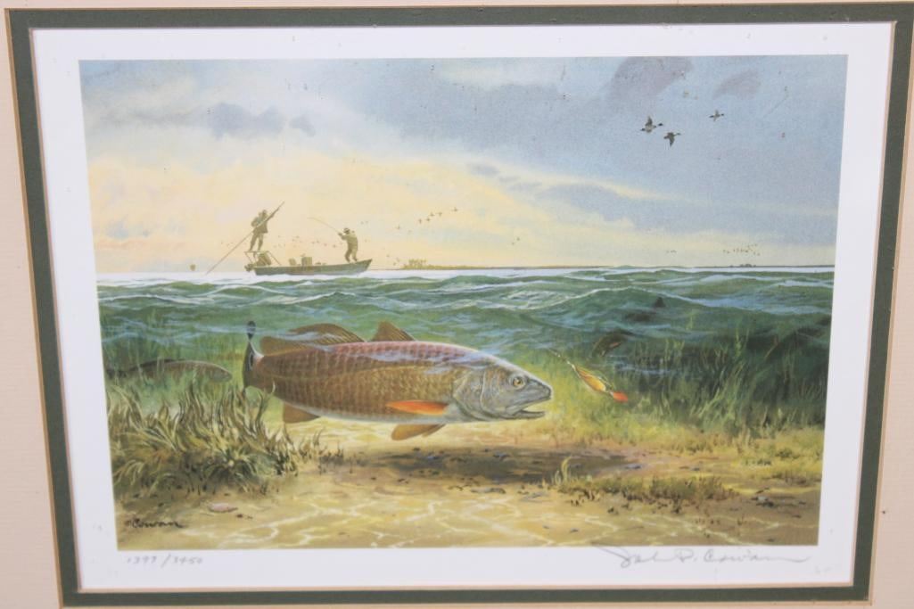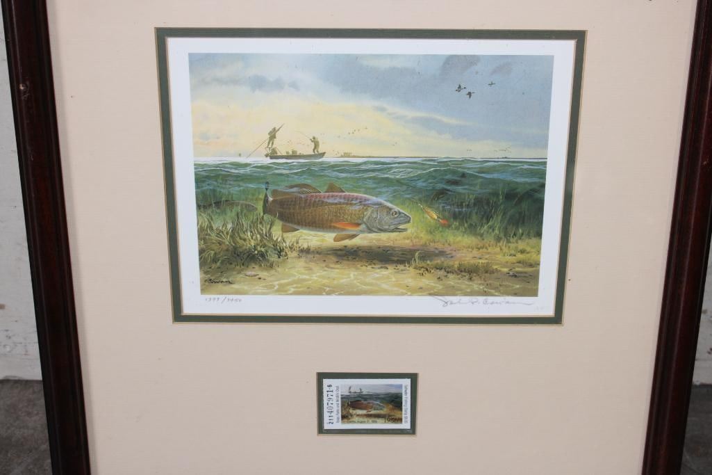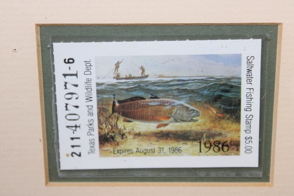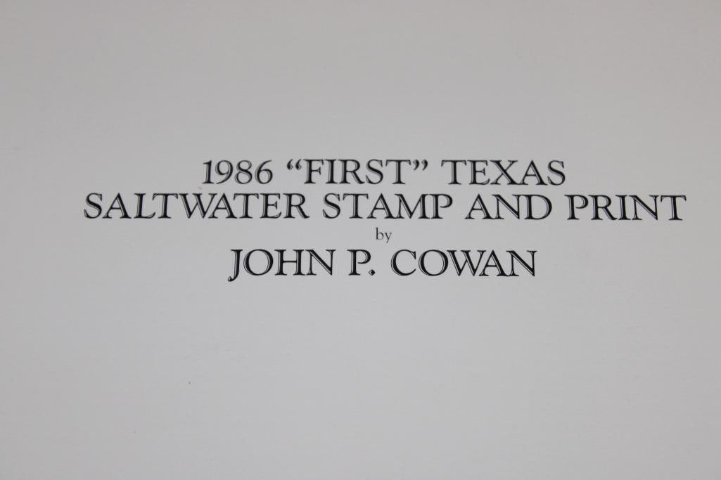 1986 "First" Texas Saltwater Stamp and Print. This is a Limited Edition #1397/3450 Art Print and Stamp signed and numbered in pencil by Renowned Artist John P. Cowan (American b.1920-d.2008). It is displayed in a nice Wood and Glass Frame that measures 18" Long x 18" Wide. Artist John Cowan was a watercolor painter of fishing and hunting scenes. Born in Bristol, Tennessee John Cowan studied art at the Pratt Institute in Brooklyn New York, working under Norman Rockwell. An avid hunter and fisherman, Cowan's favorite subjects are quail hunting an redfish fishing. All classic Cowan scenes are instantly recognizable as authentic and accurate representations by sportsmen who have waded the flats and hunted the brush. COLLECTIBLE WILDLIFE ART AND UNITED STATES POSTAL STAMPS