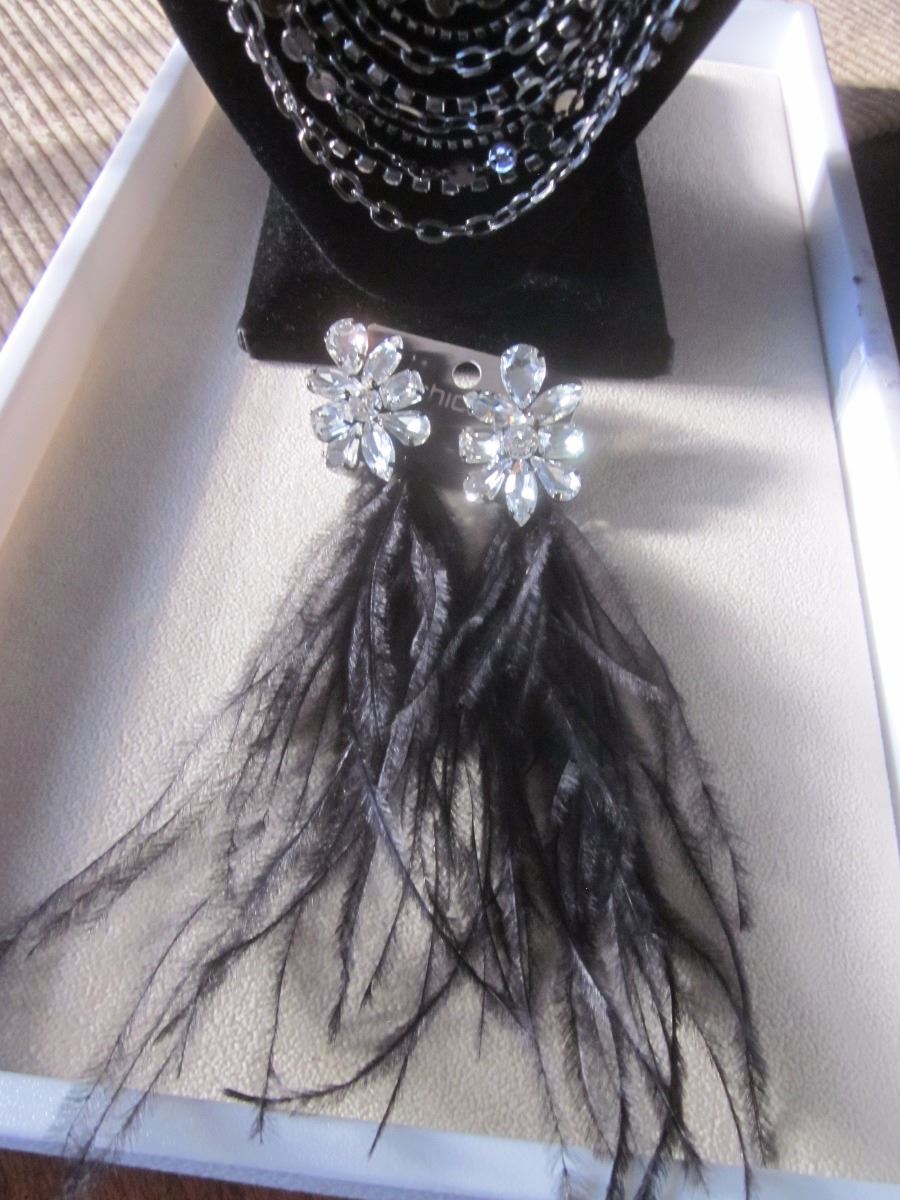 A bold, beautiful, limited edition necklace and earring set features thirteen rows of brilliant cut faceted stones interspersed with five brilliant cut square faceted stones with eleven descending rows of stones and delicate gunmetal shapes that add even more sparkle. Add dramatic earrings with a brilliant cut center stone surrounded by eight teardrop stones and delicate black feathers. Gunmetal chain link with large lobster claw closure and a 4” extender with a faceted stone. This is a statement jewelry ensemble that creates its own excitement!