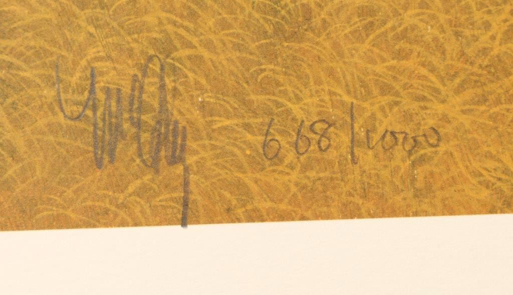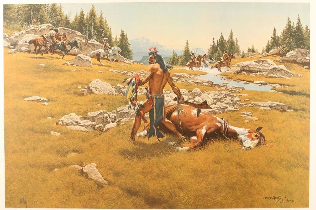 "Surrounded" 668/1000 hand signed lower left in pencil. Image measures 17 3/4"x26 3/4". Print only with information on the artist in a Greenwich Workshop folio. Frank McCarthy was born in New York City and was drawn to the West since he read Will James novels as a boy. He was also intrigued by N.C. Wyeth illustrations. Frank McCarthy's formal training was at the Pratt Institute and had a career in commercial art and as an illustrator. The lure of the West was strong and he eventually settled in Sedona, AZ and became a member of the Cowboy Artists of America. Frank has had several shows in prominent museums and his work has appeared in many national magazines.