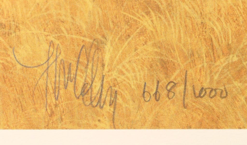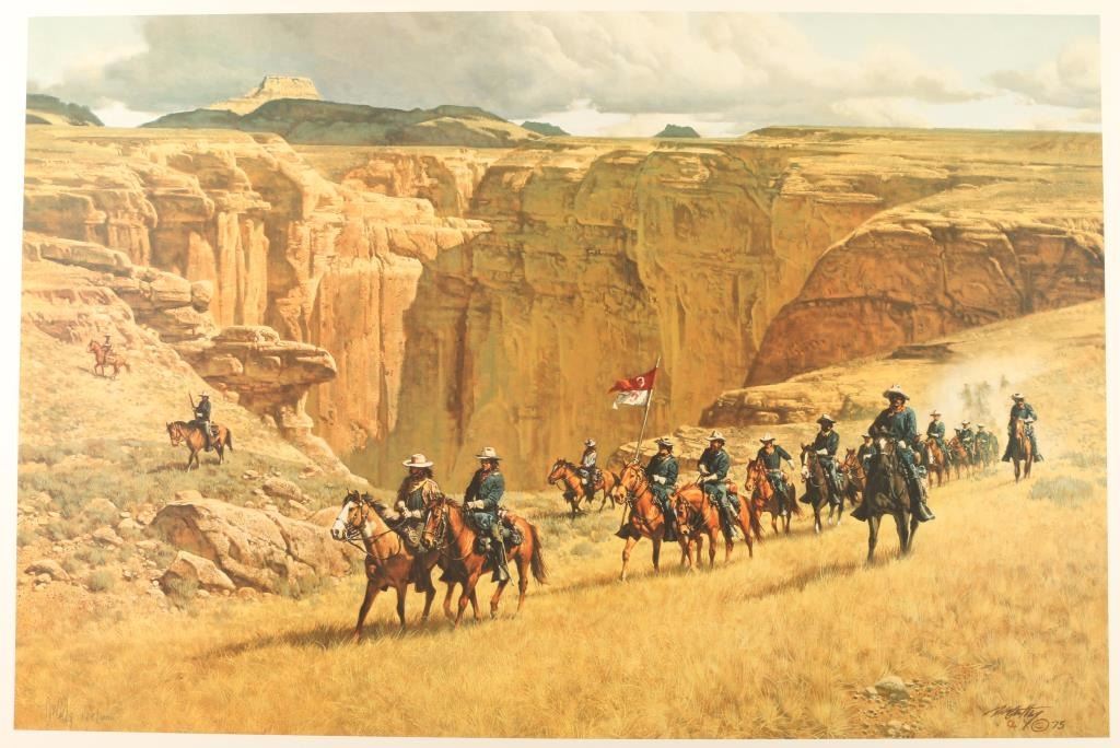 "The Long Knives" hand signed in pencil lower left 668/1000. Image measures 18"x27 1/4". Print only with information on the artist in a Greenwich Workshop folio. Frank McCarthy was born in New York City and was drawn to the West since he read Will James novels as a boy. He was also intrigued by N.C. Wyeth illustrations. Frank McCarthy's formal training was at the Pratt Institute and had a career in commercial art and as an illustrator. The lure of the West was strong and he eventually settled in Sedona, AZ and became a member of the Cowboy Artists of America. Frank has had several shows in prominent museums and his work has appeared in many national magazines.