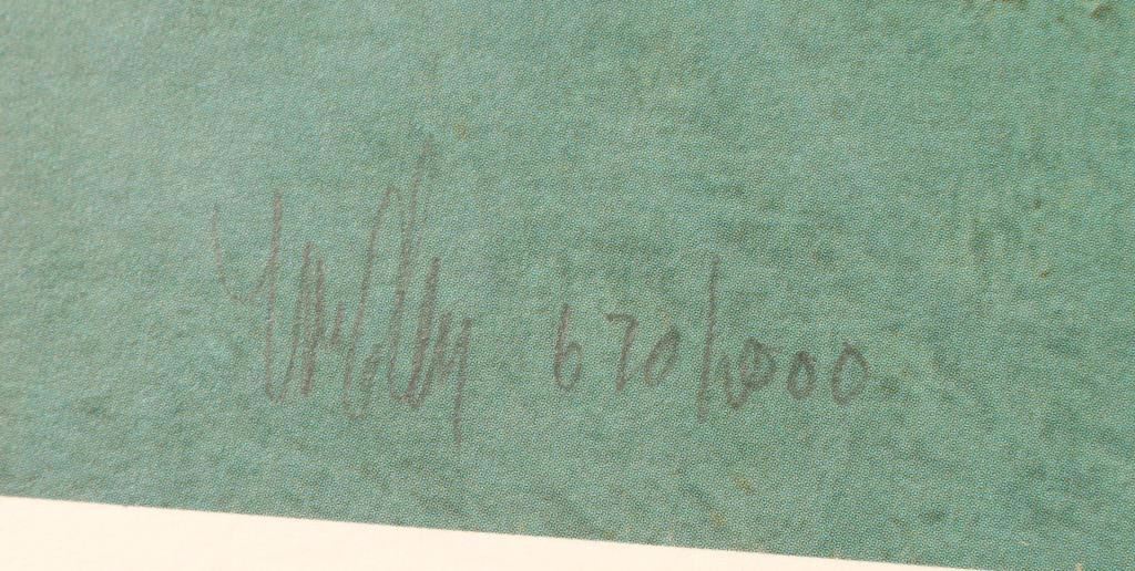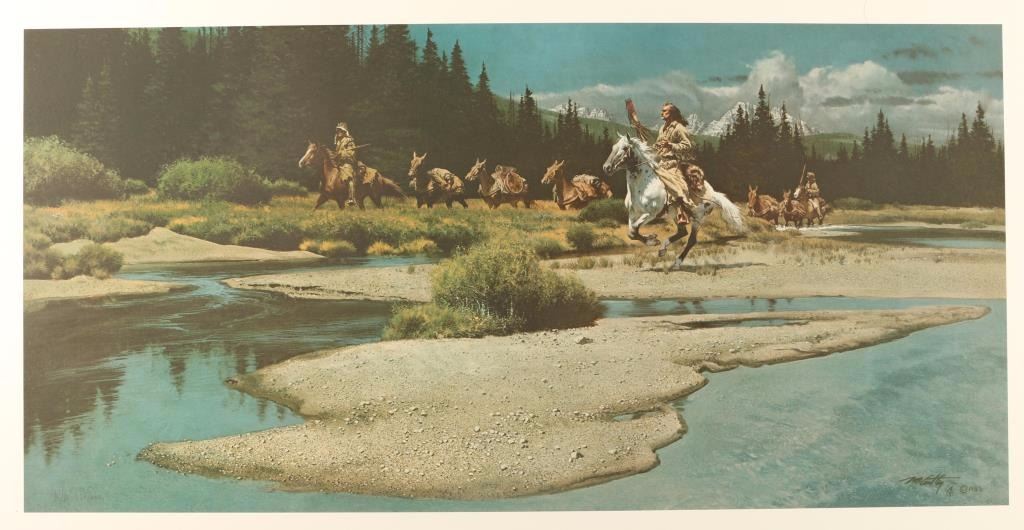 "In the Land of the Sparrowhawk People" 670/1000 hand signed lower left in pencil. Image measures 13 'x26 3/4". Print only with information on the artist in Greenwich Workshop folio. Frank McCarthy was born in New York City and was drawn to the West since he read Will James novels as a boy. He was also intrigued by N.C. Wyeth illustrations. Frank McCarthy's formal training was at the Pratt Institute and had a career in commercial art and as an illustrator. The lure of the West was strong and he eventually settled in Sedona, AZ and became a member of the Cowboy Artists of America. Frank has had several shows in prominent museums and his work has appeared in many national magazines.