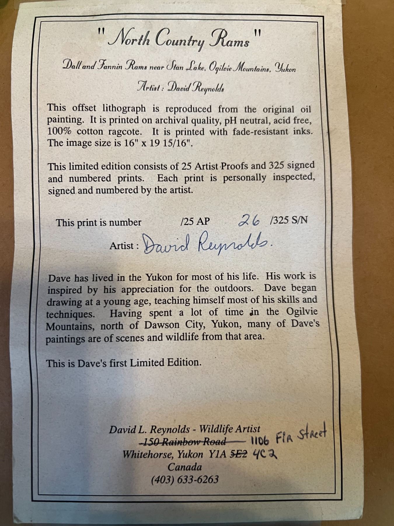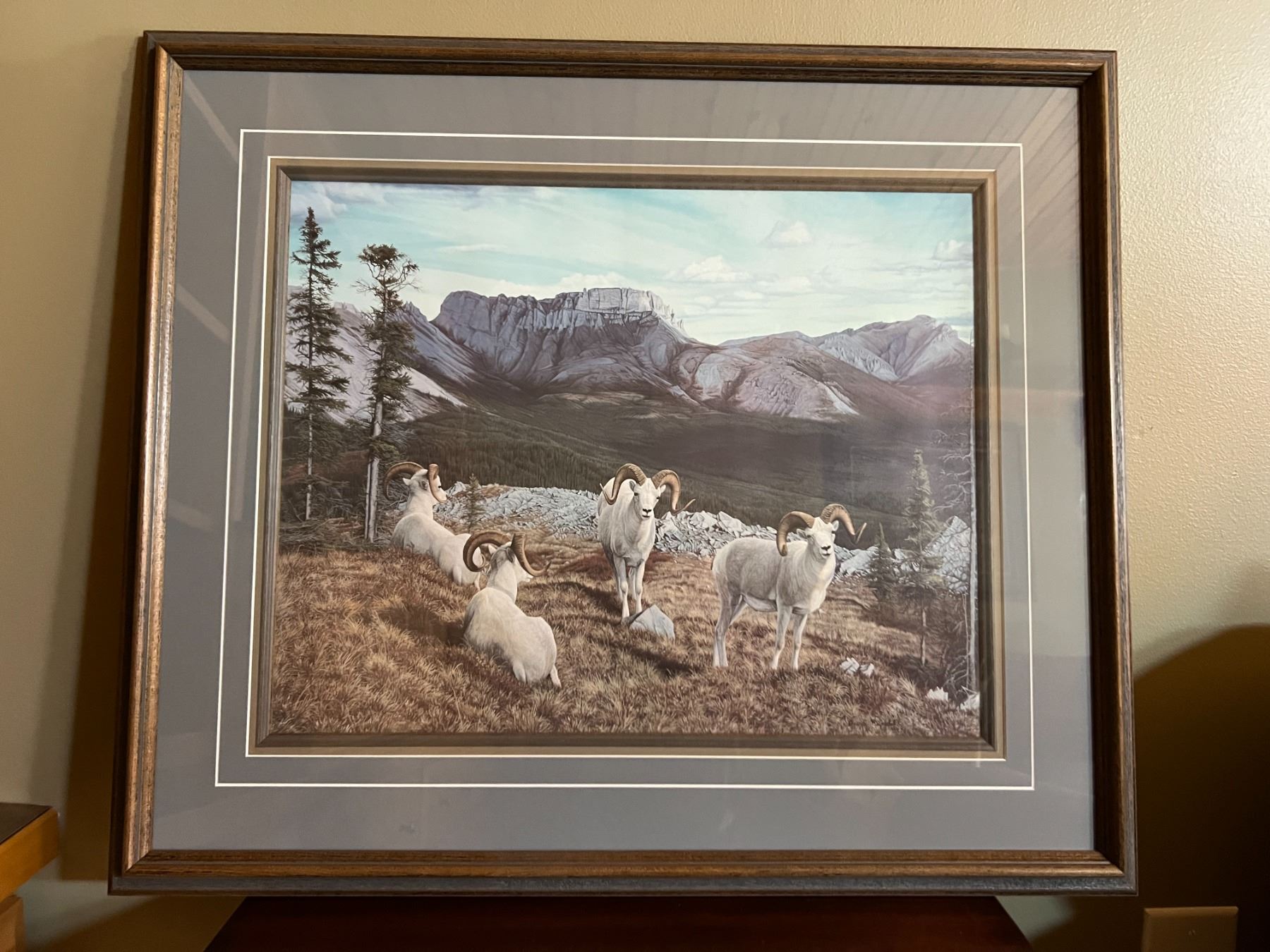 For hunters that have ever hunted with the Reynolds, this picture painted by Dave shows a familiar sight looking up toward Stan Lake from their Sheep Mountain camp in the middle of their Yukon area depicting four rams both Dall’s and Fannin’s.