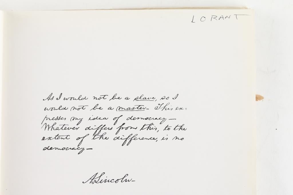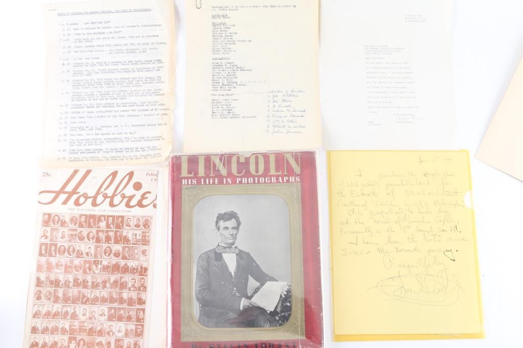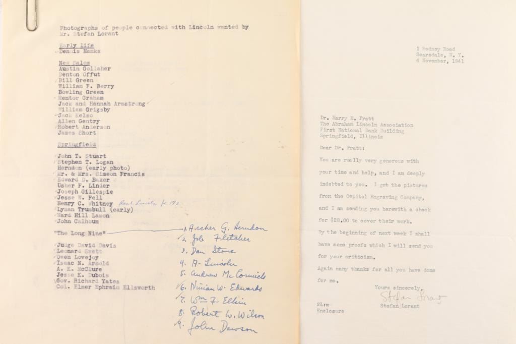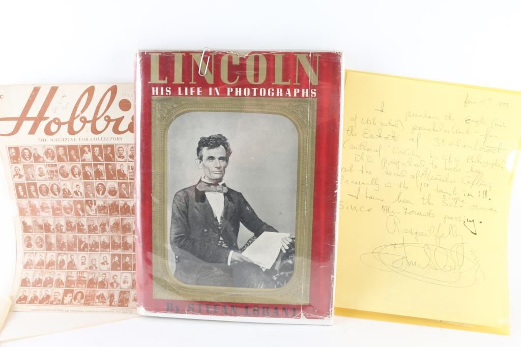 Book by Stefan Lorant. Rare 1941-1st Edition. His copy with name on fly page with signed statement by Philip Harry stock dated June 15, 1999, stating "I purchased the Eagle (made of White Metal) perched on a branch from the Estate of Stephan Lorant, author of "Lincoln His Life in Photographs." It is purported to have been at the head of Lincoln's coffin presumably in the first tomb in Illinois. "I have been the sole owner since Mr. Lorant's passing. Respectfully," signed by Philip Harry Stock, along with three other letters to Harry Pratt of Abraham Association concerning requested photographs and other information on Lincoln's photos compiled by Lorant. Invaluable information to the owner of the white metal eagle with branch sold by Little John's Auction Branch in 2016.