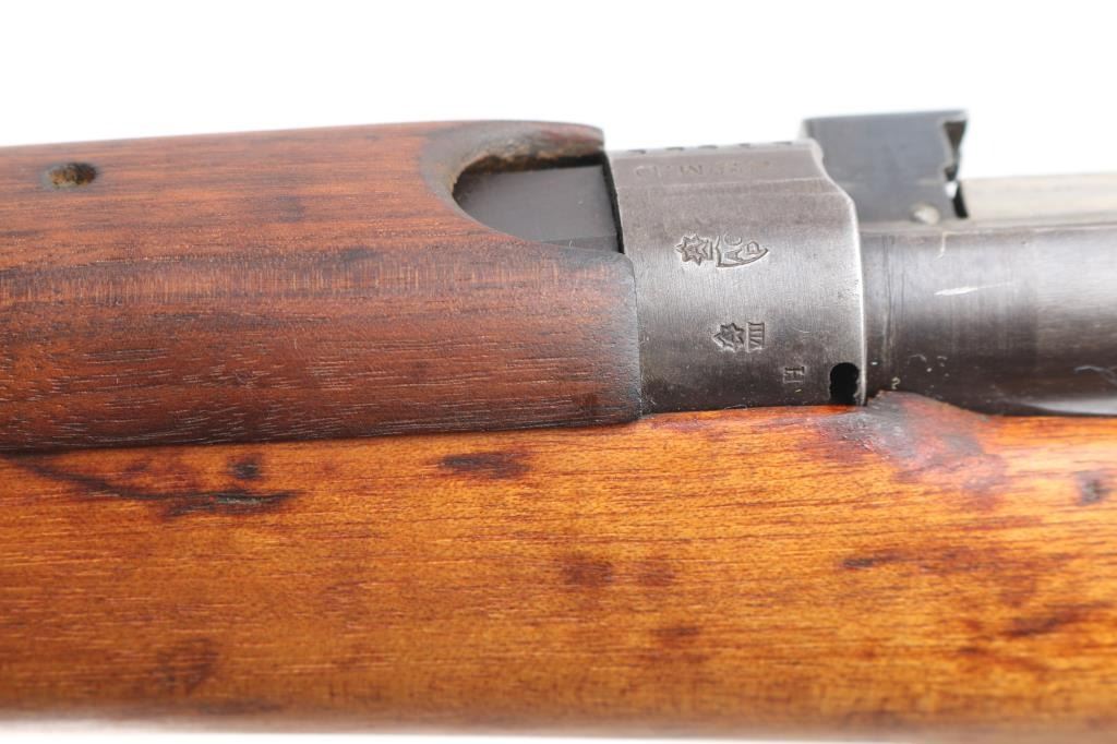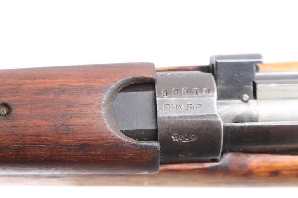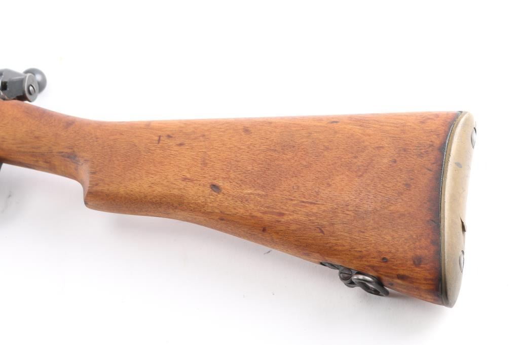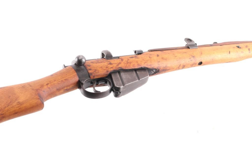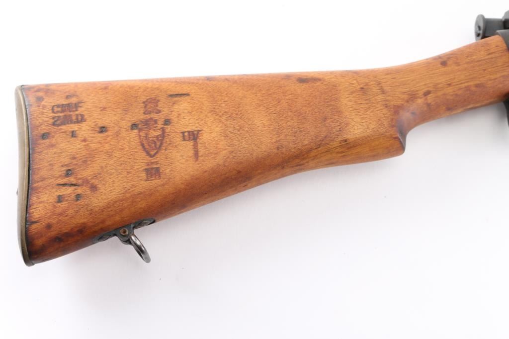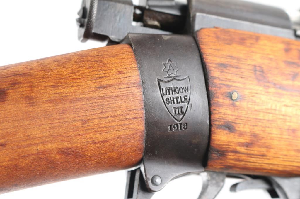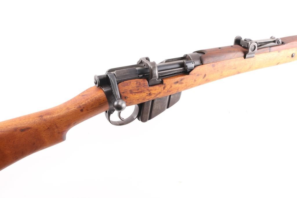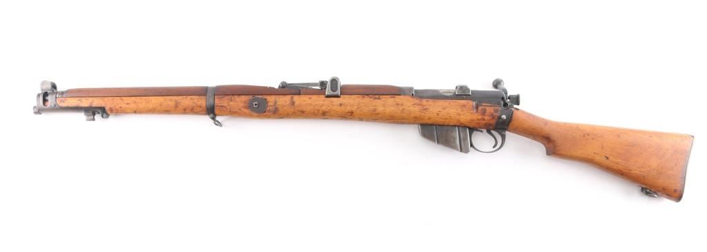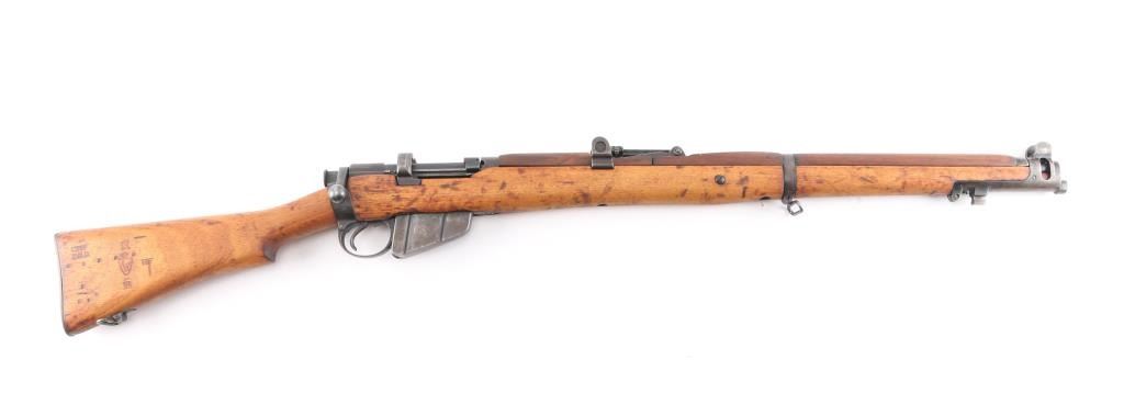 SN: 98633/61285. Australian British Commonwealth WW1 military bolt action rifle dated 1918. Arsenal refurbished. Stock marked "2MD", and chamber marked "2nd MD" (2MD - 2nd Military District, was in essence, the state of New South Wales). Features 25" barrel, nosecap with bayonet lug, protected sight ears, post front sight, adjustable rear tangent sight with protective ears, 10 round detachable magazine, stripper clip guide bridge, manual safety, sling swivels, two piece wood stock with straight grip, brass buttplate with trap door storage compartment. Volley sights removed, disc scrubbed. Right stock collar marked " A" in star over shield containing "Lithgow SHT. LE III* with "1919" under it. Matching serial numbers on receiver, bolt handle, and nose cap. Bore is excellent/bright, with strong rifling. Metal finish is very good , mostly there, bare metal where bolt rubs during operation, and on some sharp edges. Wood is very good, appears to have been lightly sanded, leaving the marking feint, but readable Wood to metal fit is very good and wood is solid condition. Small. feint JJ Co. (John Jovino) importer marks on right charging bridge. Right butt stock has the "A (Kangaroo) C in a shield, 2MD, HV , CMF, and III* cartouche. HV-High velocity, III*-magazine cut-off, and stock disc deleted from design. CMF-Citizen Military Forces