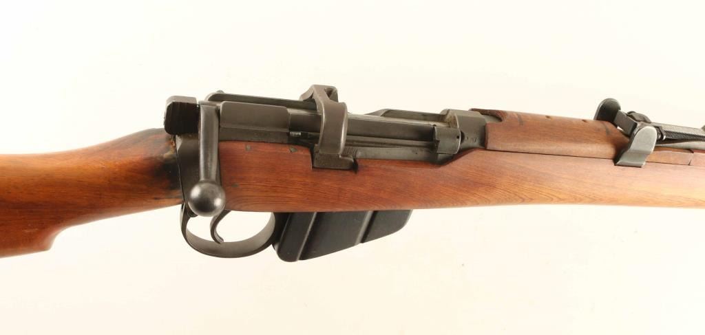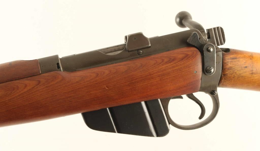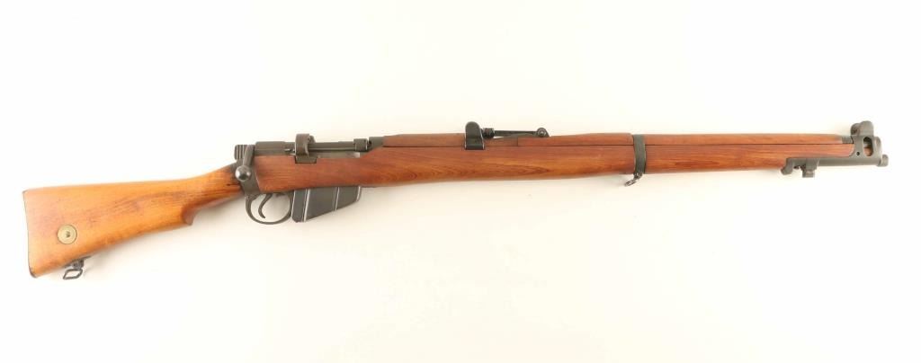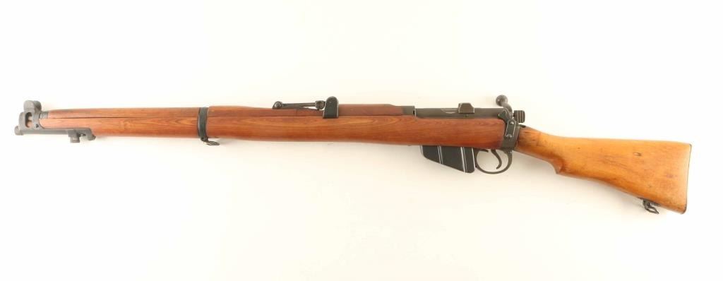 Australian military bolt action rifle dated 1941. Features 25" barrel, bayonet lug, protected post front sight, adjustable rear tangent sight with protective ears, detachable magazine, stripper clip bridge, manual safety, sling swivels, two piece wood stock with straight grip, brass buttplate with trap door storage compartment. Nosecap is a variant lacking any provision for a stacking swivel. Bore is very good condition, with strong rifling. Metal has 85% coverage of medium brownish-gray parkerizing on action & barrel, blued bands & nosecap turning brown, magazine retaining a grayish blue, small indications of rust on bottom edges of magazine, bare metal where bolt rubs during operation, and on some sharp edges. Wood appears lightly sanded, with discoloration in a few places at butt. Wood to metal fit is very good and wood is solid condition. Butt appears about one inch shorter than usual ("short" length part is installed), is a bit loose to receiver, has a blank unit marking disc in right side. No importer marks observed. Condition is NRA Very Good (as reworked) *** C&R Firearm ***
