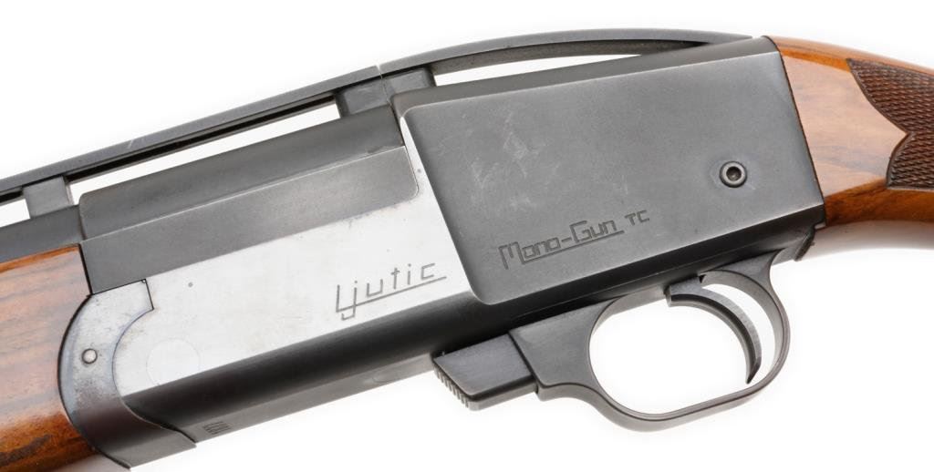 Ljutic “Monogun” single BBL 12 GA trap shotgun, S/N 1877. 34” BBL, vent rib, full choked, trap stock and ported barrel. Shows some use but at least very good plus overall. 90% finish. 14 ½” pull. Replacement approximately $7,800. Est.: $2000-$4000
