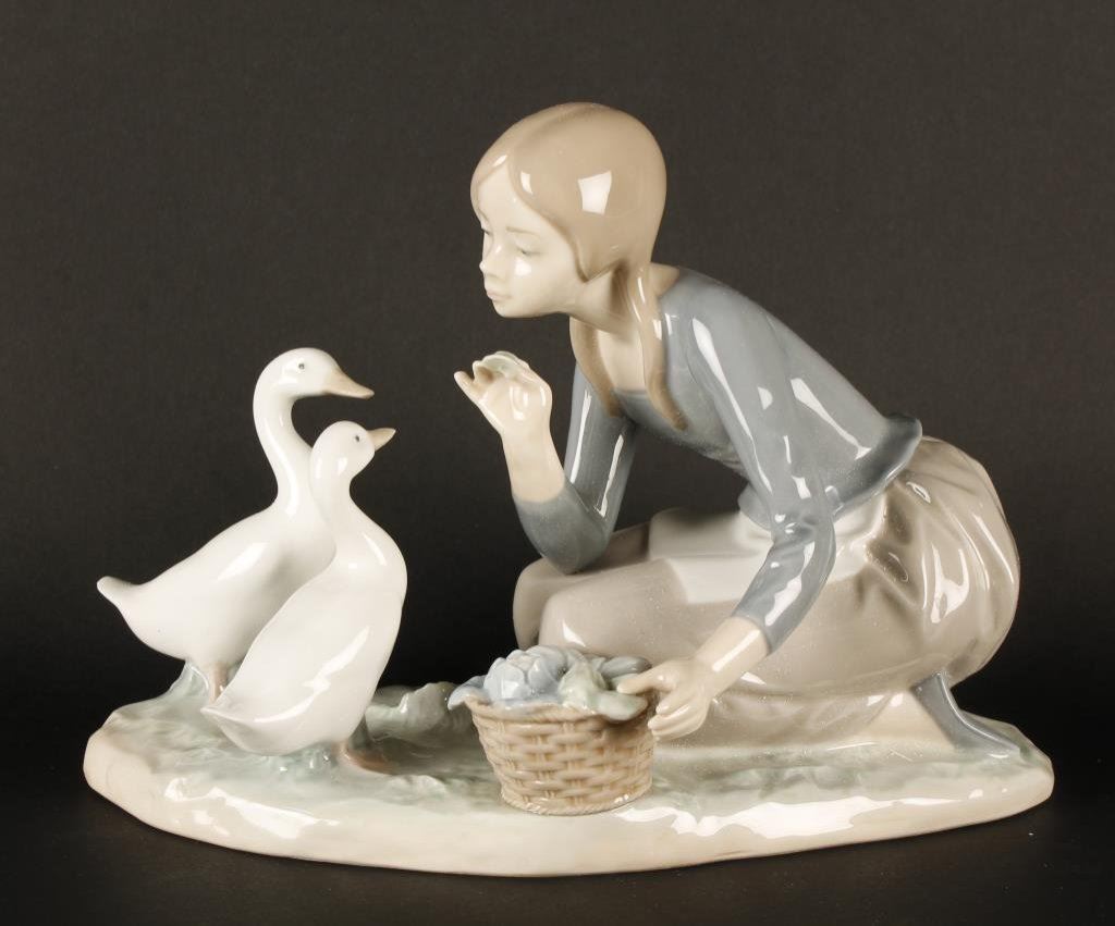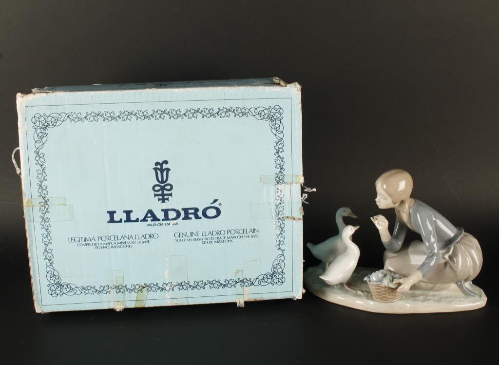 Lladro figure of a young woman and two ducks, approximately 6” tall and 9” long; entitled “Feeding the Ducks”; overall fine condition at time of description with factory cardboard box. Est.: $150-$250.