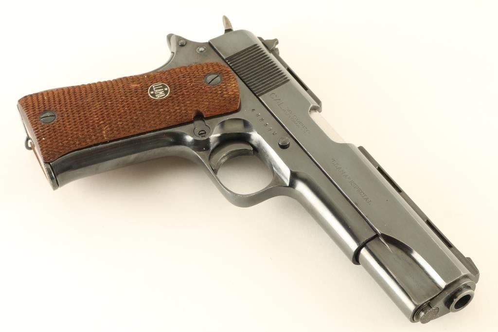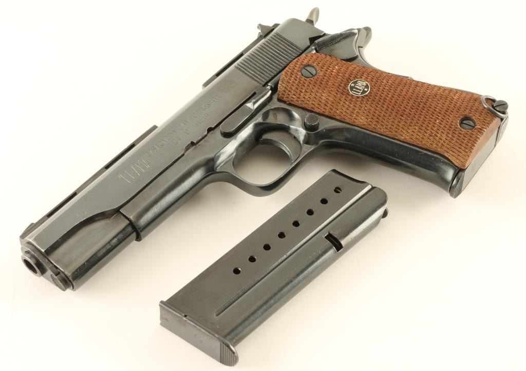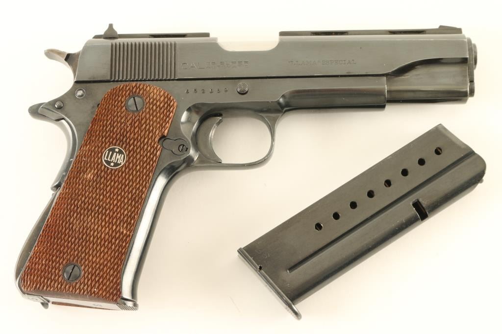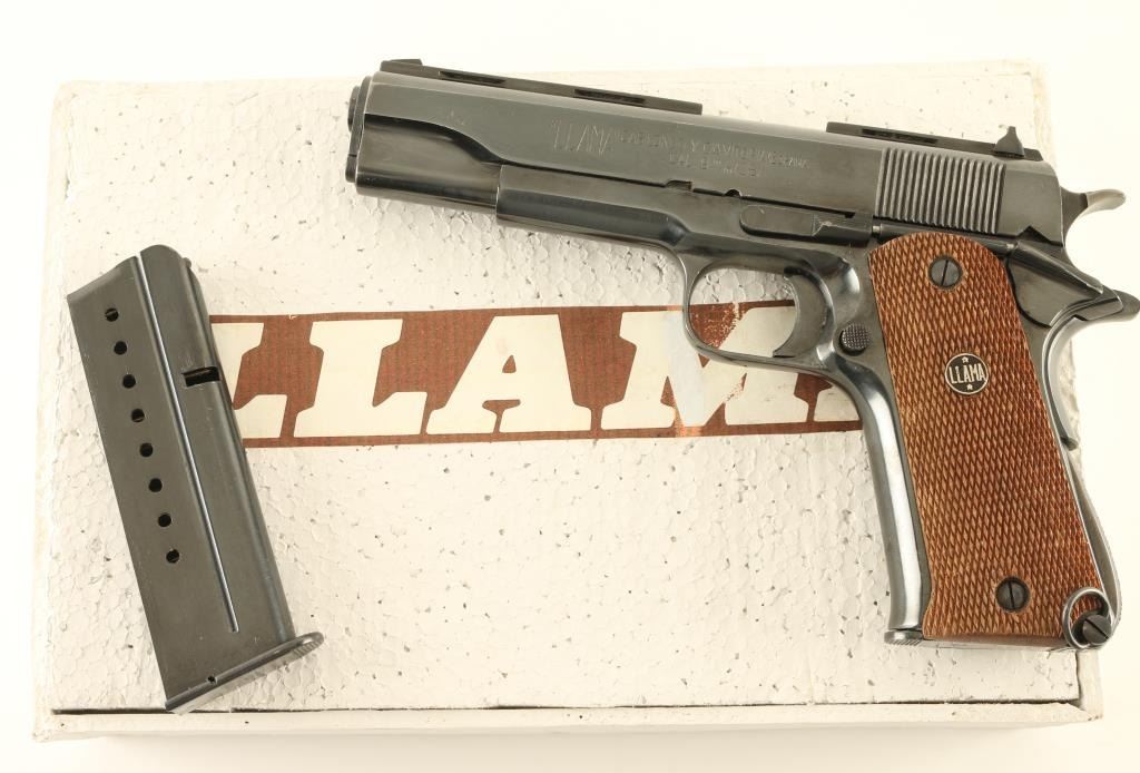 Spanish semiautomatic pistol features blued finish, checkered wood grips with "LLAMA" medallions, single action trigger, 5" barrel, fixed sights, frame mounted manual safety, grip safety, lanyard ring at butt. Bore is excellent. Retains 90% dark blue with many small scratches, bare metal at sharp edges. Grips are very good condition. No import marks observed. Includes factory box and spare magazine (2 total). Condition is NRA Very Good+ *** C&R Firearm ***