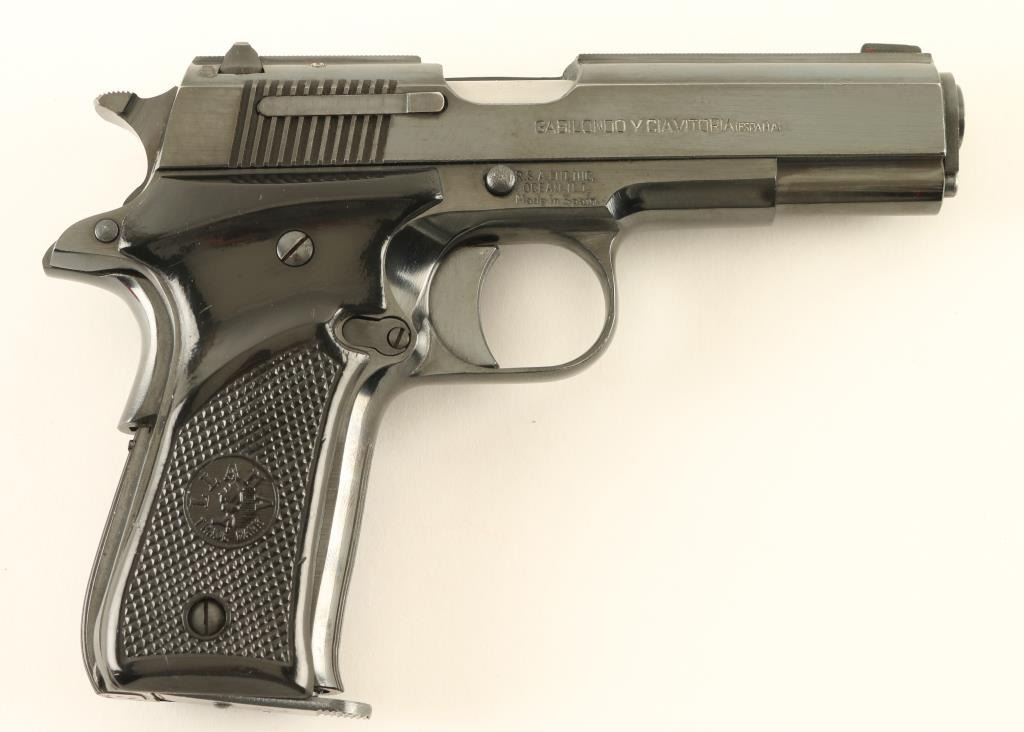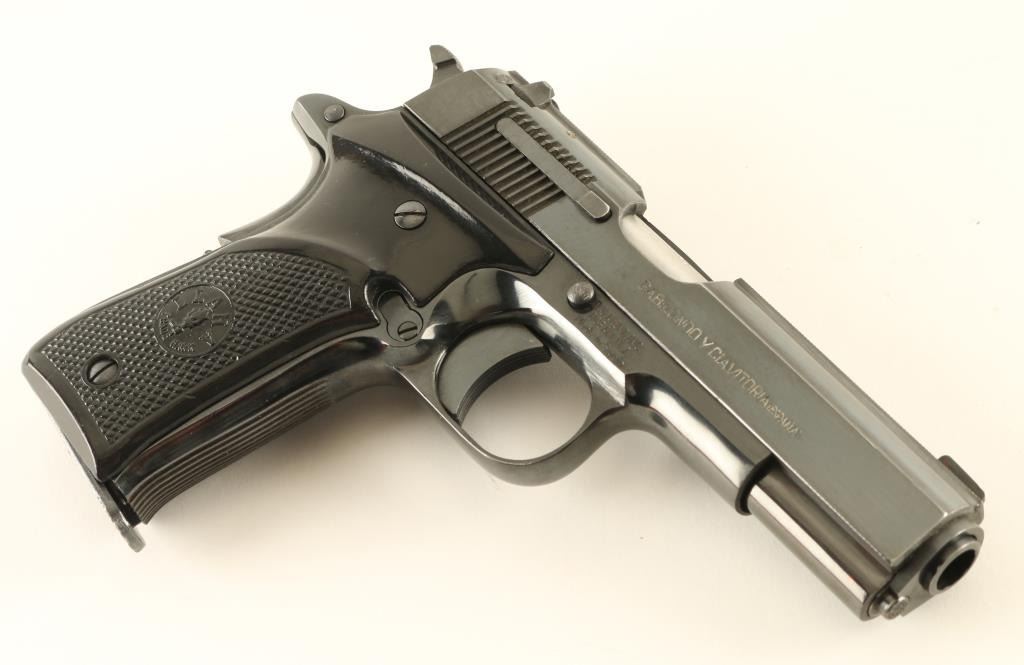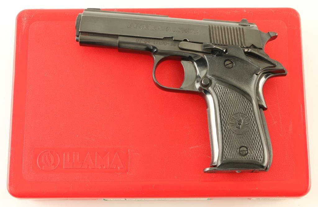 Spanish semiautomatic pistol imported by R.S.A. ENT, INC, Ocean NJ. Features blued finish, checkered black plastic grips with "LLAMA" logo and thumb rest, single action trigger, 3.75" barrel, fixed sights, frame mounted manual safety, grip safety. Bore is excellent condition. Retains 95% blue with scratches, signs of handling. Grips are very good condition. Includes one magazine and red plastic factory box. Condition is NRA Very Good+ *** Modern Firearm ***